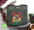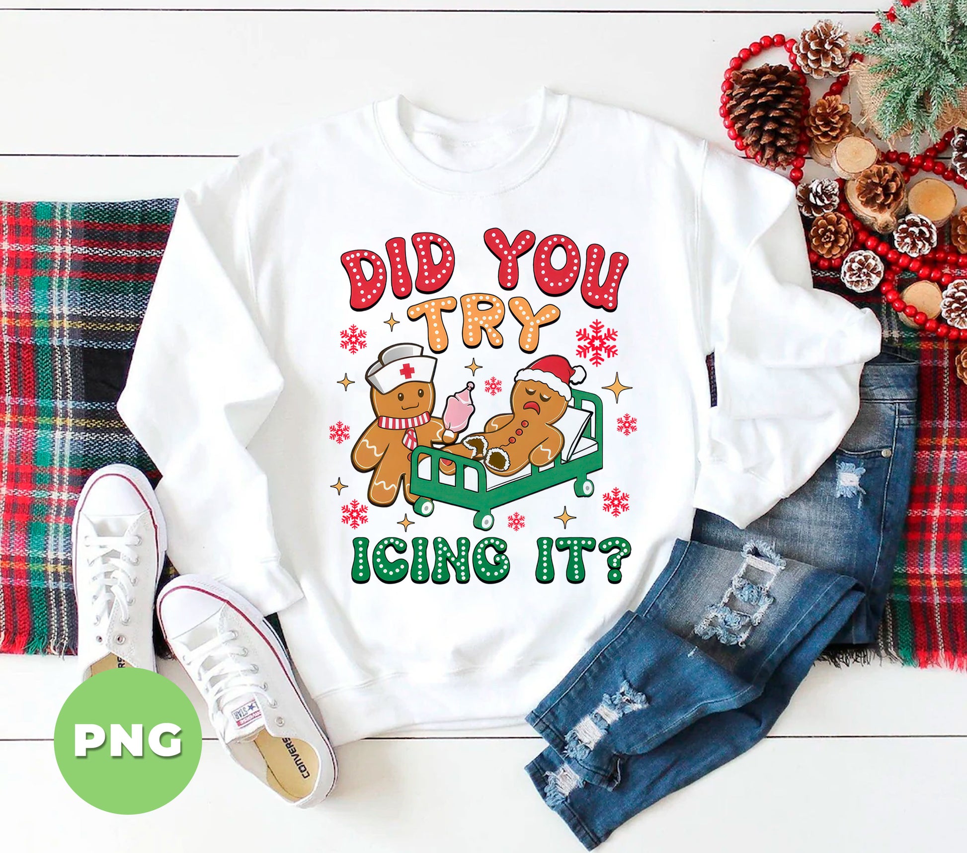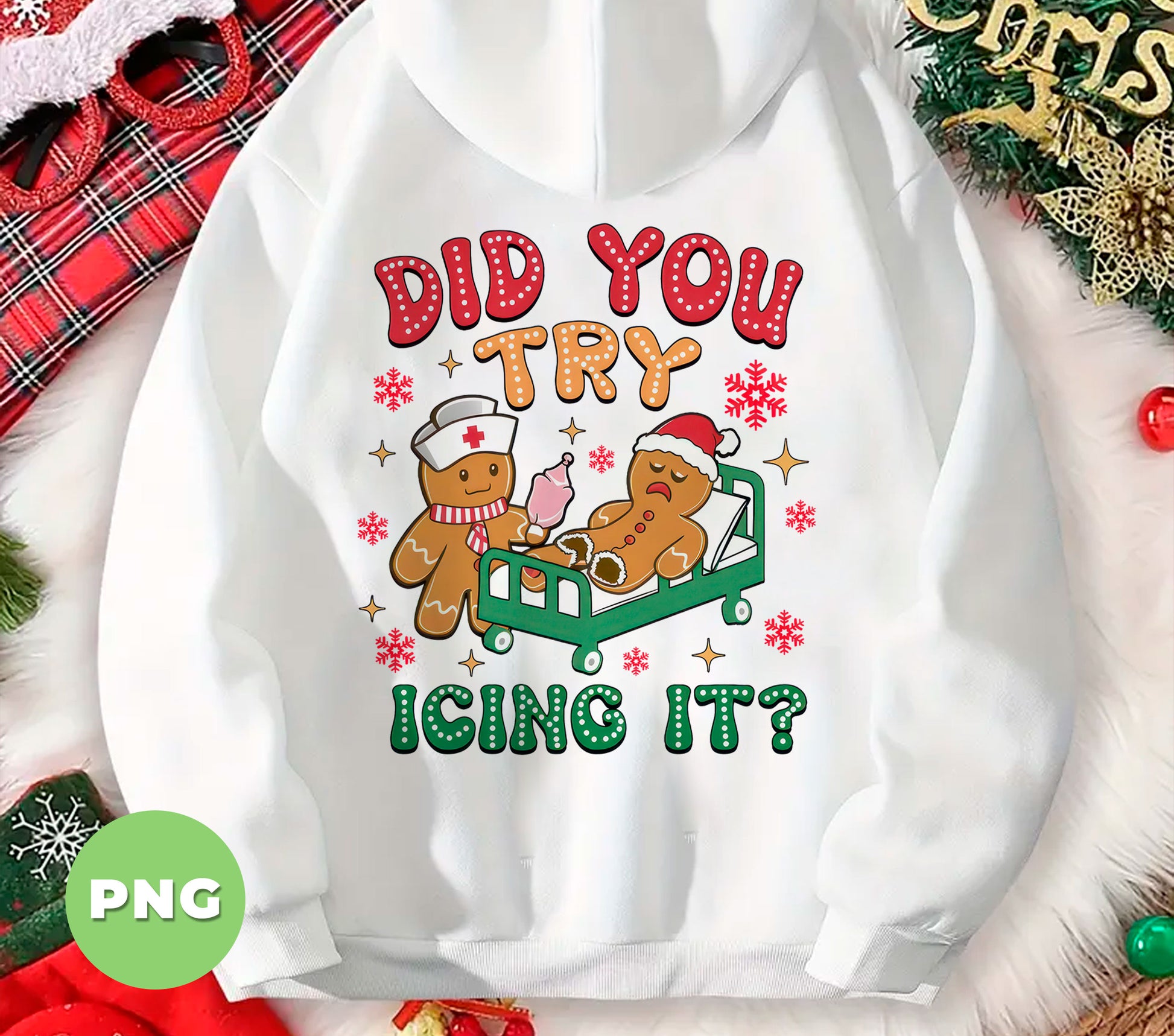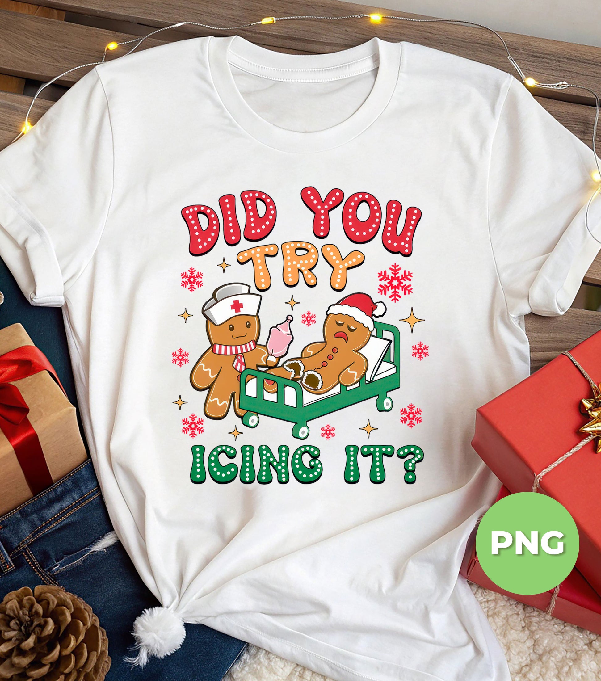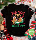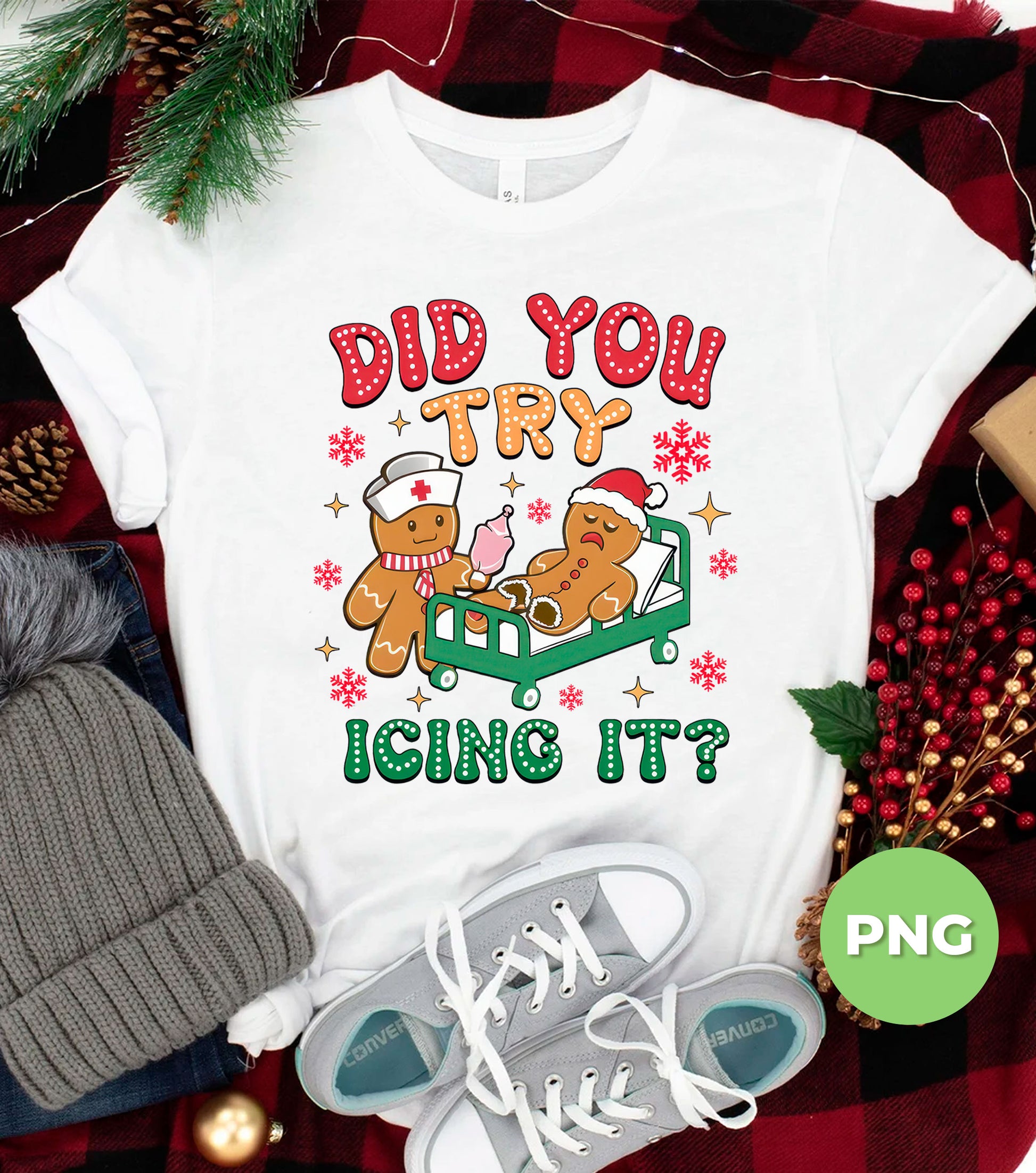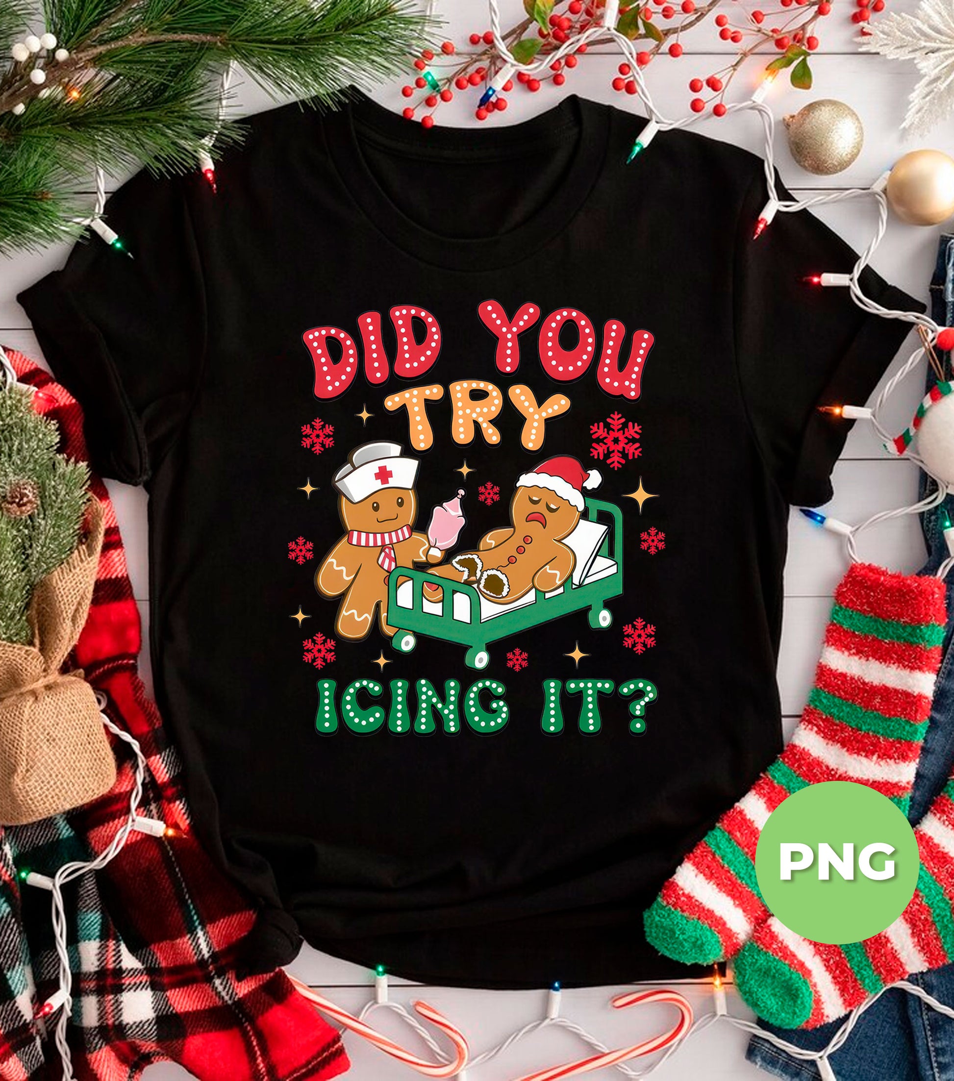 Celebrate the holiday season with a playful twist using this "Did You Try Icing It" PNG featuring a funny nurse gingerbread character. Perfect for sublimation projects and adding a dose of nurse humor to your Christmas crafts. This cute holiday cookie clipart brings festive cheer and smiles, making it an ideal design for cards, gifts, or decorations that spread merry vibes with a lighthearted punch.