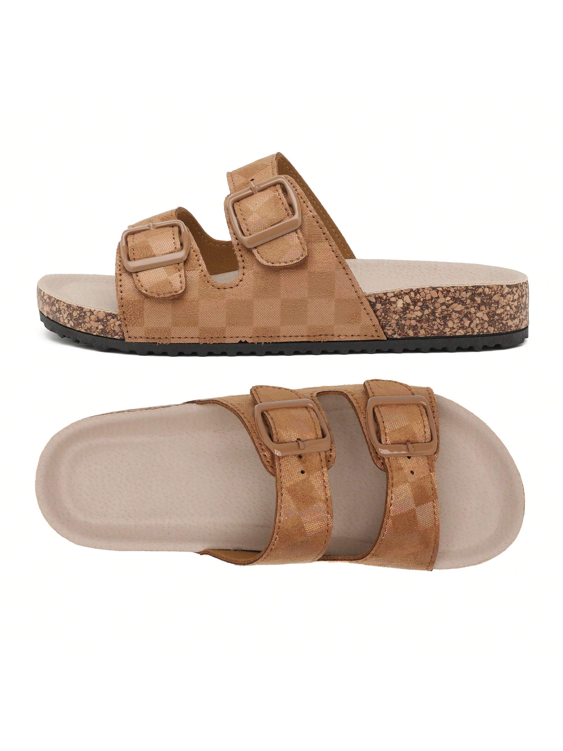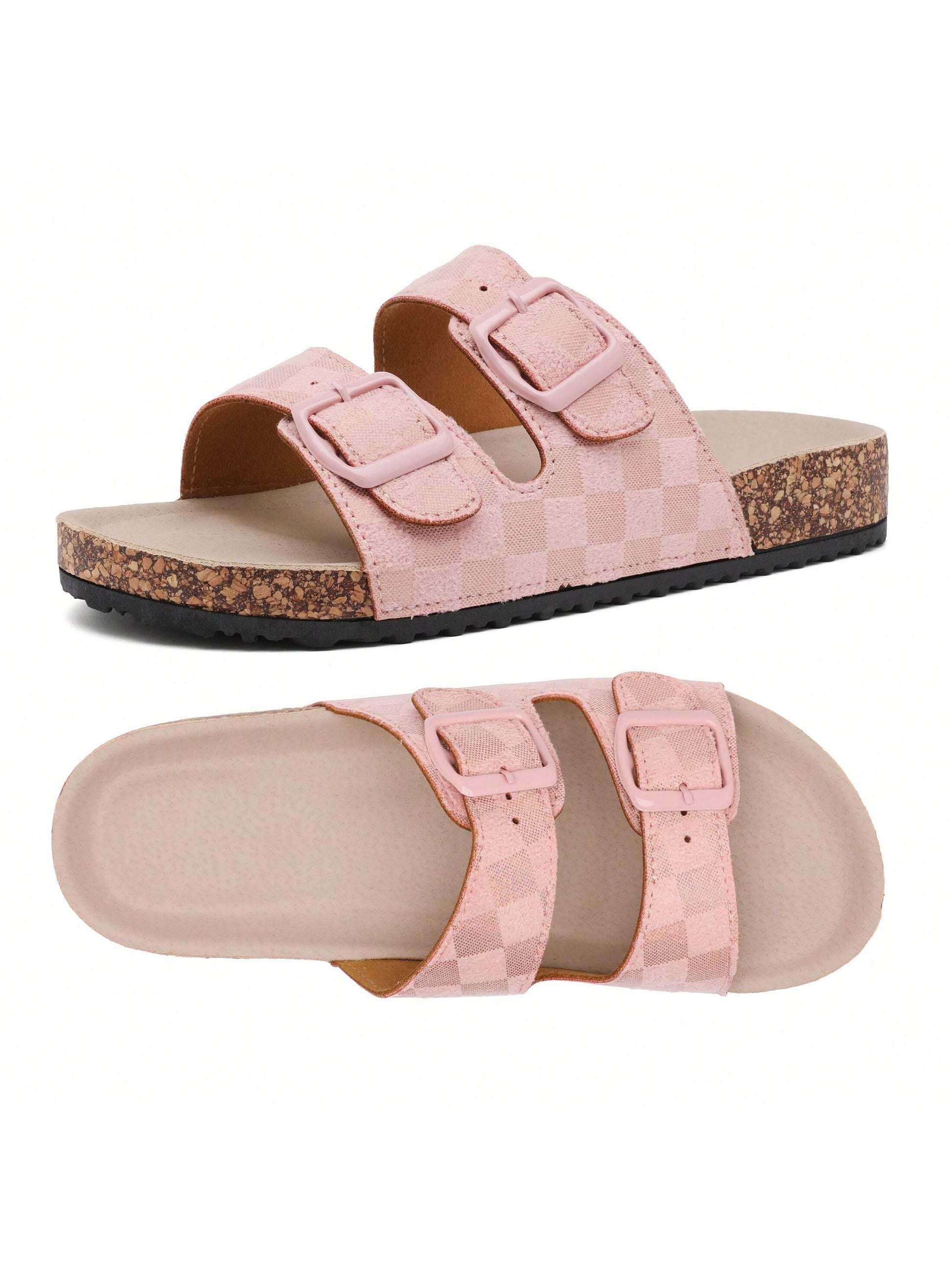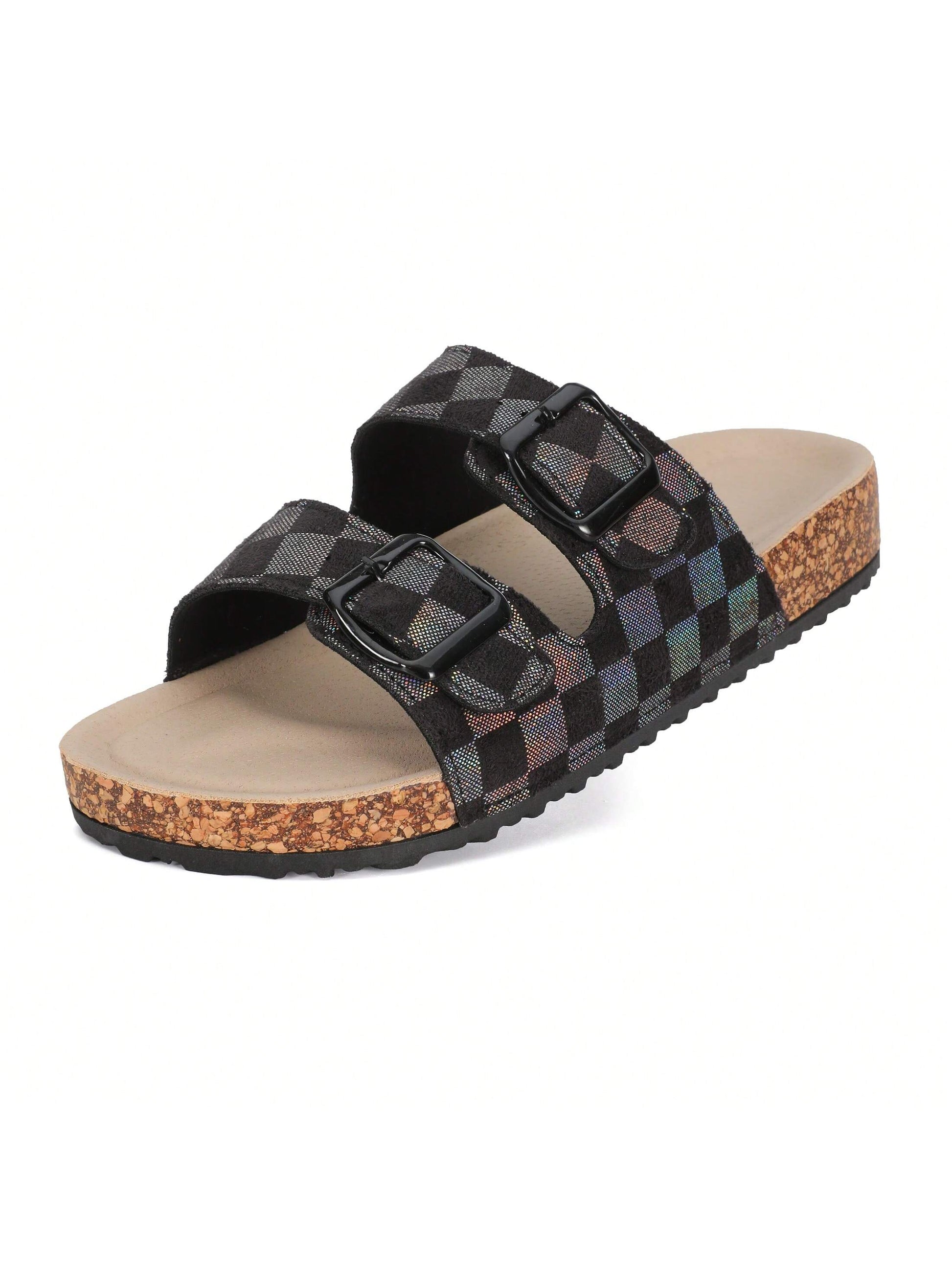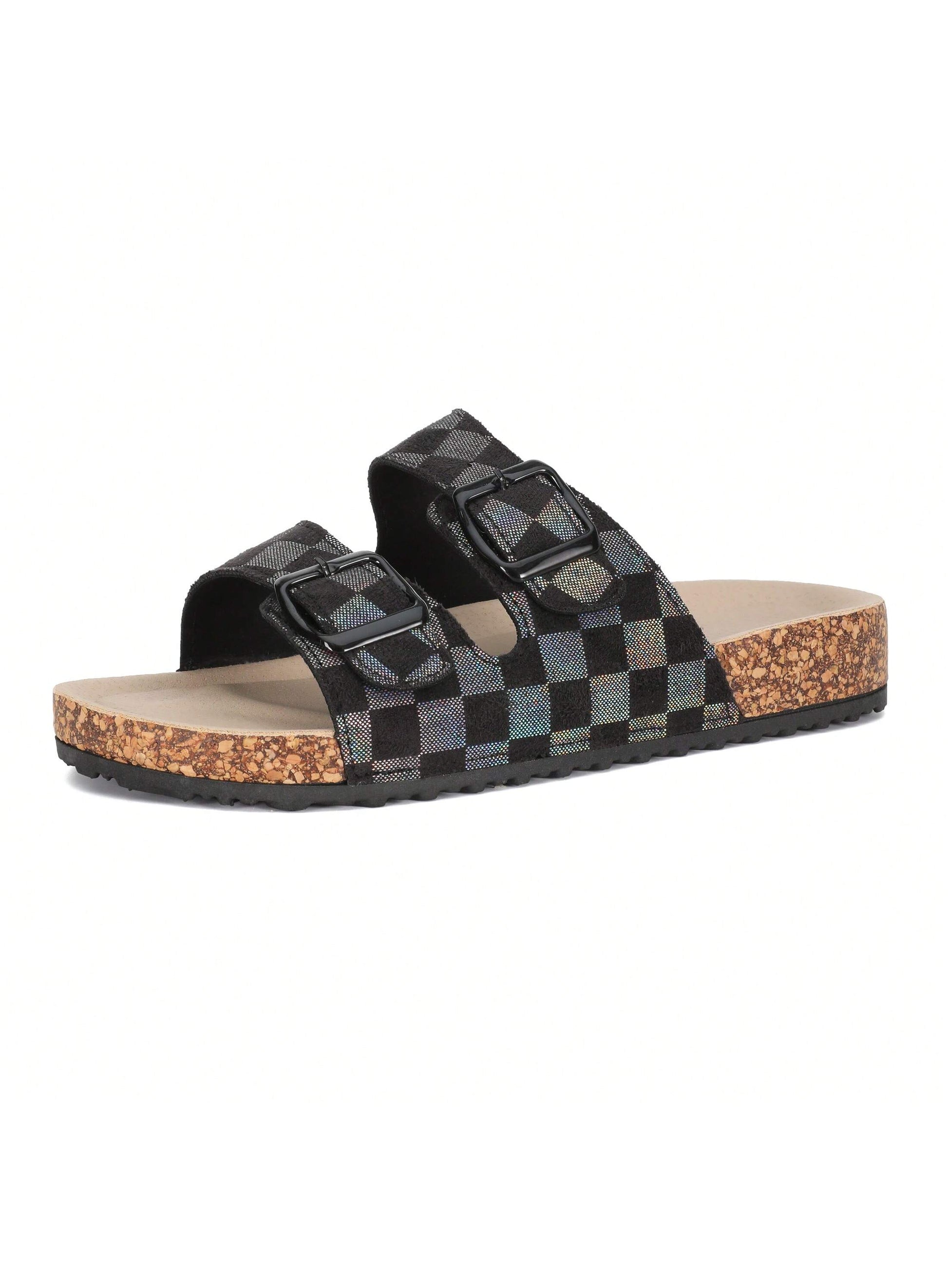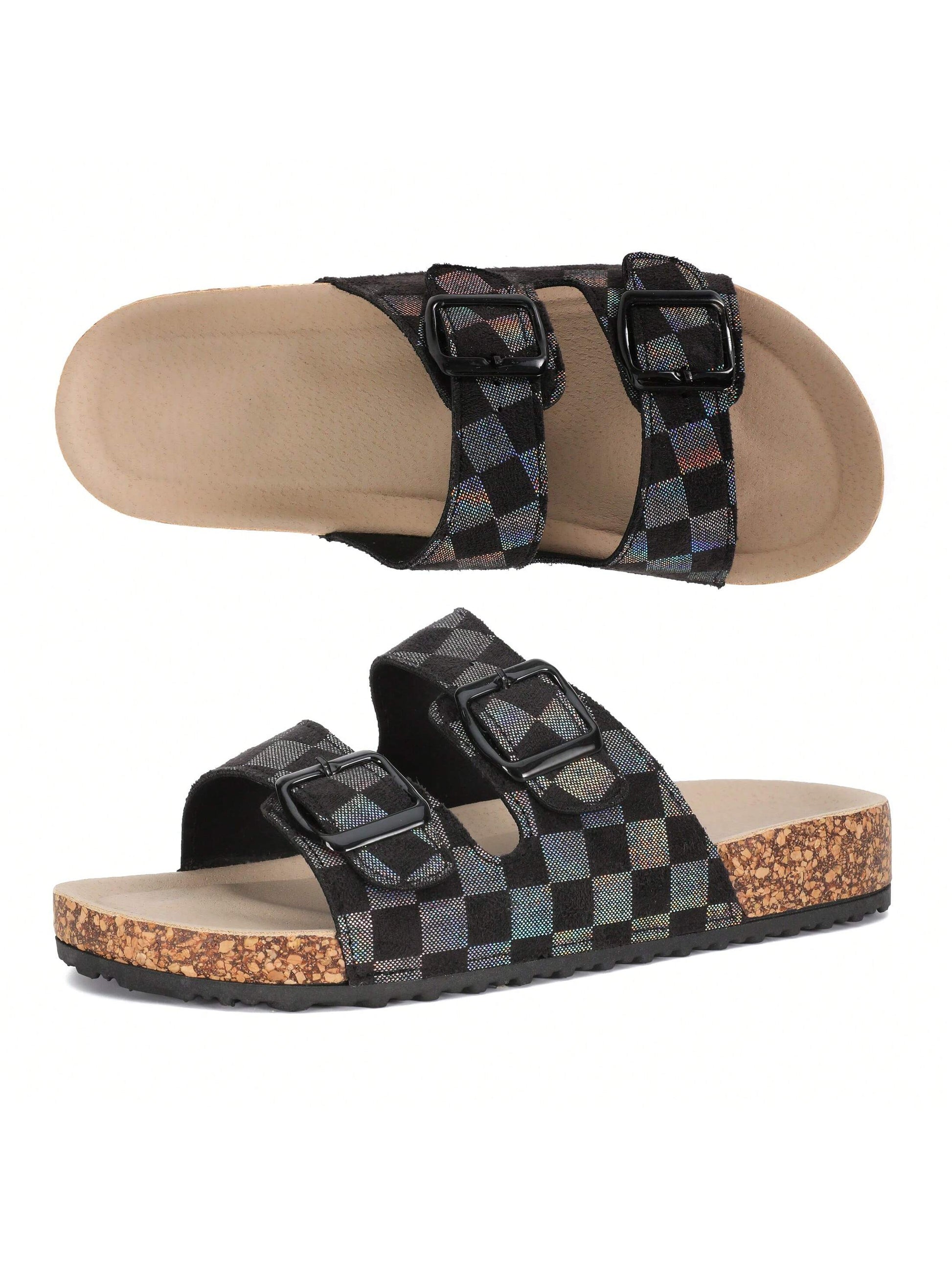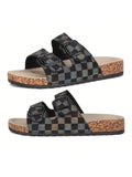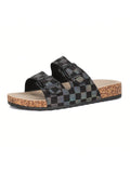 Dreamy Checkered Flatform Slides: Double Buckle Comfort with Nature-Cork Footbed