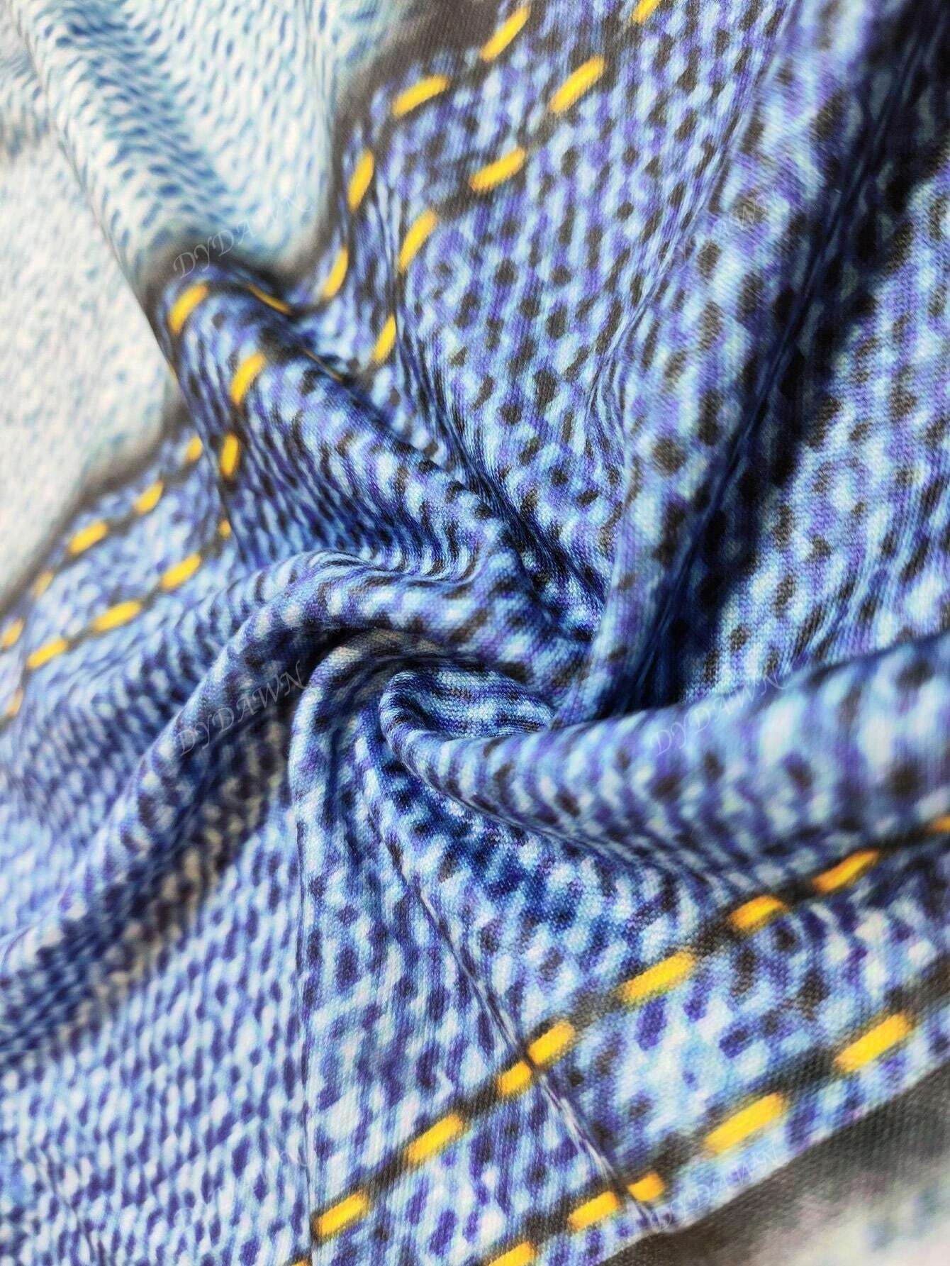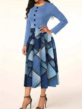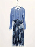 Dusty Blue Denim Print Patchwork Dress: Effortlessly Chic Long Sleeve Style