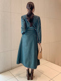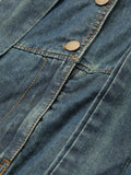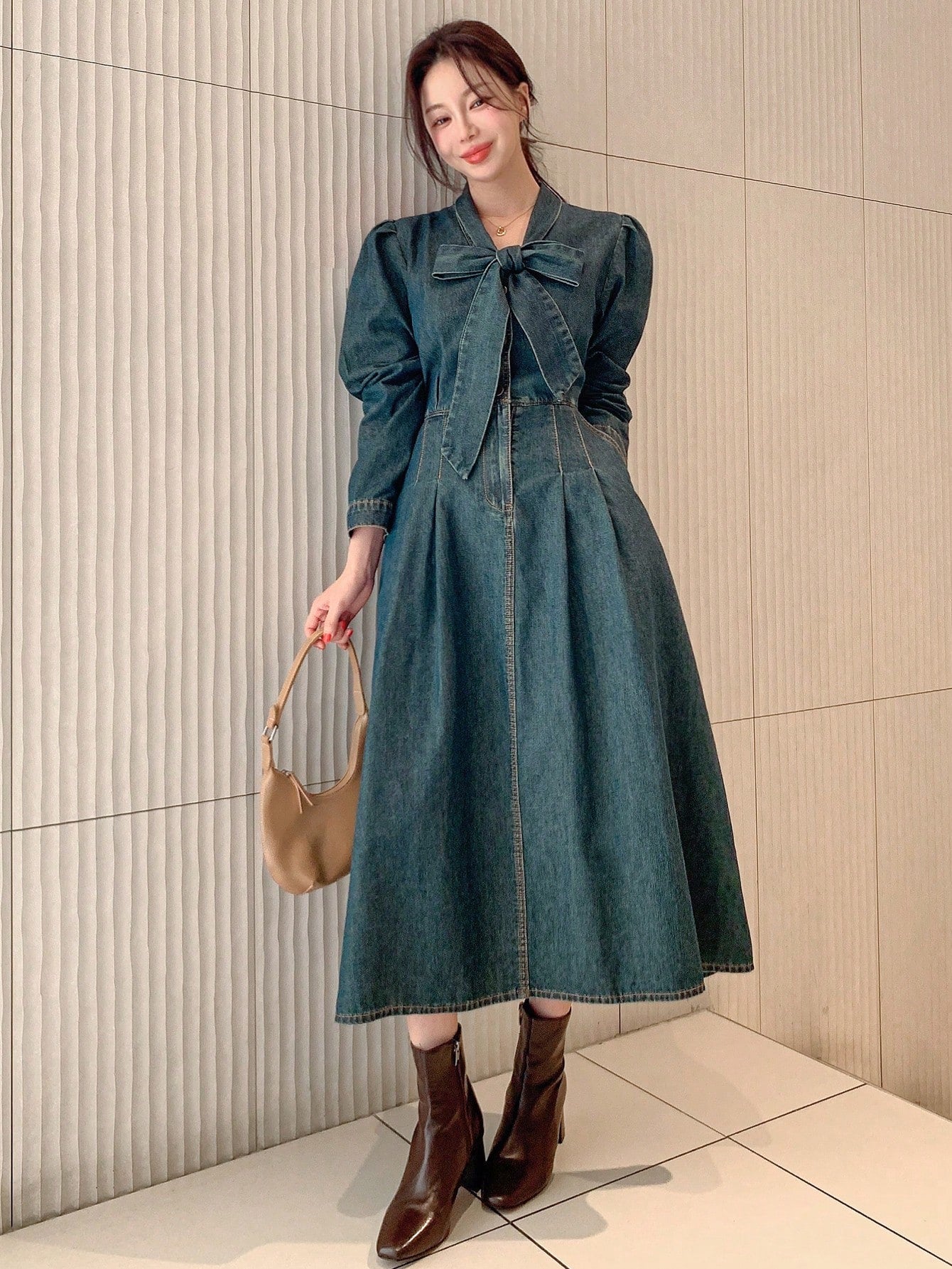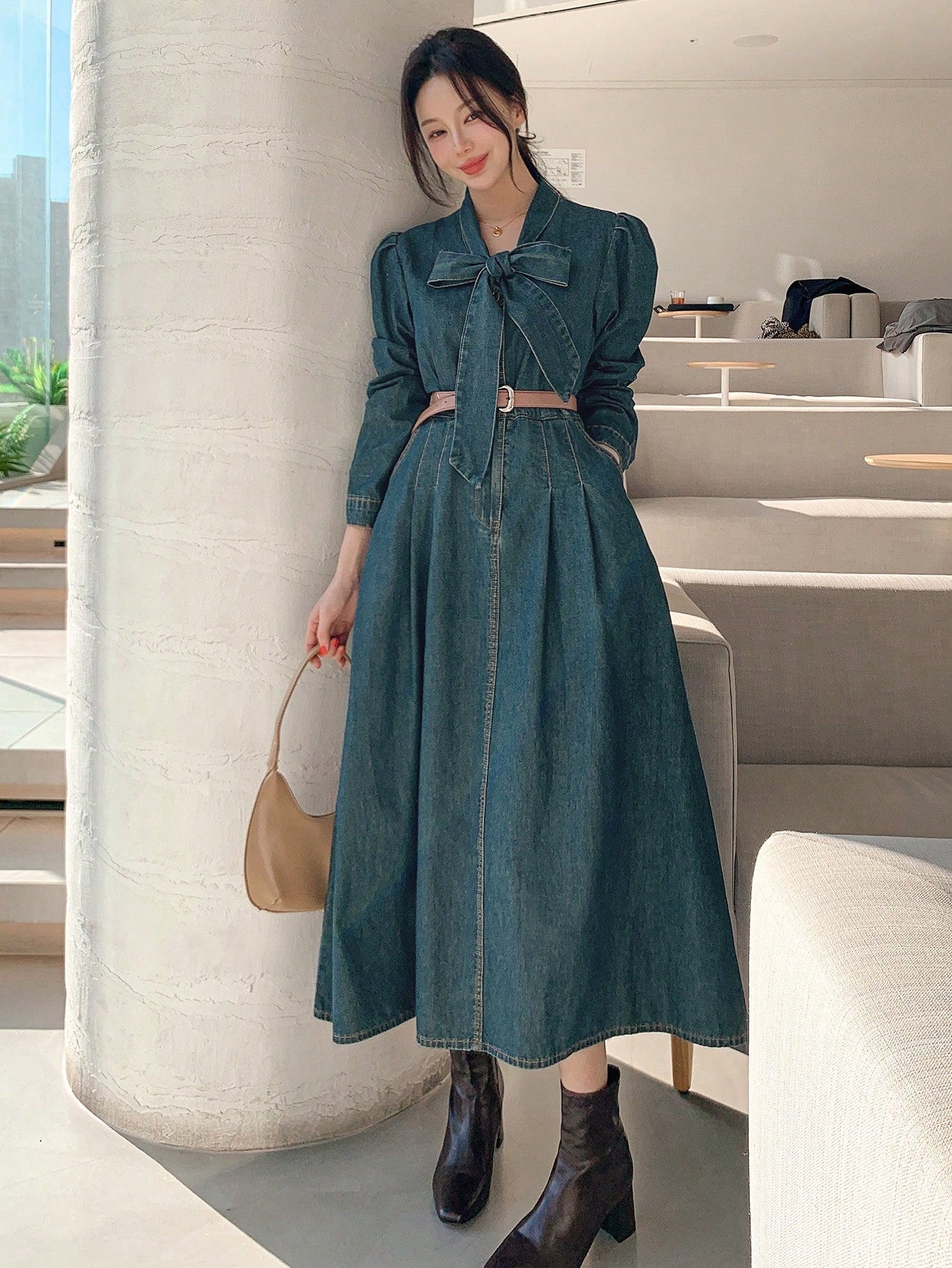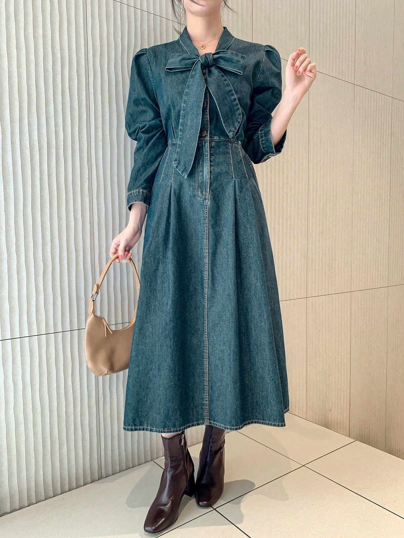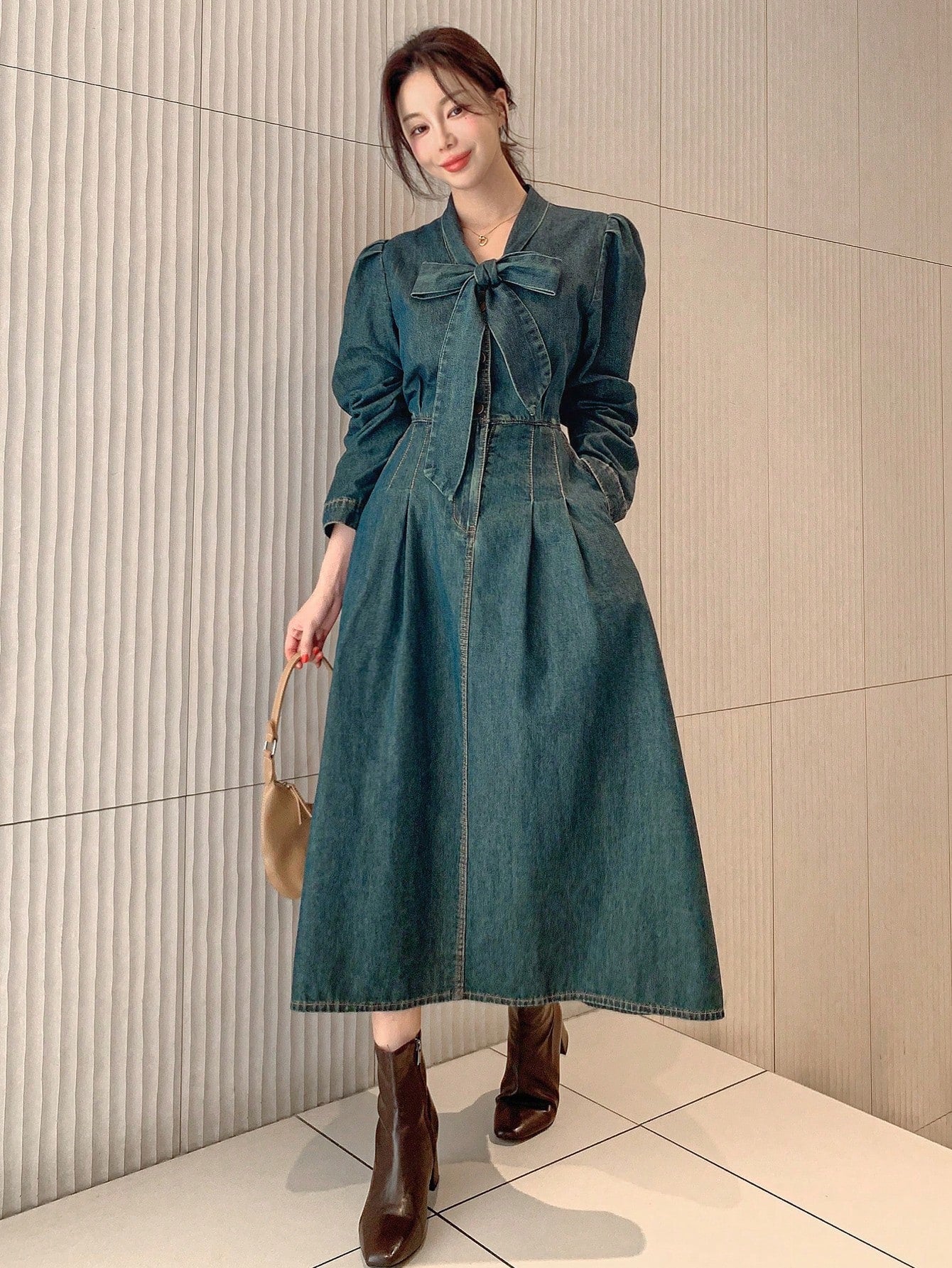 Effortlessly Chic: Women's Long Sleeve Pleated Tie-Neck Denim Dress