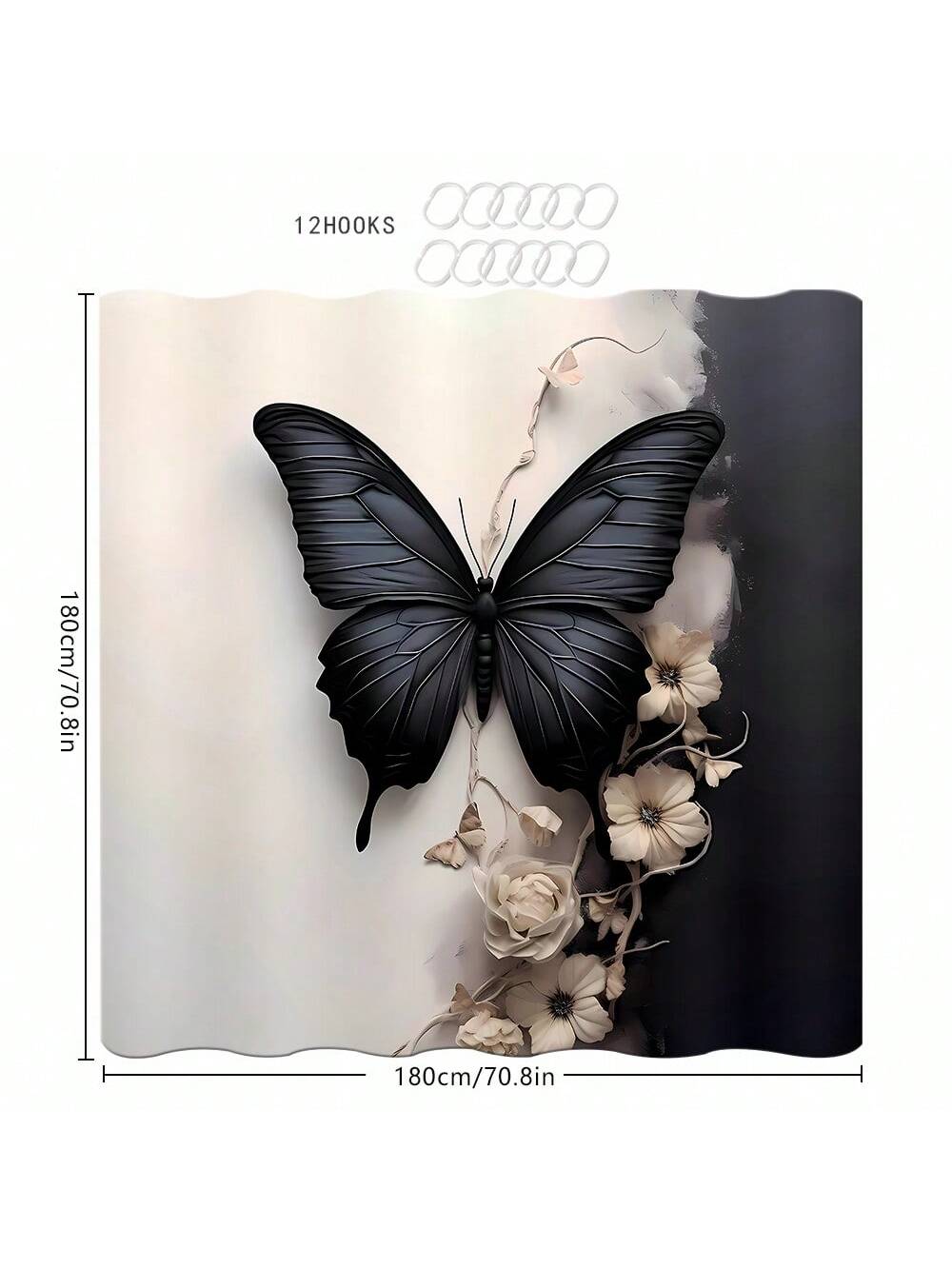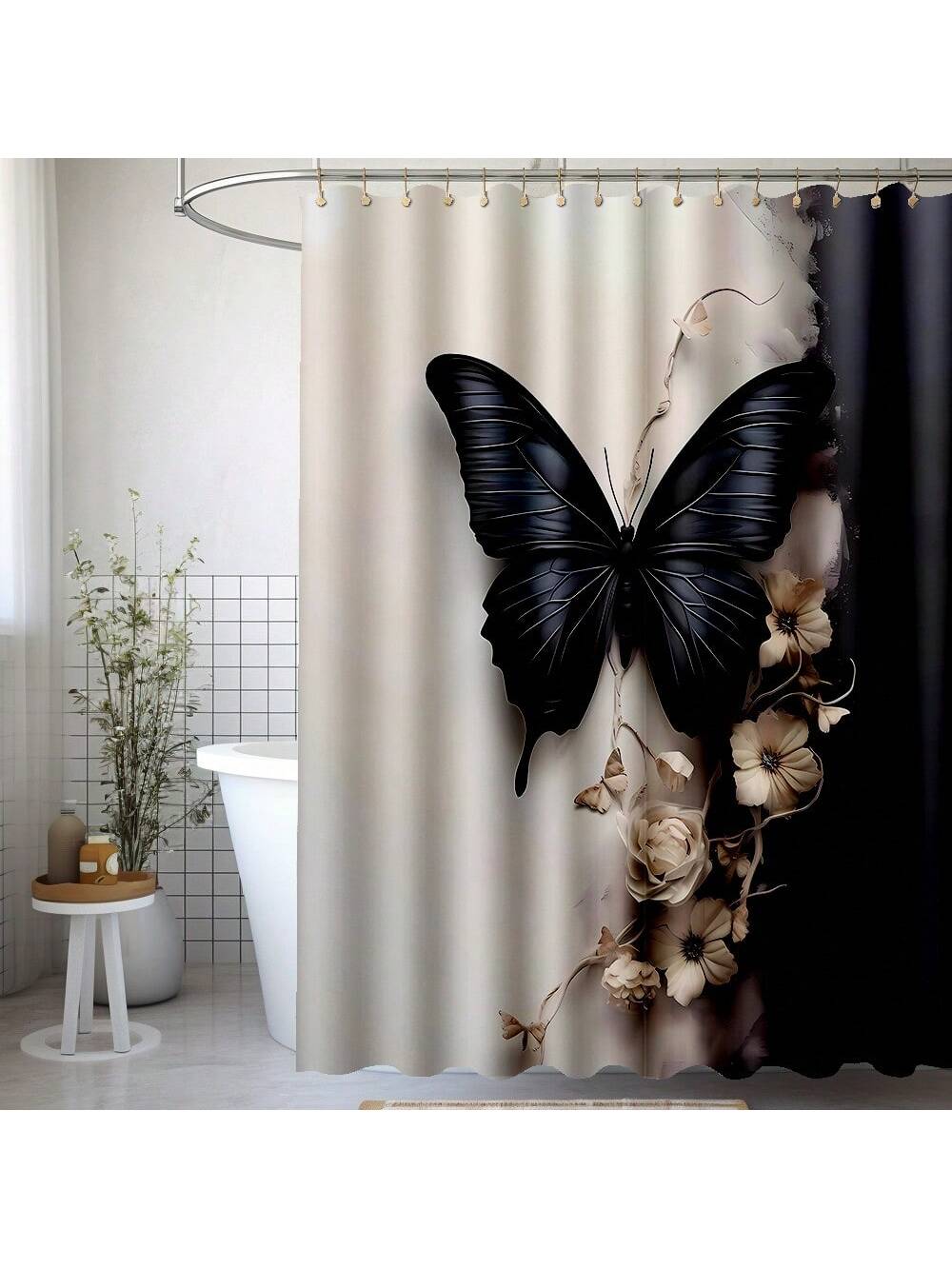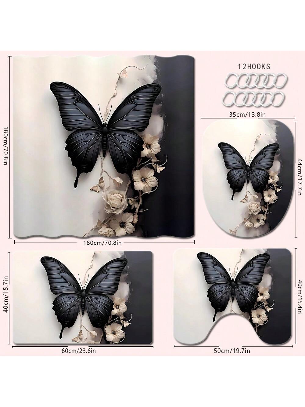 Add a touch of whimsy to your bathroom with our Elegance in Bloom shower curtain set! Featuring a 3D black and white butterfly and flower design, this set includes hooks and a mat for a complete look. Bring a unique and playful touch to your daily routine.