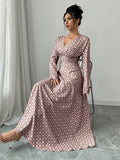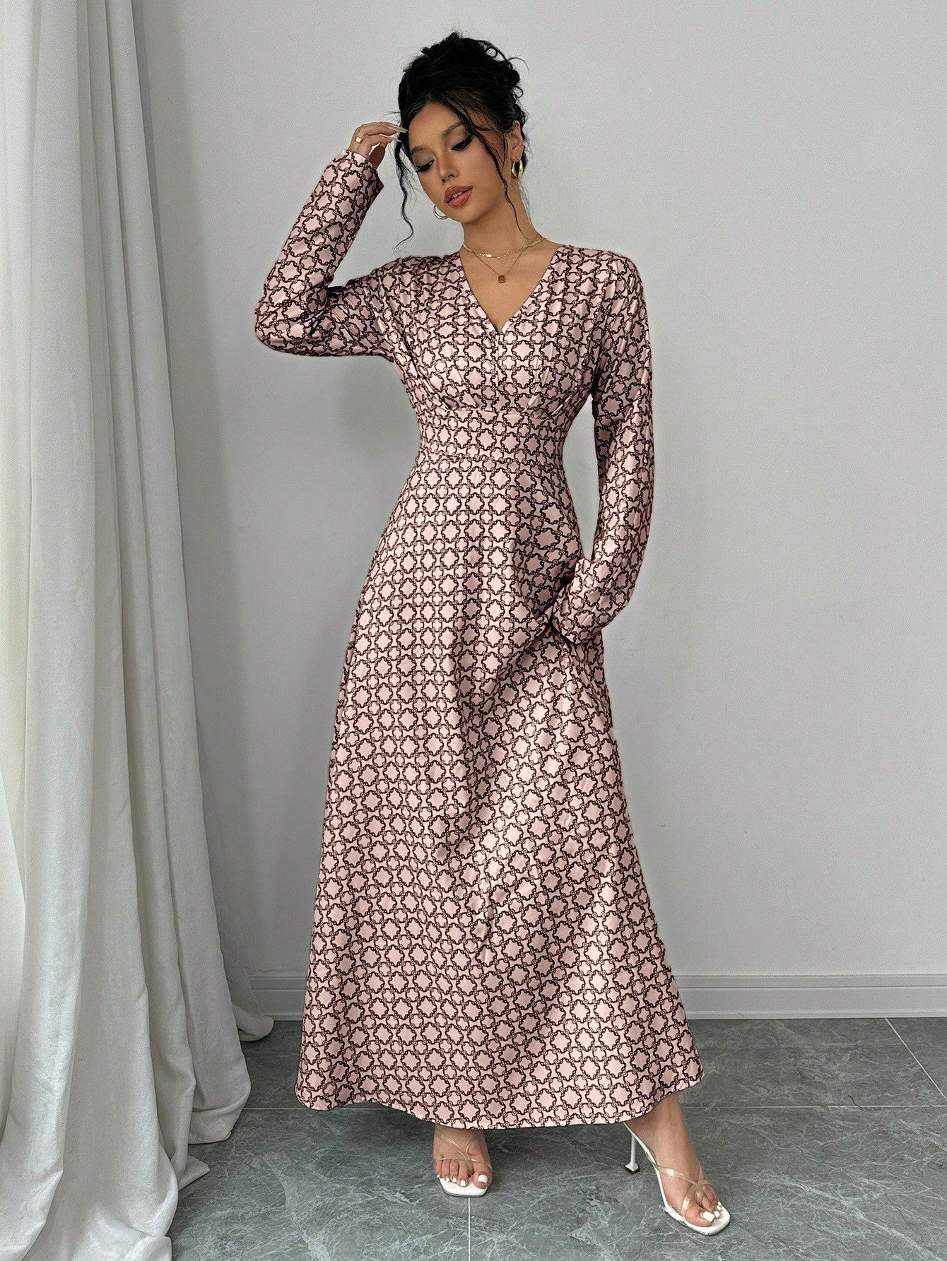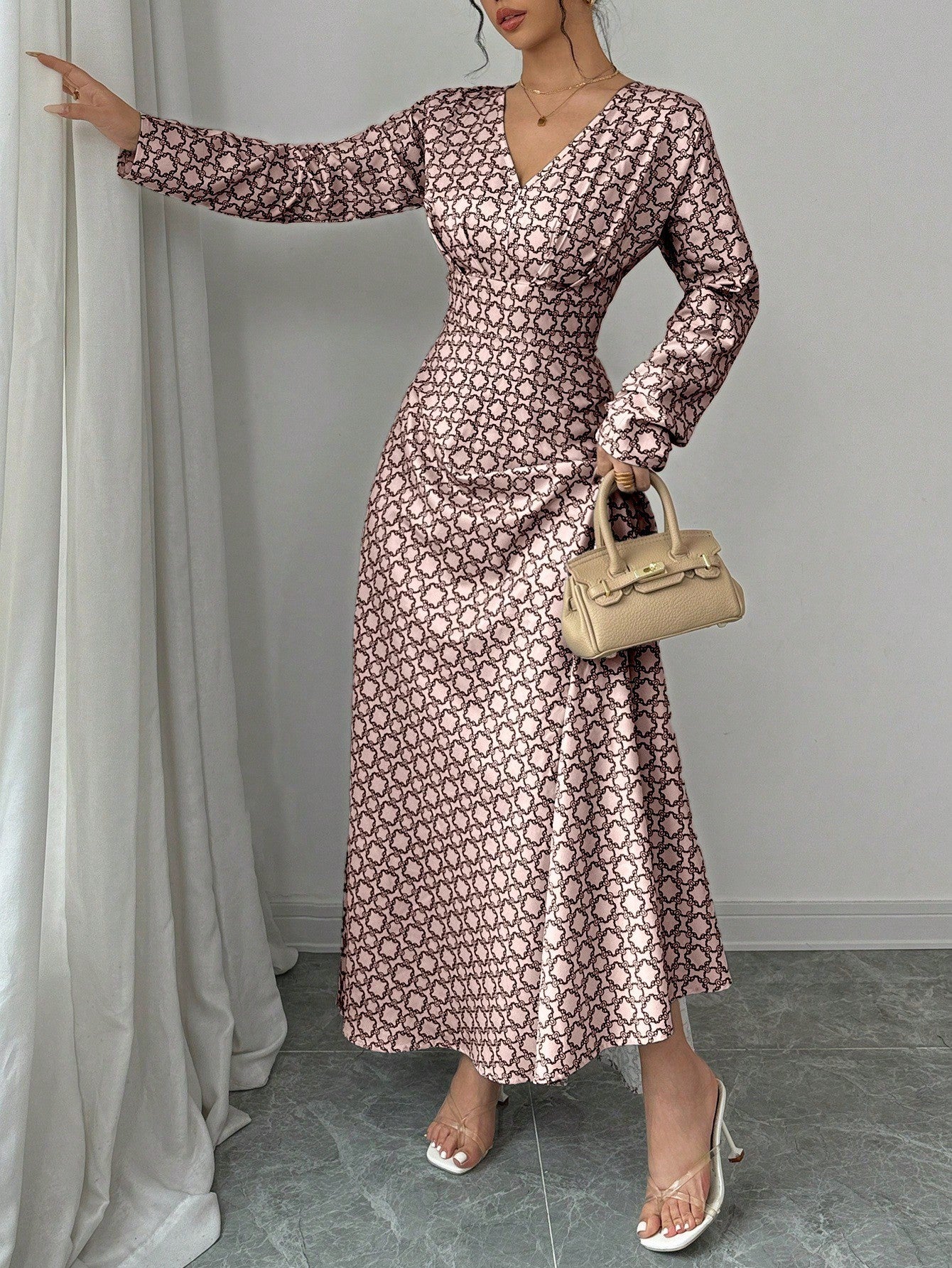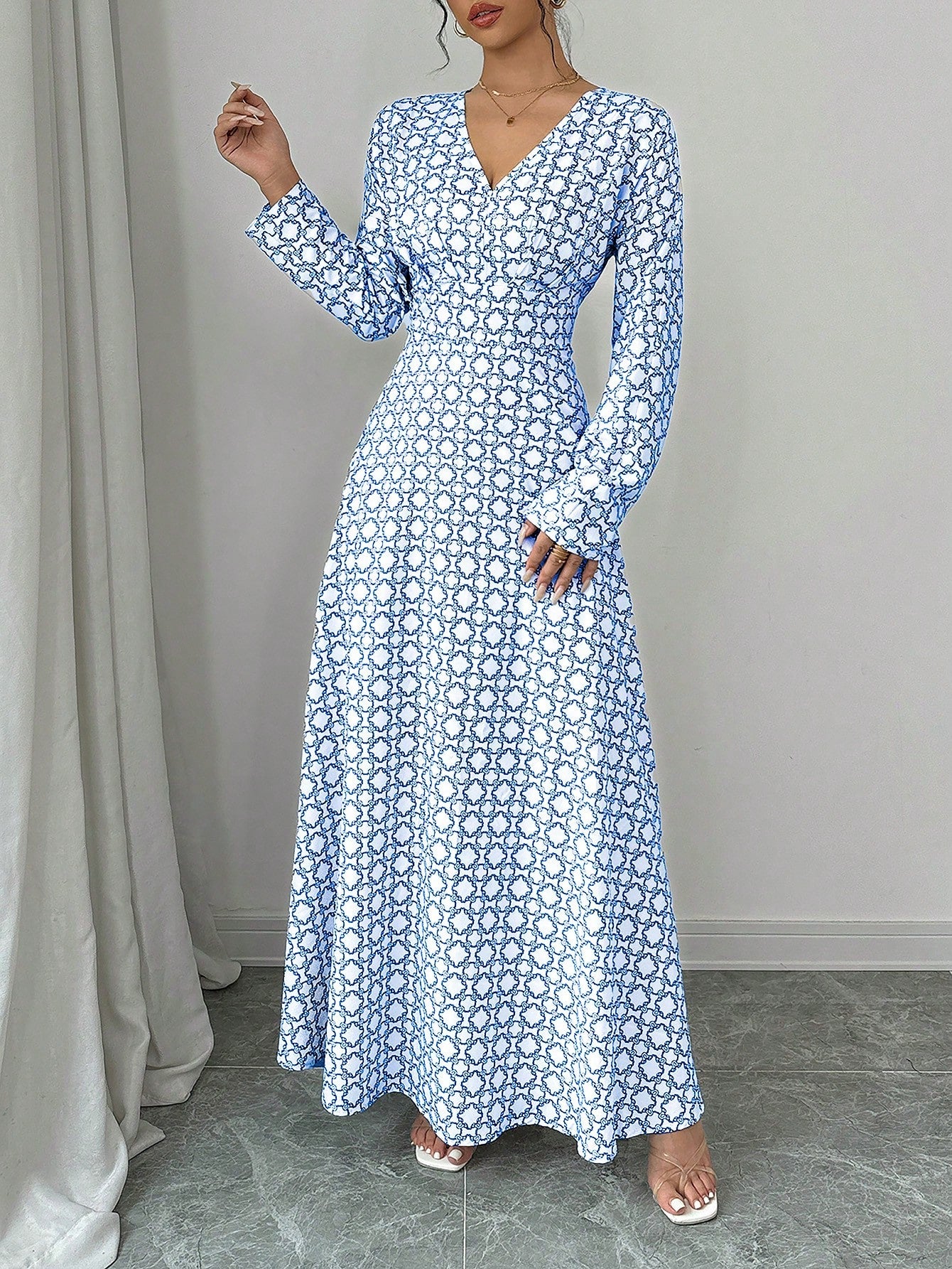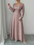 Elegant All-Over Print V-Neck Maxi Dress for Women's Spring and Autumn Fashion