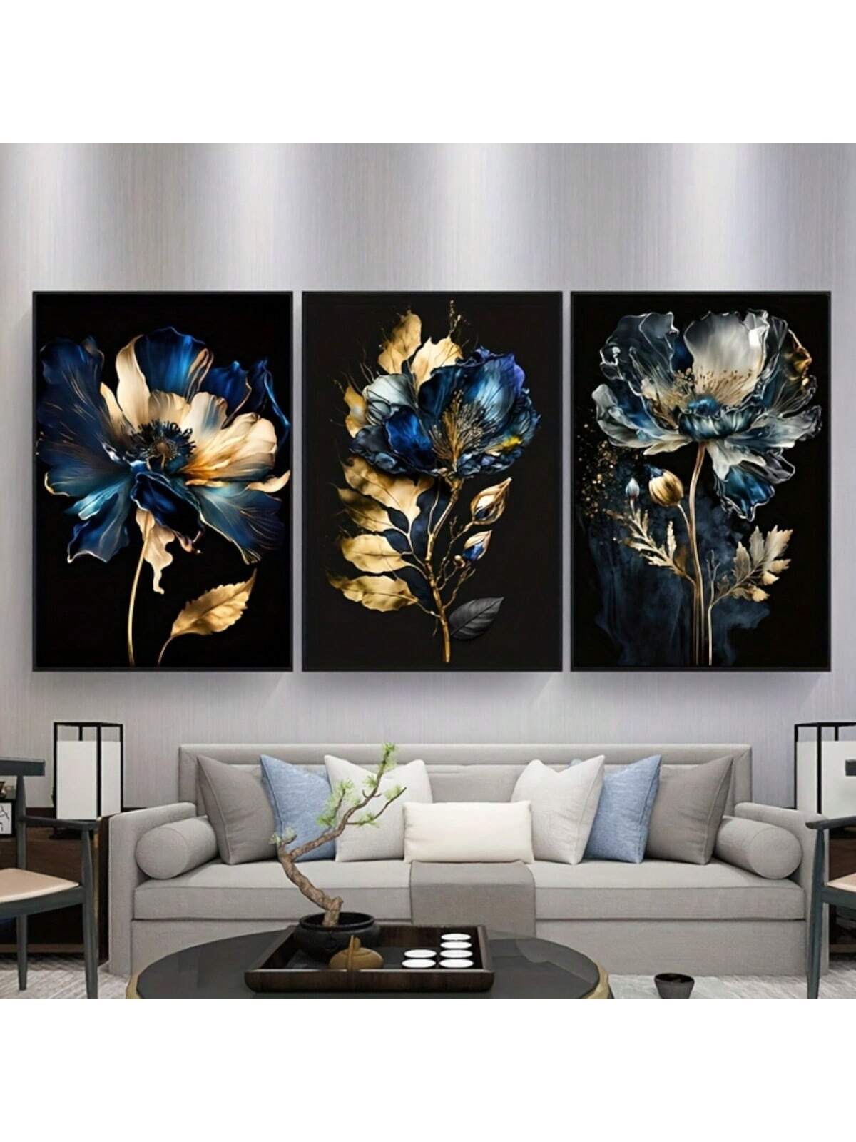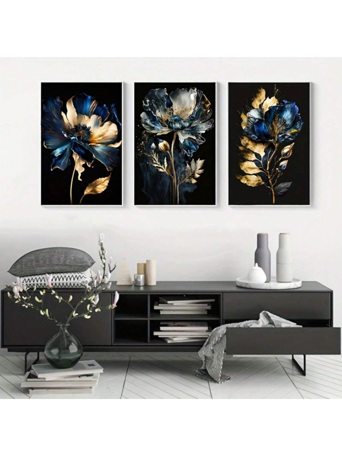 Elegant Black and Blue Floral Abstract Canvas Art - 3-Piece Set for Stylish Home Decor