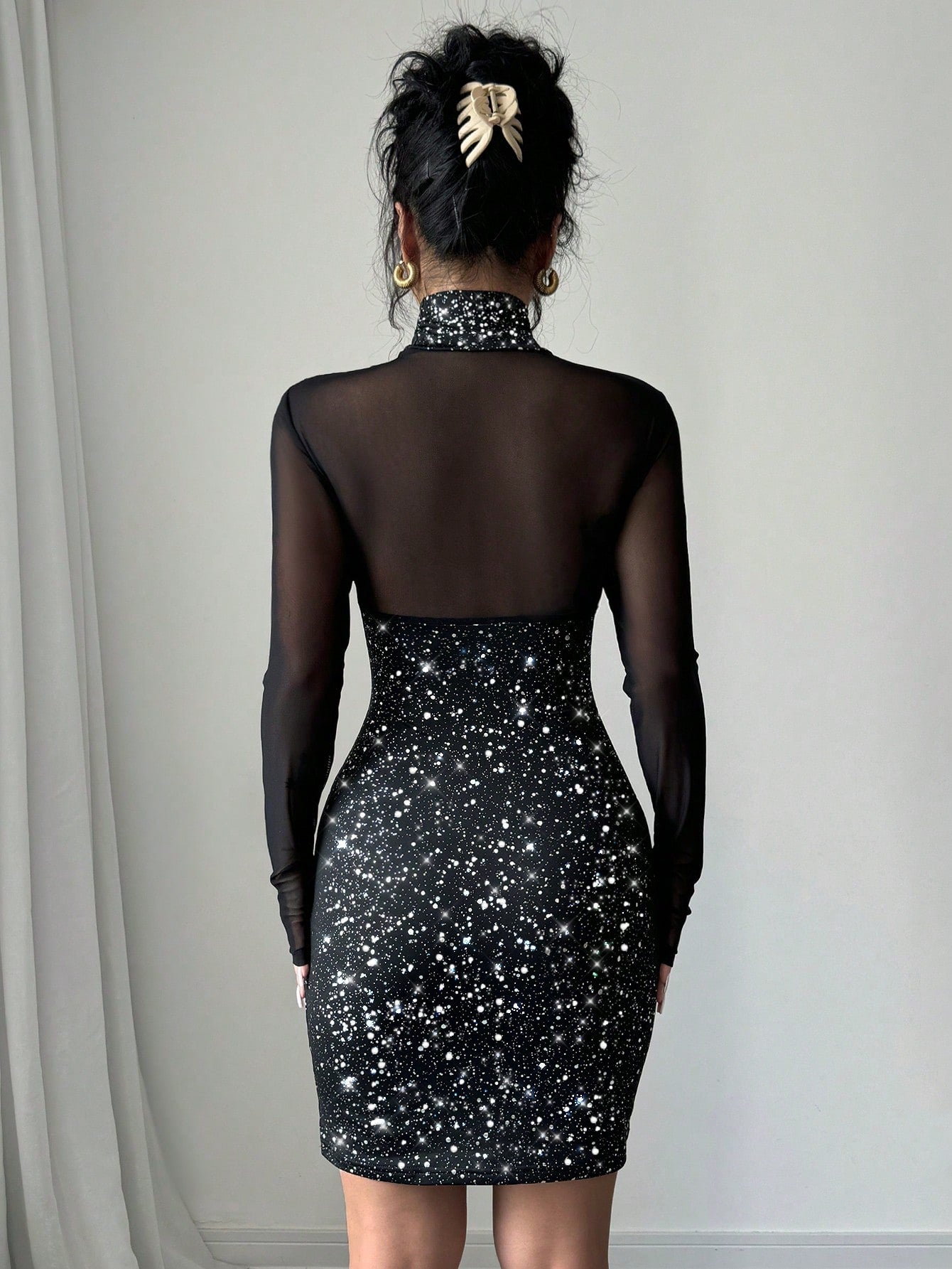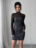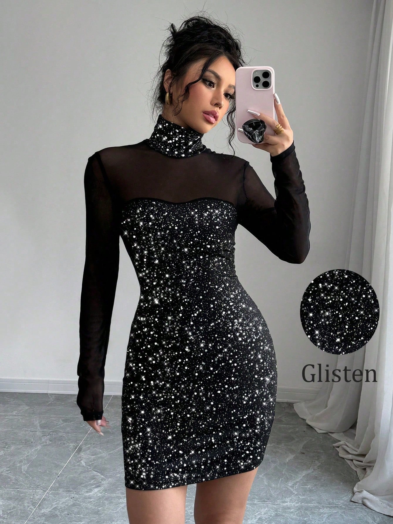 Elegant French High Neck Sequin Mesh Dress - Sparkle in Style