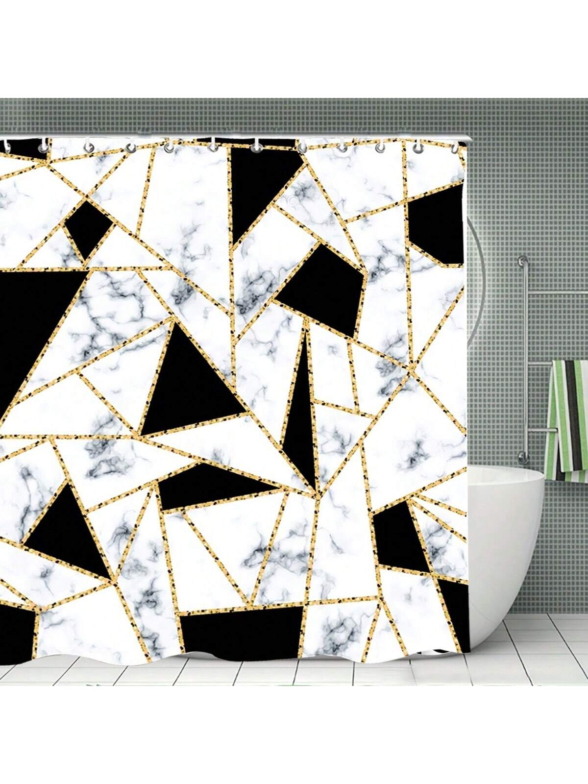 Transform your bathroom into a charming and peaceful retreat with our Marble Triangle Bathroom Set.Increase the style and safety of your bathroom with our Elegant Marble Triangle Shower Curtain Set. Made with non-slip rug and a toilet lid cover, this set brings together elegance and practicality in one package. Enjoy the benefits of a stylish and secure shower experience with our set.