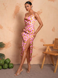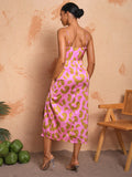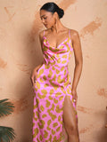 Elegant Pink Leopard Print Cami Dress with Draped Neck and High Side Slit