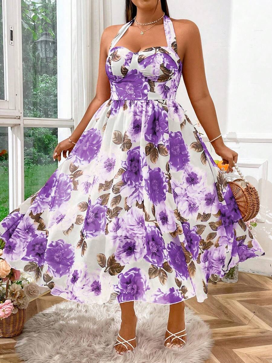 Elegant Plus Size Floral Backless Halter Vacation Dress for Effortless Style