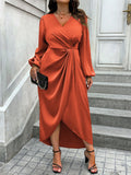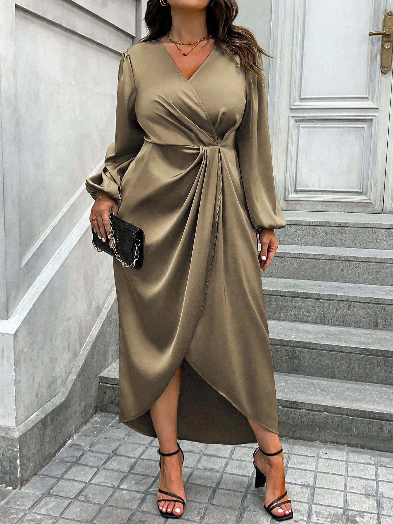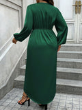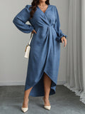 Elegant Plus Size V-Neck Lantern Sleeve Wrap Dress for Spring & Autumn