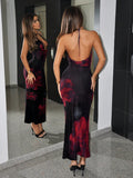 Elegant Red Floral Print Boat Neck Backless Long Dress for Holiday Celebrations