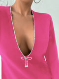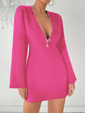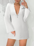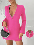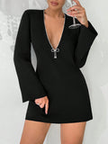 Elegant Rhinestone Embellished Deep V-Neck Mini Cocktail Dress with Flare Sleeves