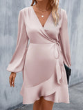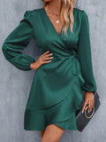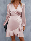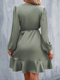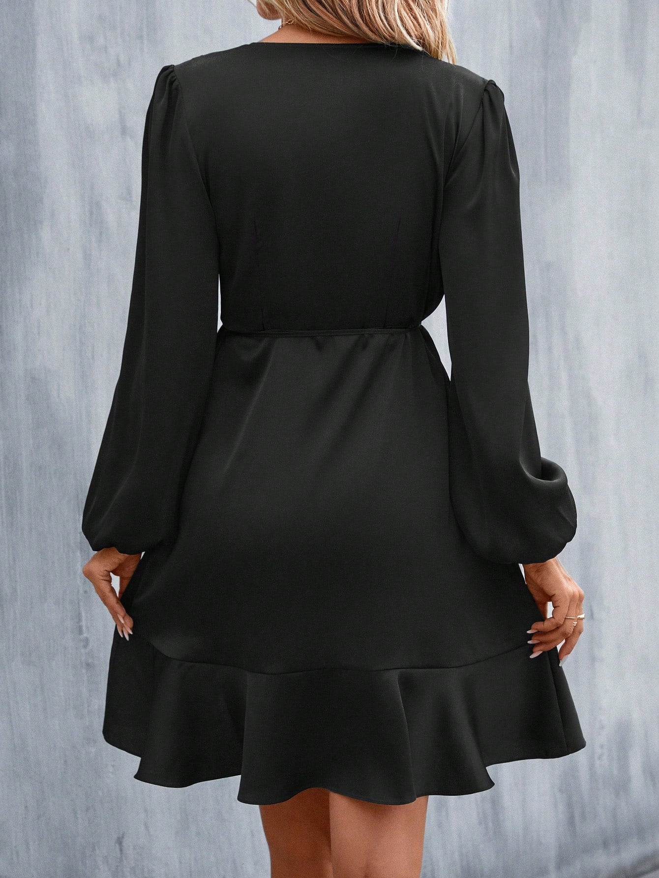 Elegant Ruffle Trim Satin Dress with Lantern Sleeves