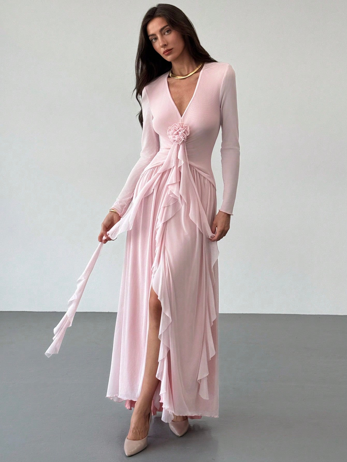 Unleash your inner romance with this elegant and playful dress featuring ruffled floral accents and a plunging v-neck. Perfect for a date night or special occasion, this sheer dress will make you feel beautiful and confident. Embrace your unique style and stand out in a crowd!
