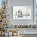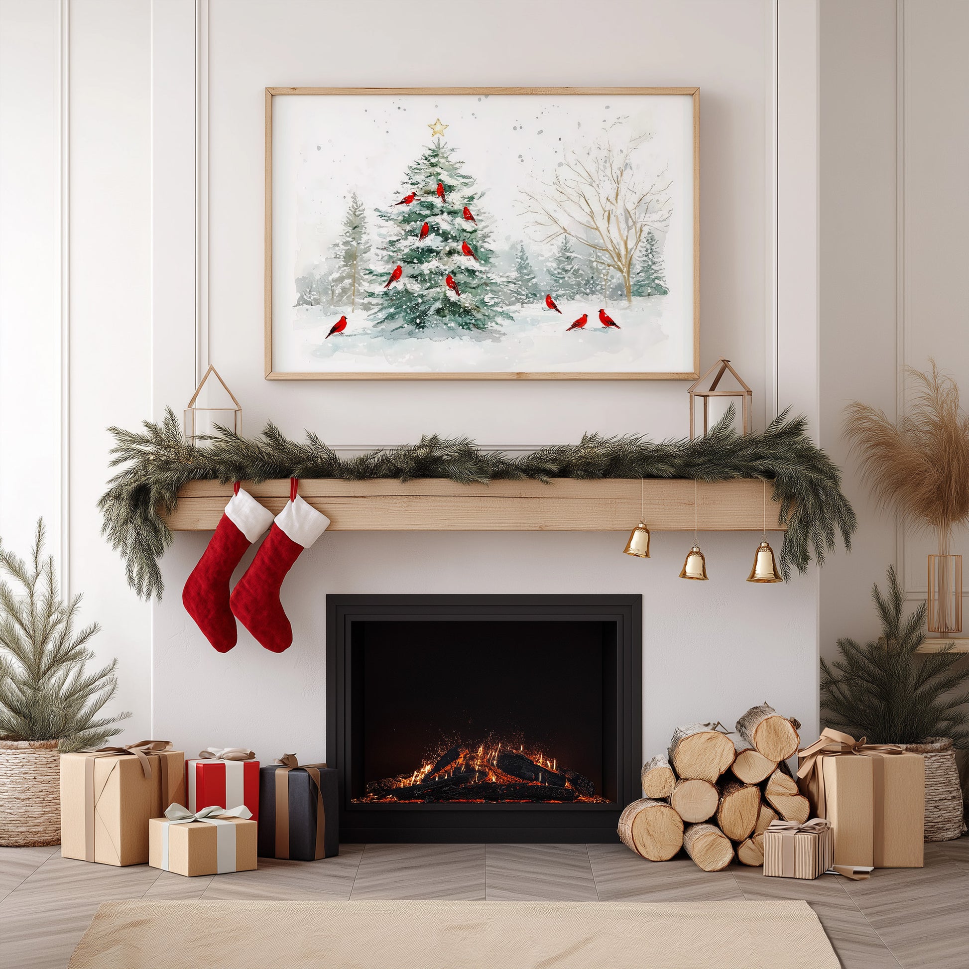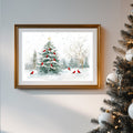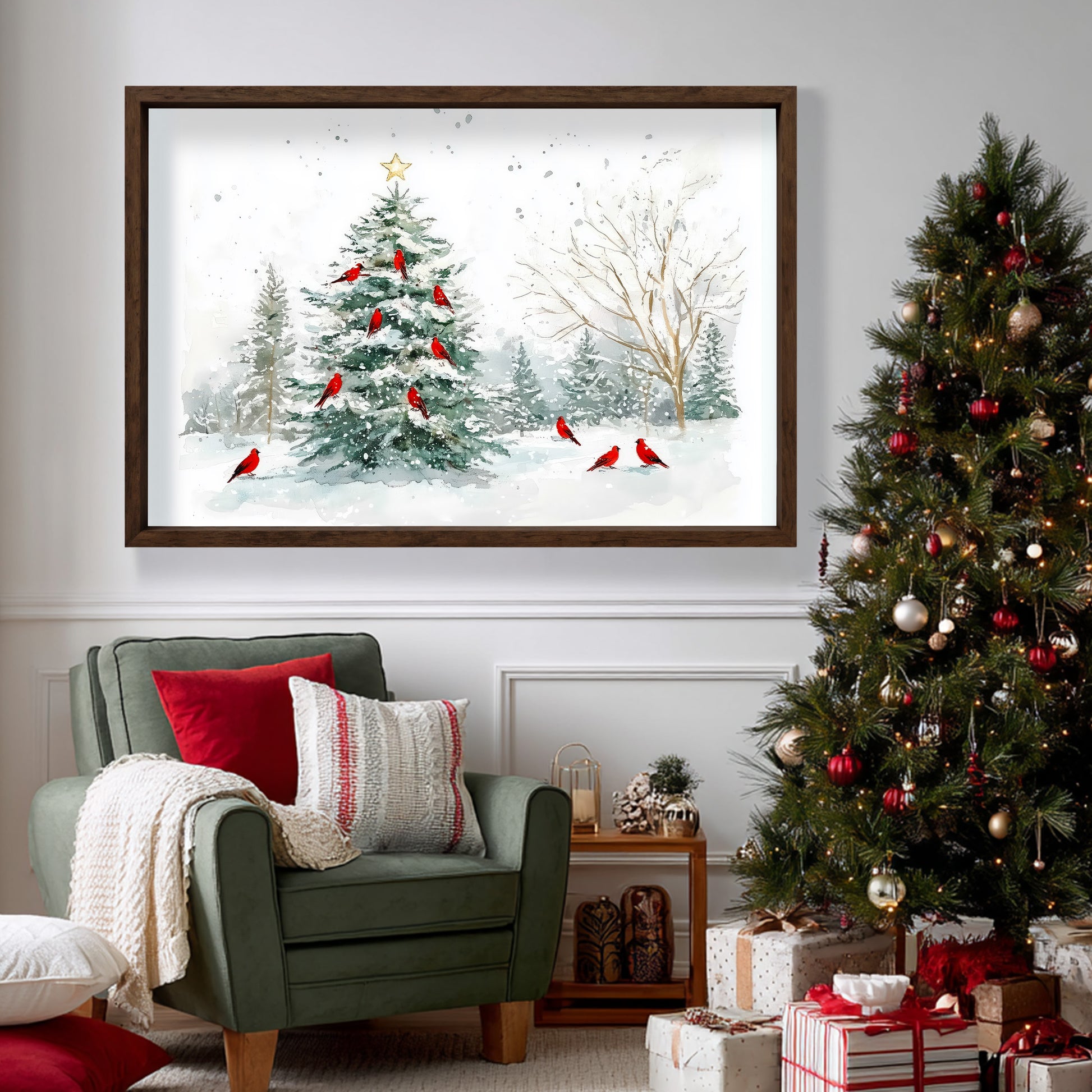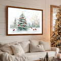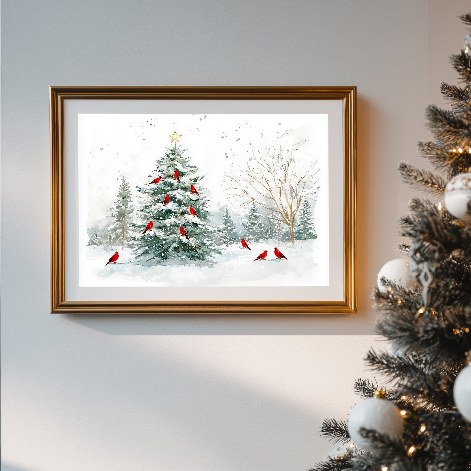An elegant and minimalist watercolor painting of a snow-covered Christmas tree standing in a serene winter landscape. The evergreen is adorned with bright red cardinal birds perched on its branches and a delicate gold star at the top. Softly painted winter trees fade into the clean white background, creating a peaceful and airy holiday atmosphere. This graceful piece is perfect for modern holiday decor, seasonal greeting cards, or as a gift for bird and nature lovers.