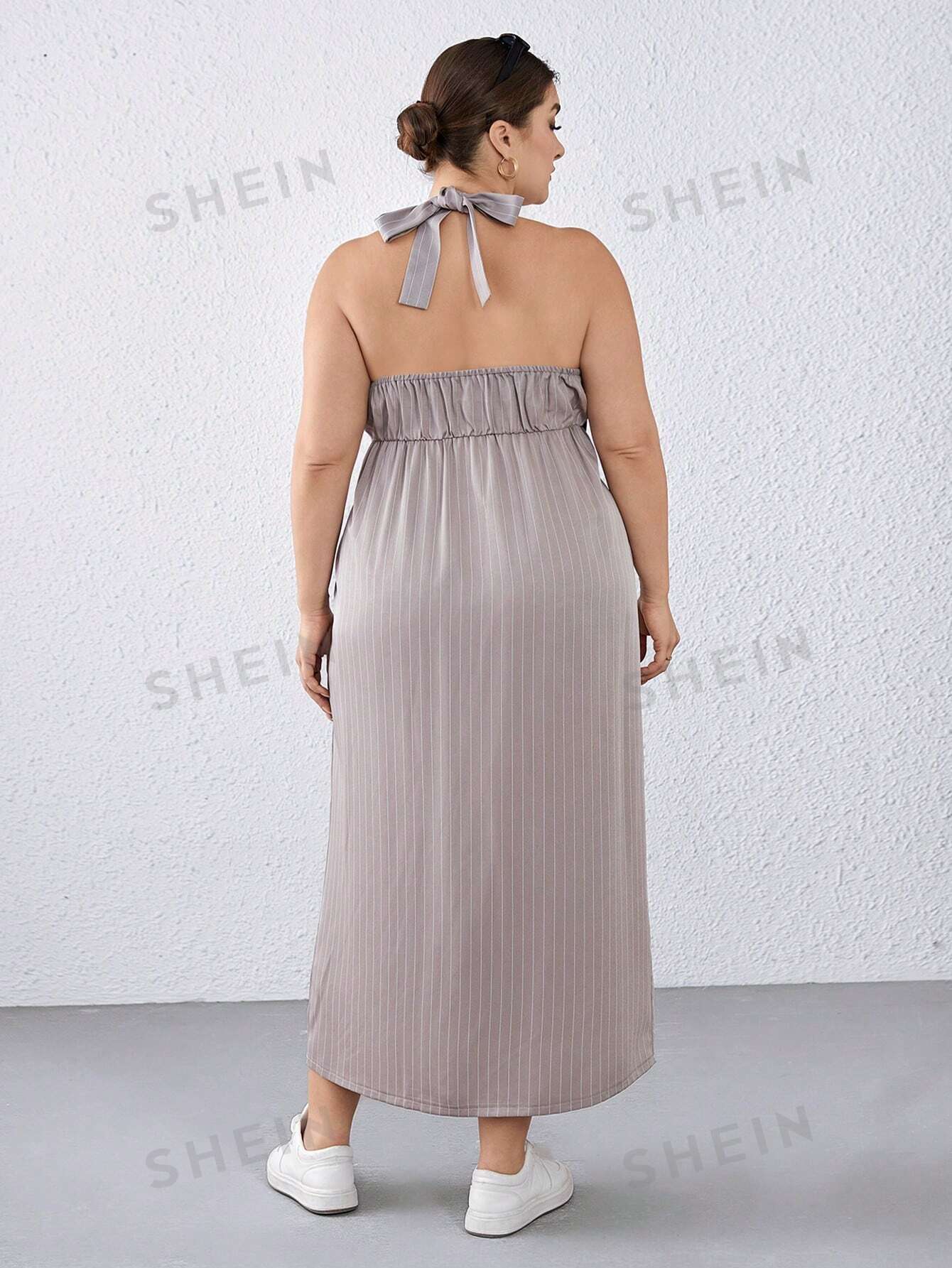 Elegantly Chic: Plus Size Stripe Self-Tie Sleeveless Pocketed Overall Midi Dress