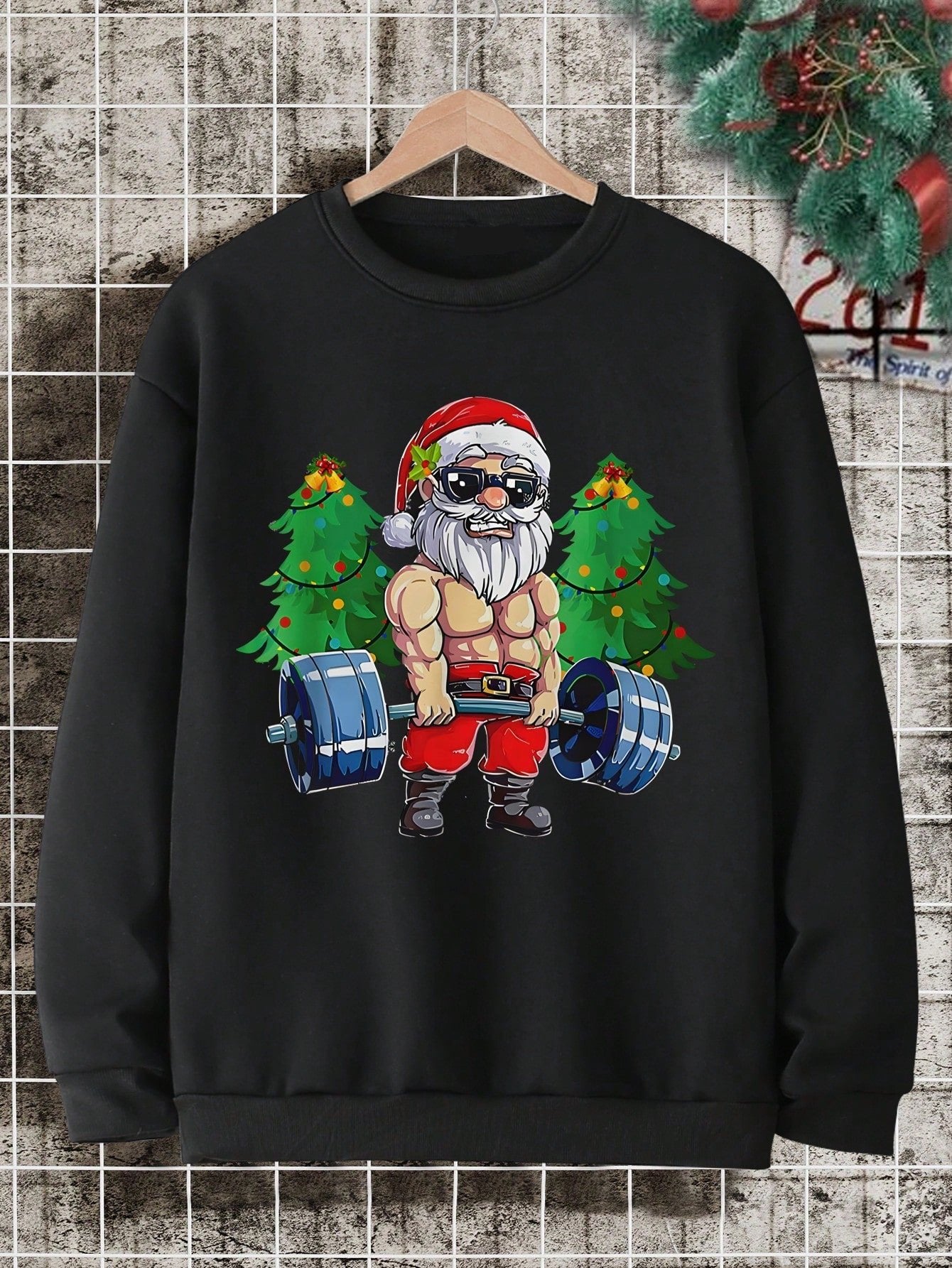 Boost your holiday cheer with this Festive Gains sweatshirt featuring Santa lifting weights. Stay cozy and stylish with its fleece material and classic crew neck design. Perfect for showing off your festive spirit and staying active during the holiday season.