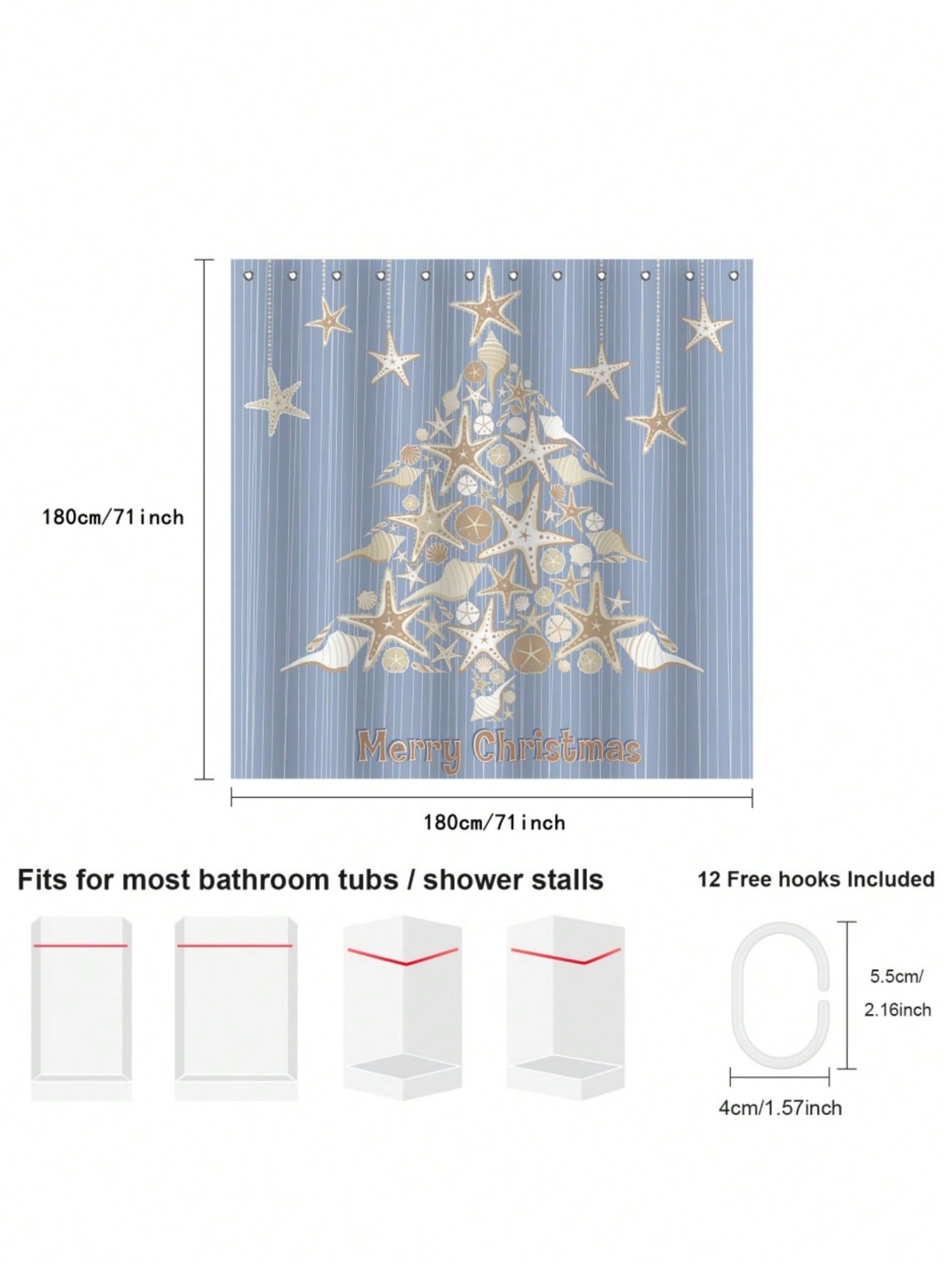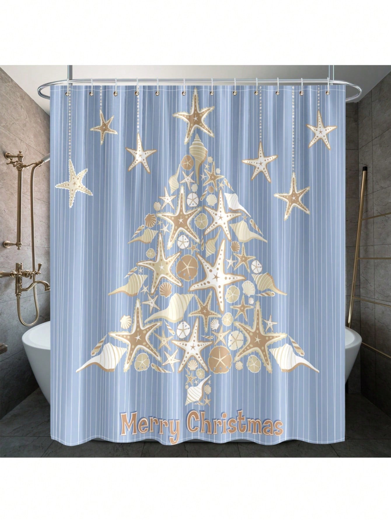 Elevate your holiday decor with this Festive Ocean-themed Christmas Shower Curtain! Adorned with starfish shells and a whimsical Christmas tree design, this waterproof curtain will bring a touch of seaside charm to your bathroom. Shower time has never been so festive!