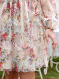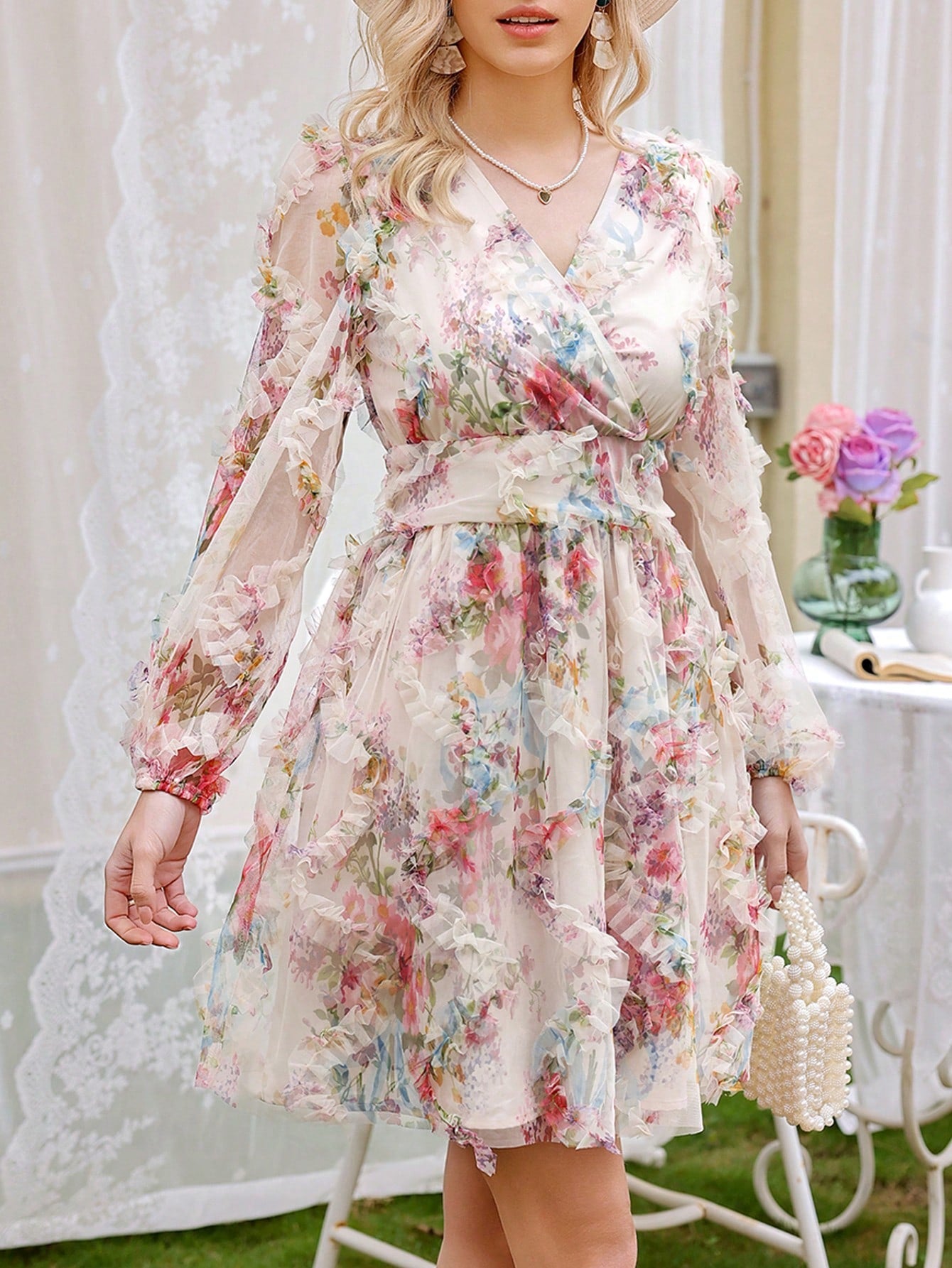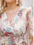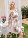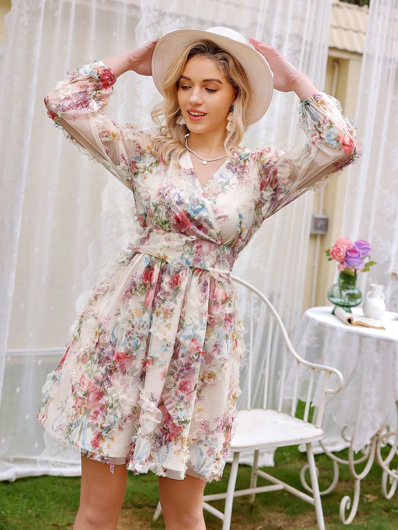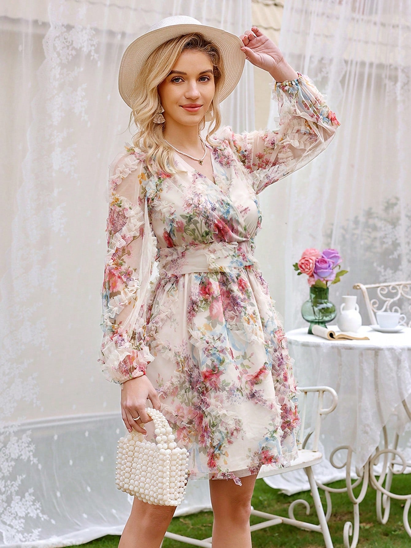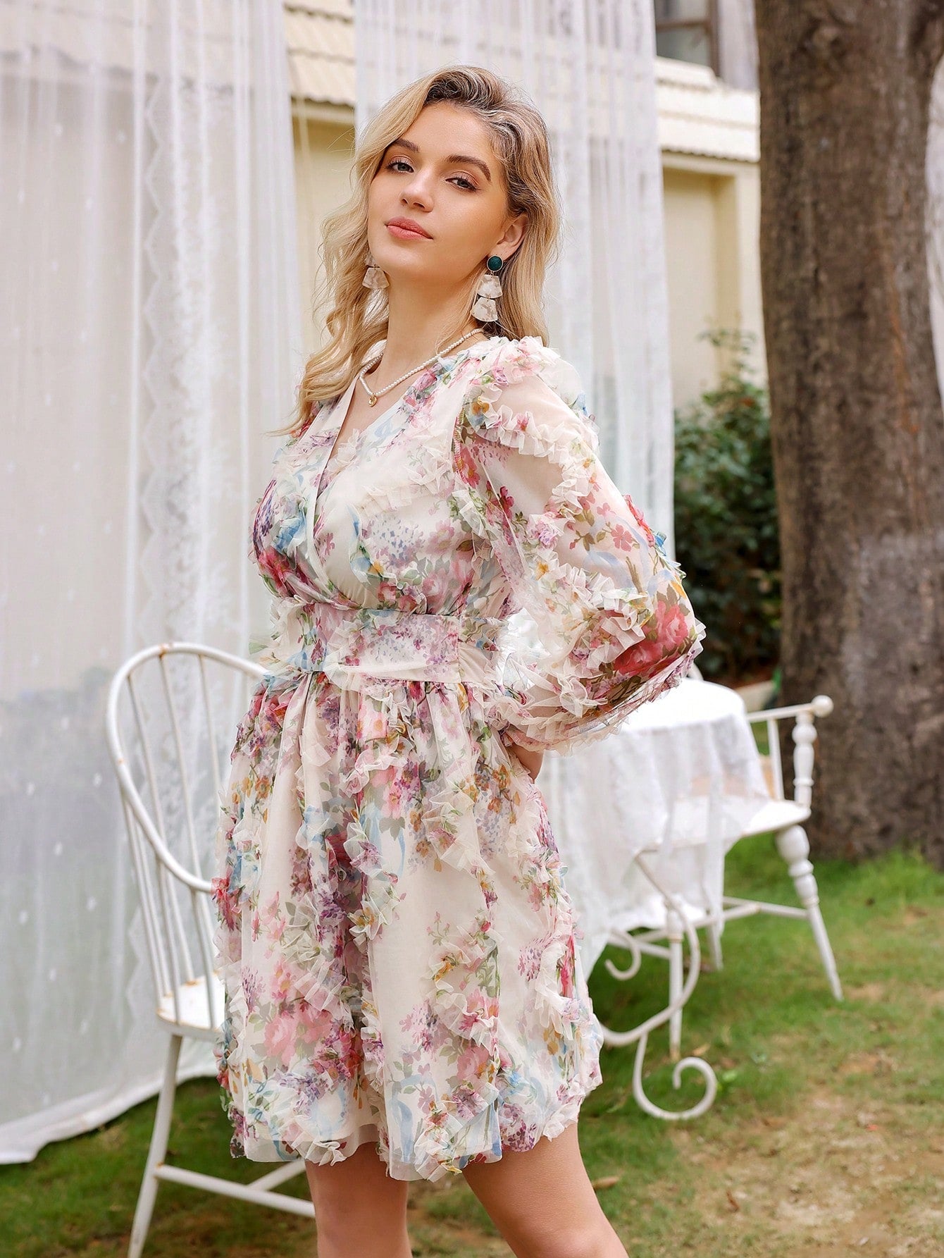 Floral Pattern Print Lantern Sleeve Women's V-Neck Dress: A Flirty Ruffle Hem Delight