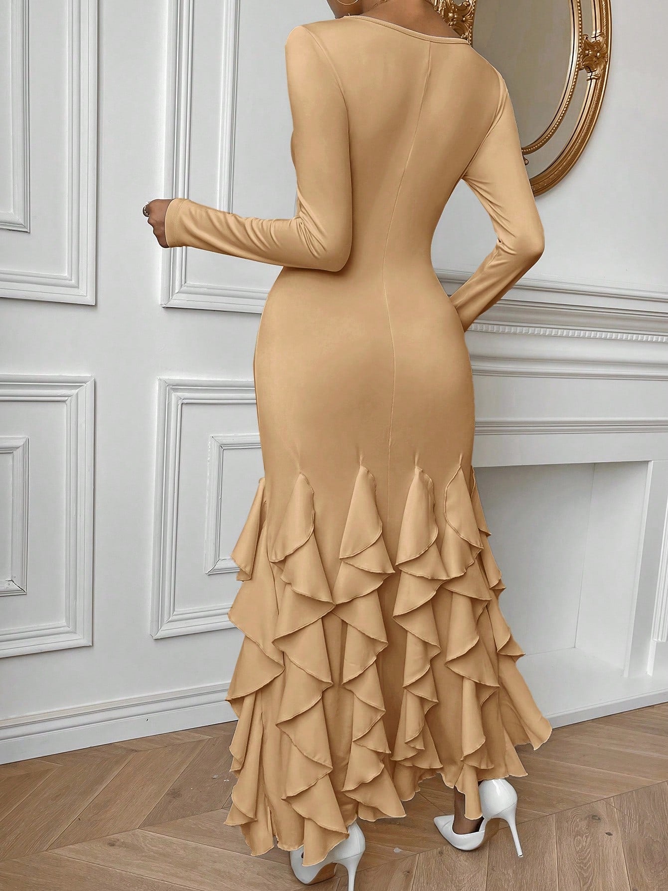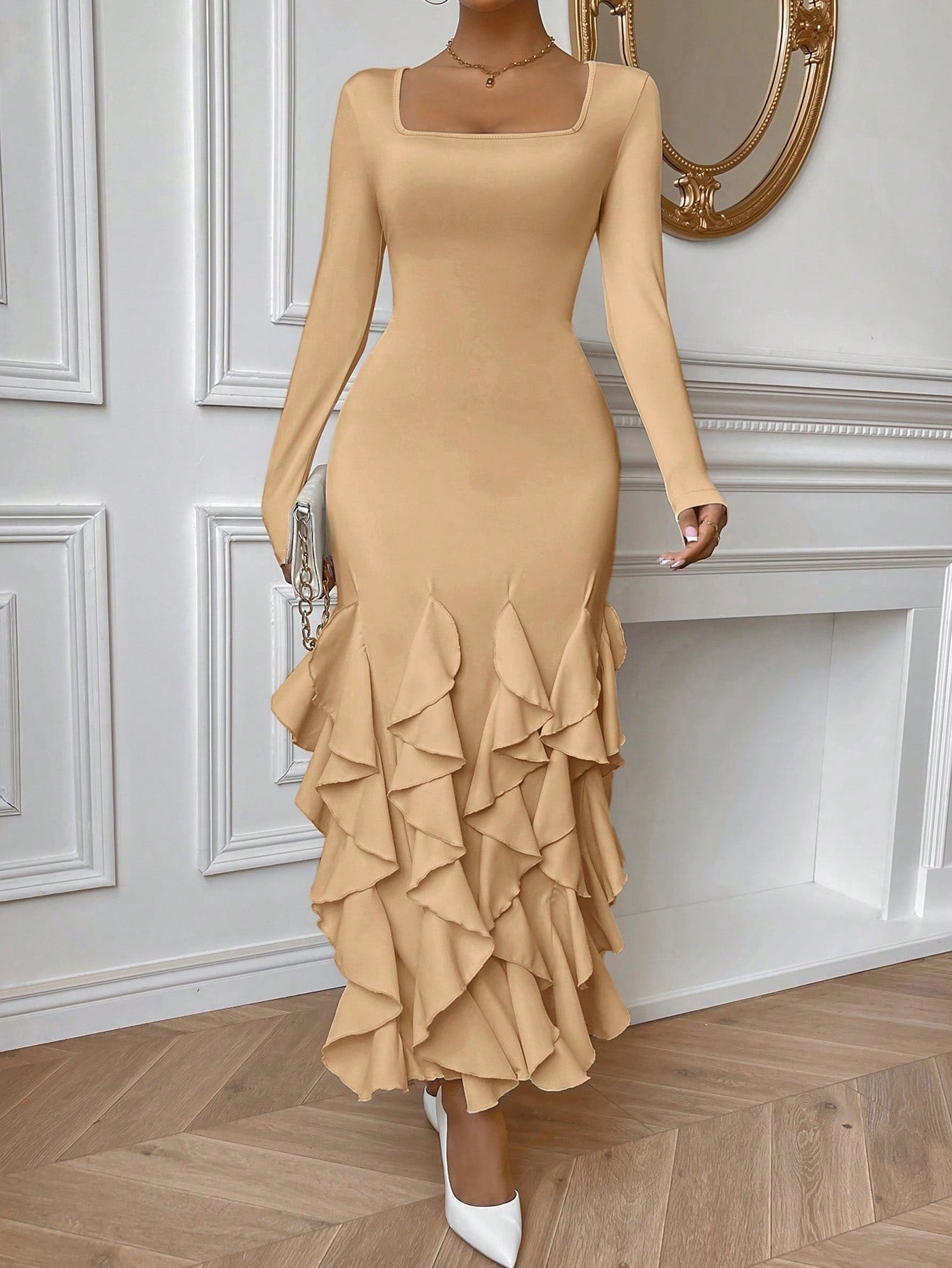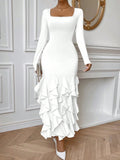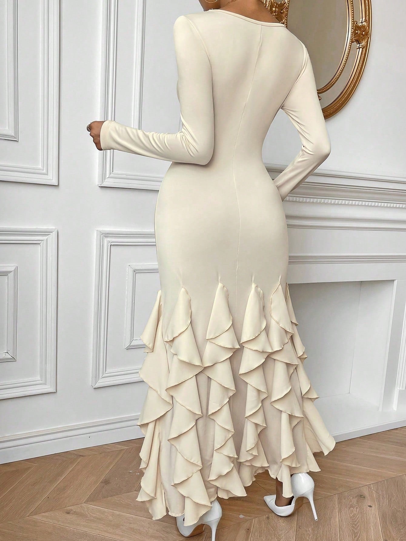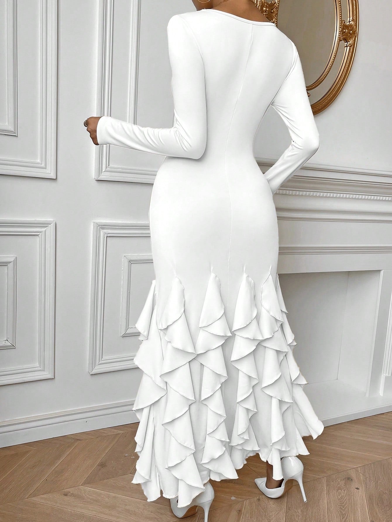 Fluttering Frill Trim Bodycon Dress: Women's Solid Color Fish Tail Style