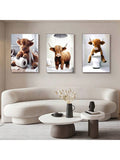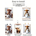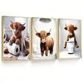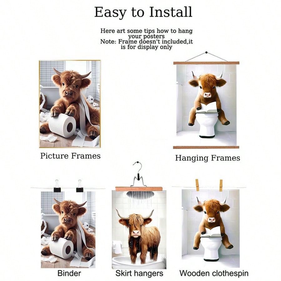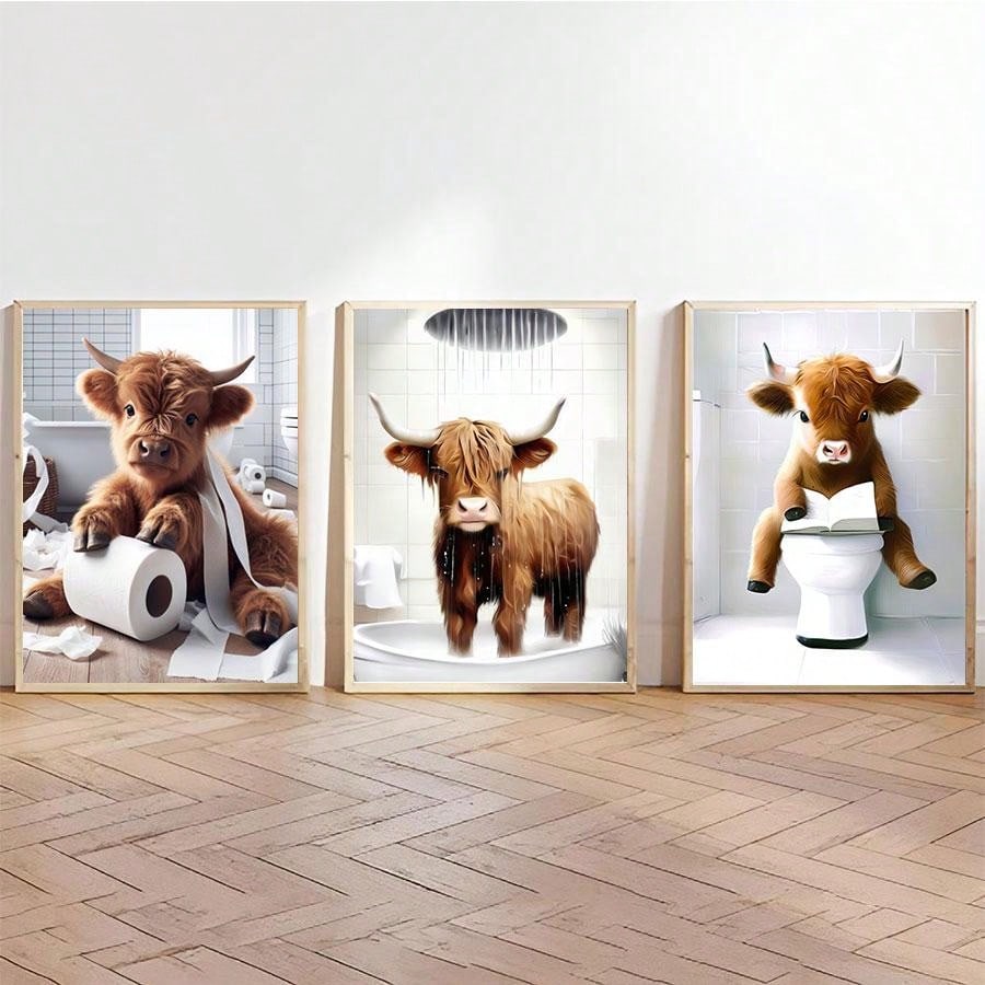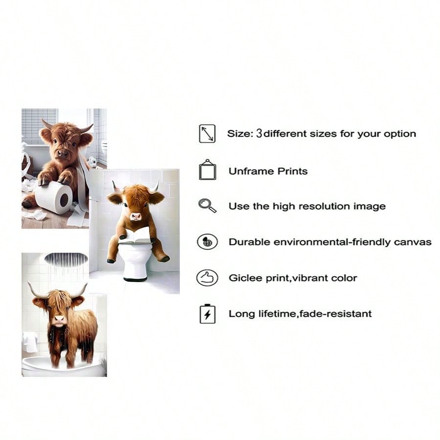 Funny Scottish Highland Cow Bathroom Canvas Poster Set: Whimsical Wall Art for Animal Lovers