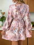 Garden Elegance: Floral Print Lantern Sleeve Belted Dress