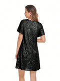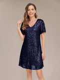 This Glamorous Sequin V-Neck Dress is a must-have for any special occasion. The flounce sleeves add a touch of elegance, while the sequin detailing adds just the right amount of sparkle. Made with high-quality materials, this dress promises both comfort and style. Shine bright and turn heads with this stunning dress.