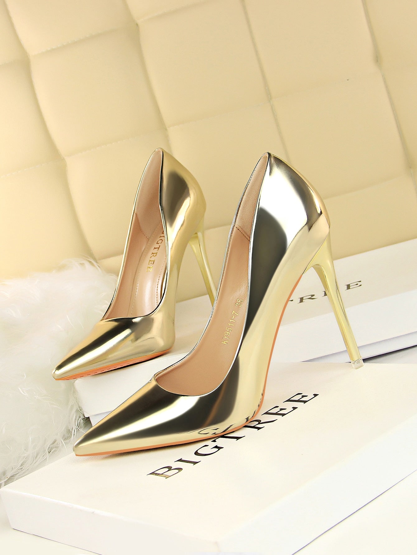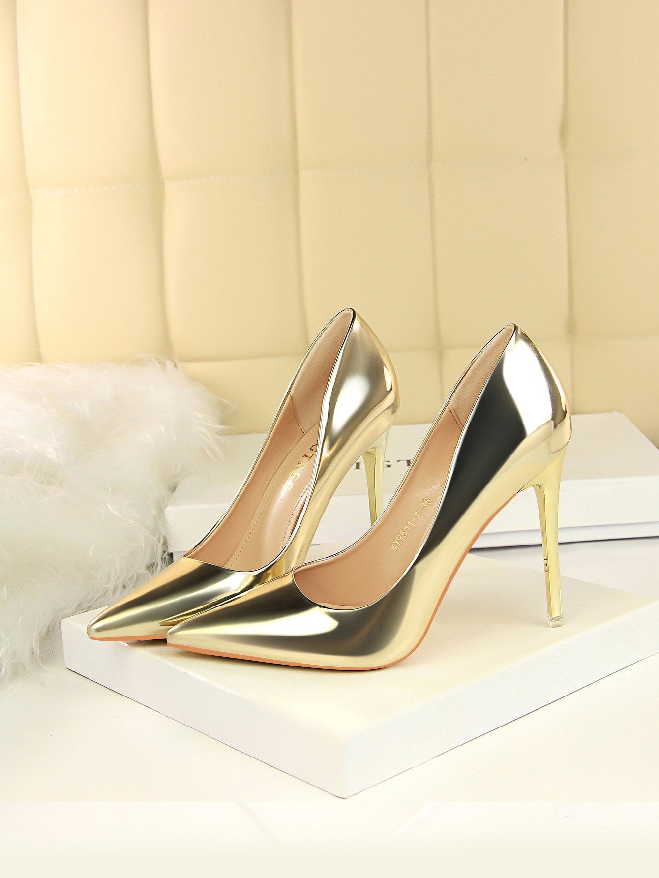 These Gleaming Gold Metallic Stiletto Court Pumps are perfect for party nights, providing a touch of glamour and elegance to any outfit. Their gleaming gold finish adds a luxurious touch, while the stiletto heel adds height and sophistication. Elevate your look and dance the night away in style with these chic pumps.