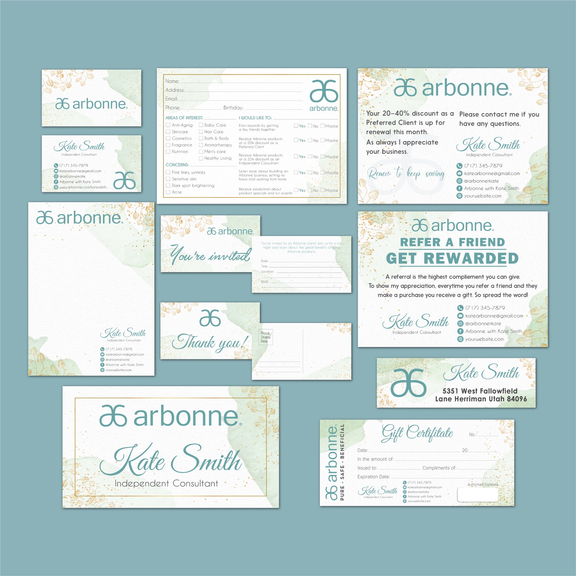 Gold Pattern And Green Watercolor Arbonne Marketing Bundle, Personalized Arbonne Cards, Arbonne Business Card AB126