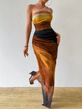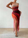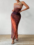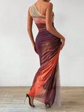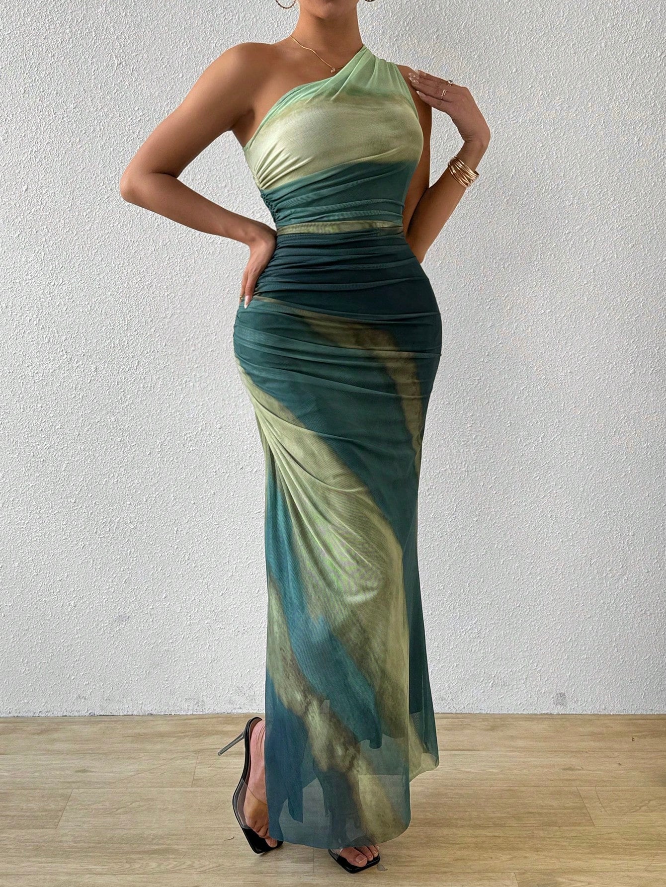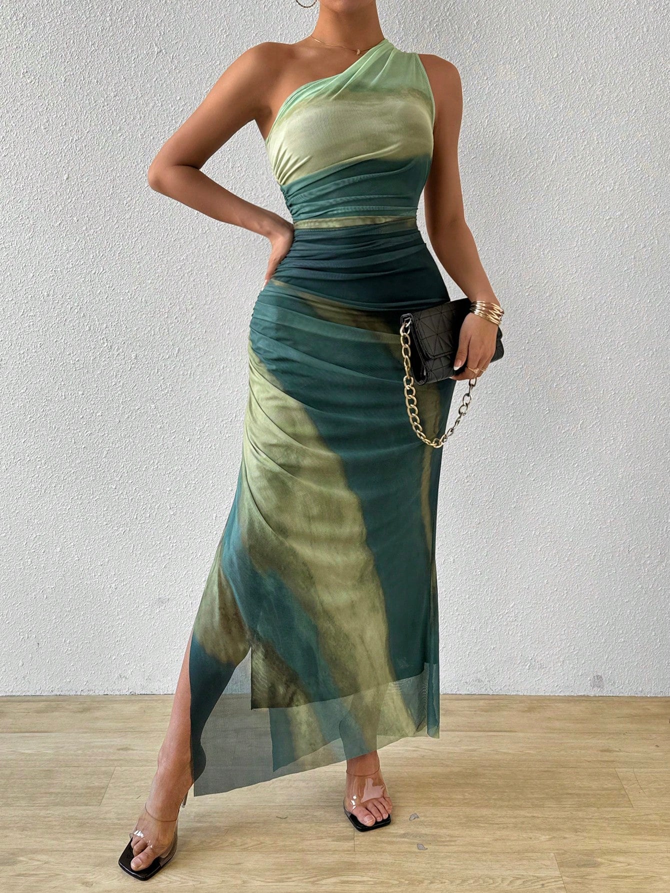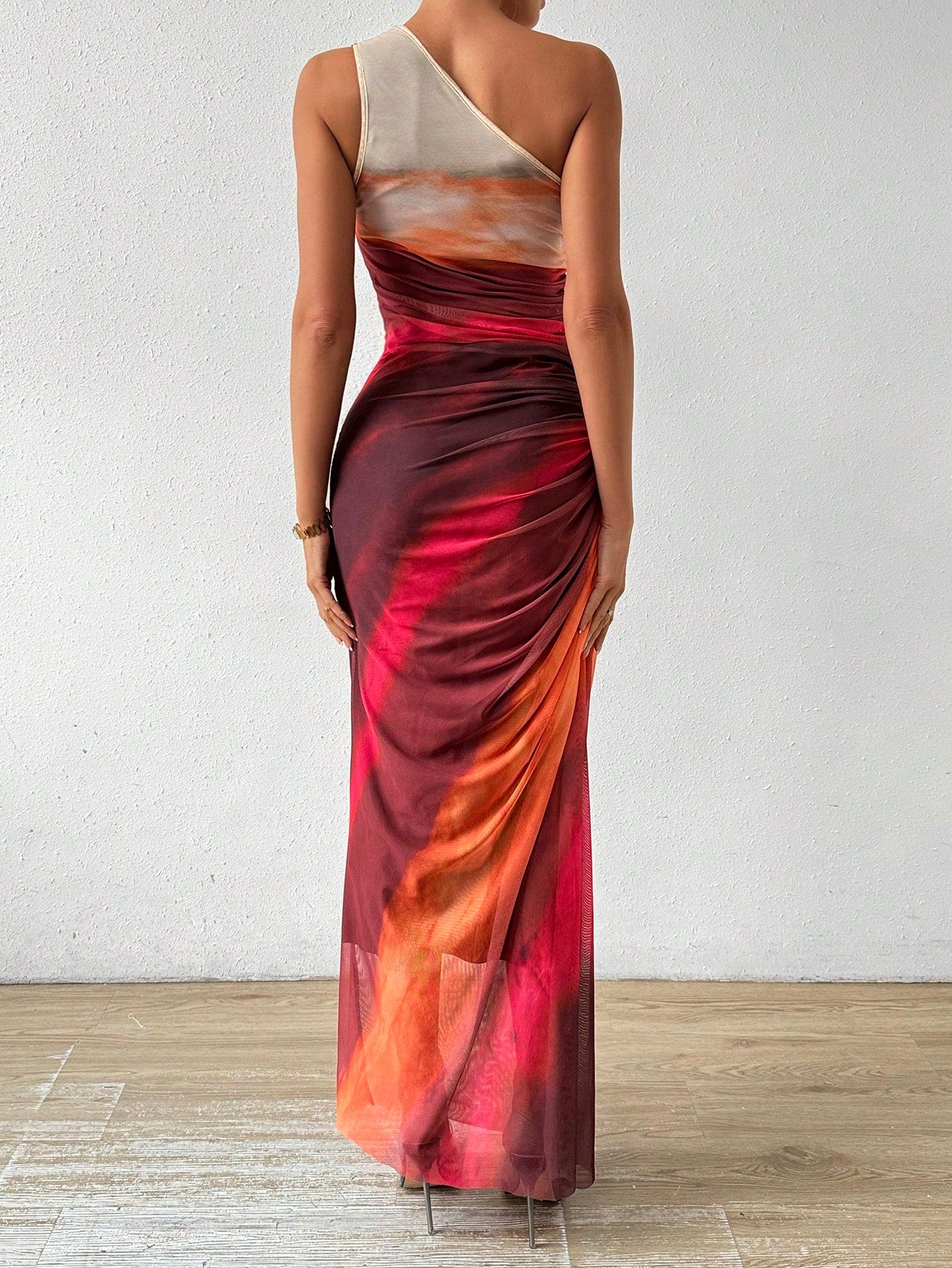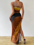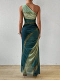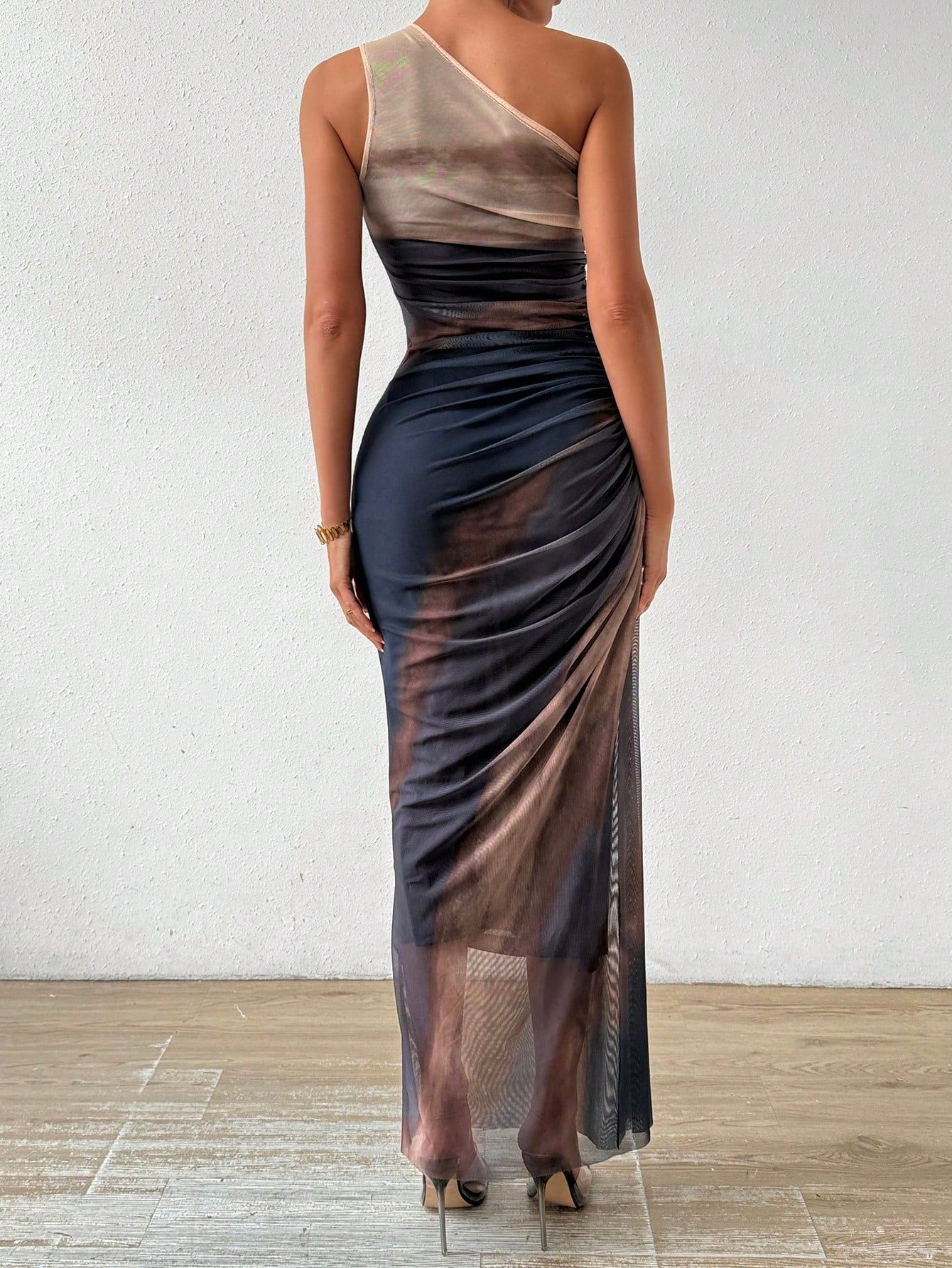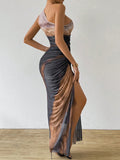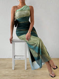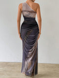 Upgrade your wardrobe with the Gradient Goddess dress. Made with ruched tulle, this dress features a high slit and asymmetric collar for a modern and chic look. Be the goddess of style with this unique design.