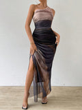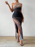 Gradient Goddess: Ruched Tulle Dress with High Slit and Asymmetric Collar