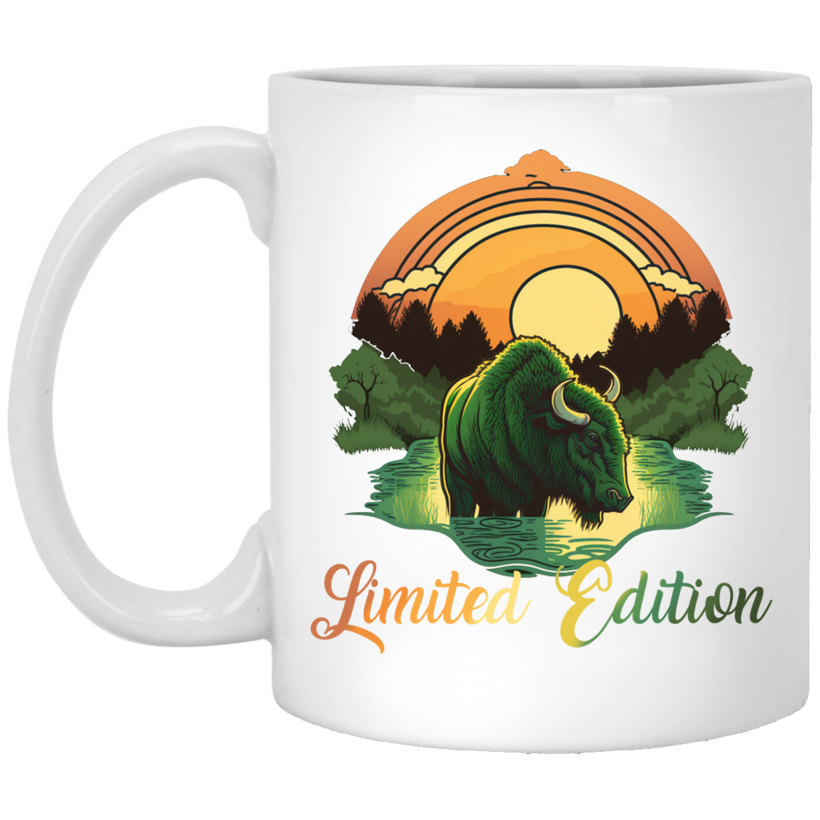 Green Bison With A River, Sunset And Treeline, Love Cow, Cow In Sunset White Mug