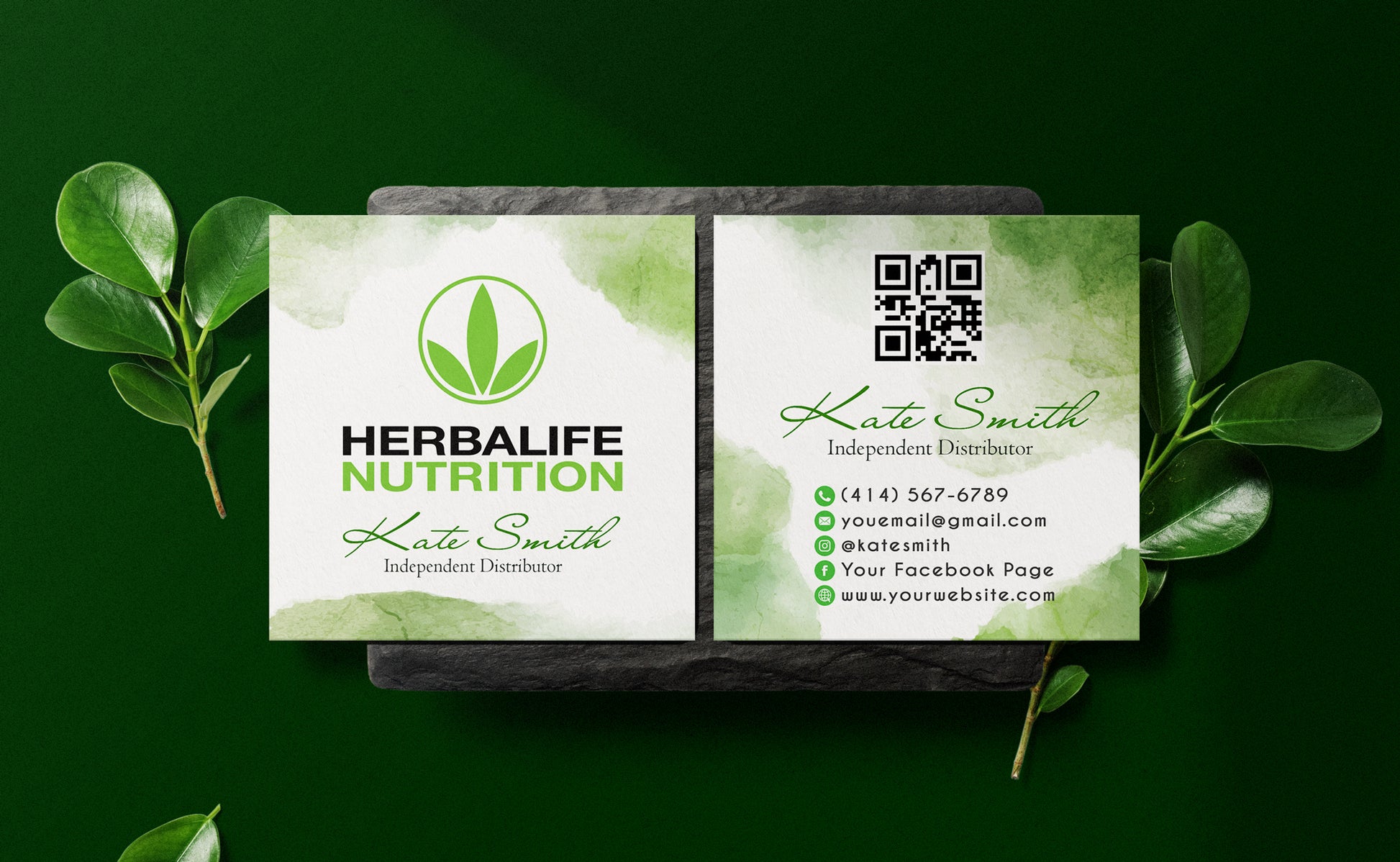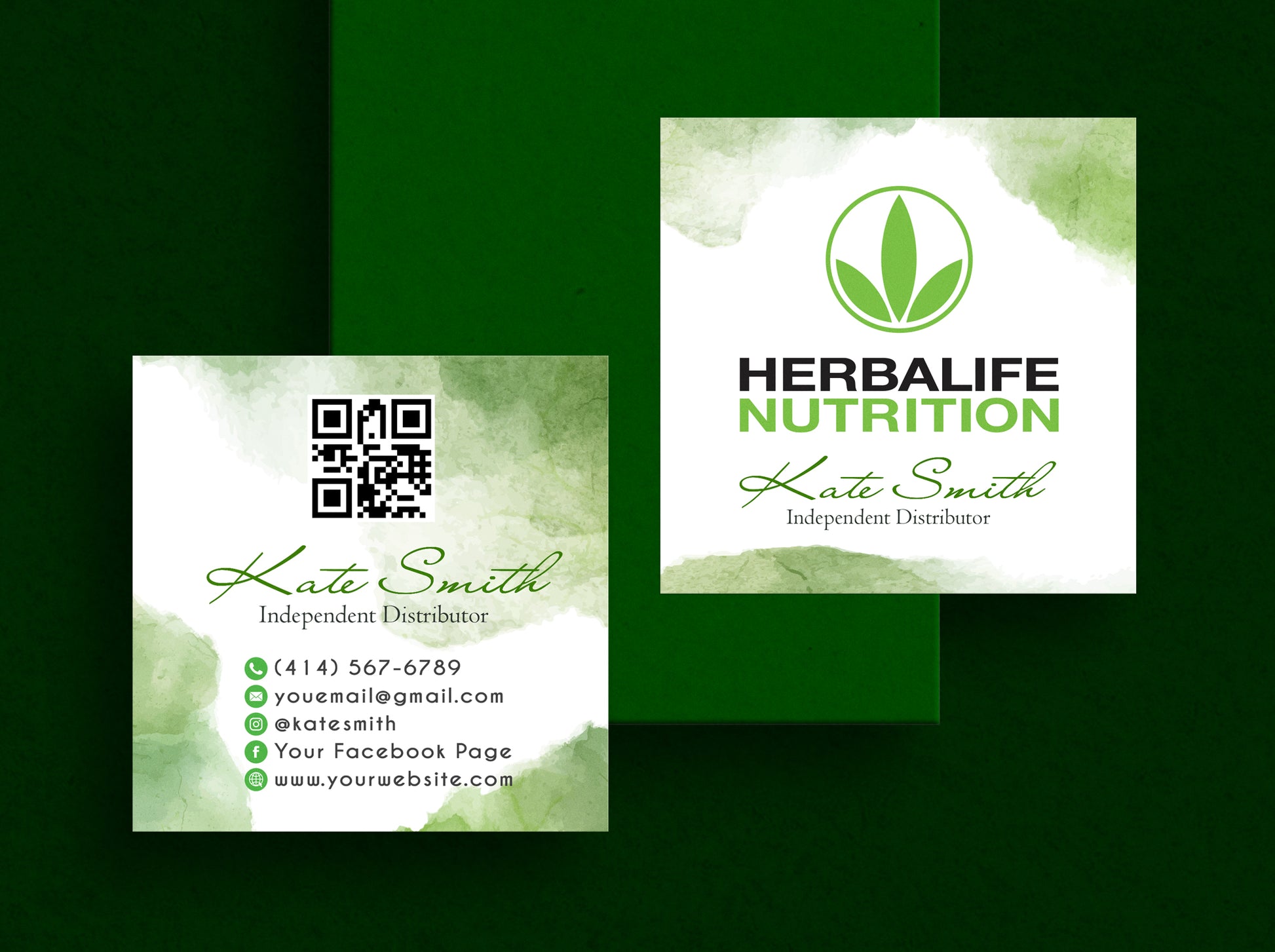 Green Watercolor Herbalife Business Card, Personalized Herbalife Custom QR Cards HE20.