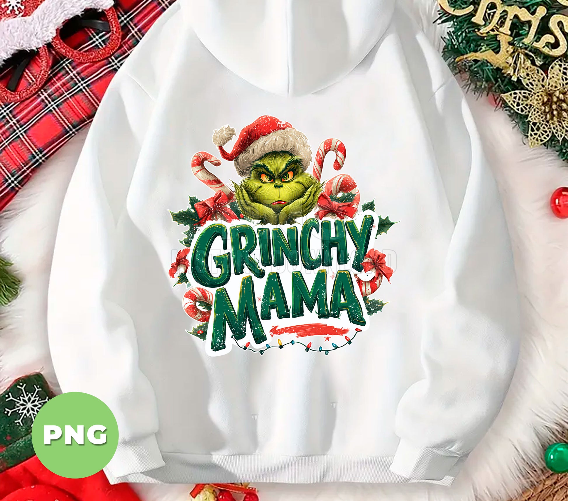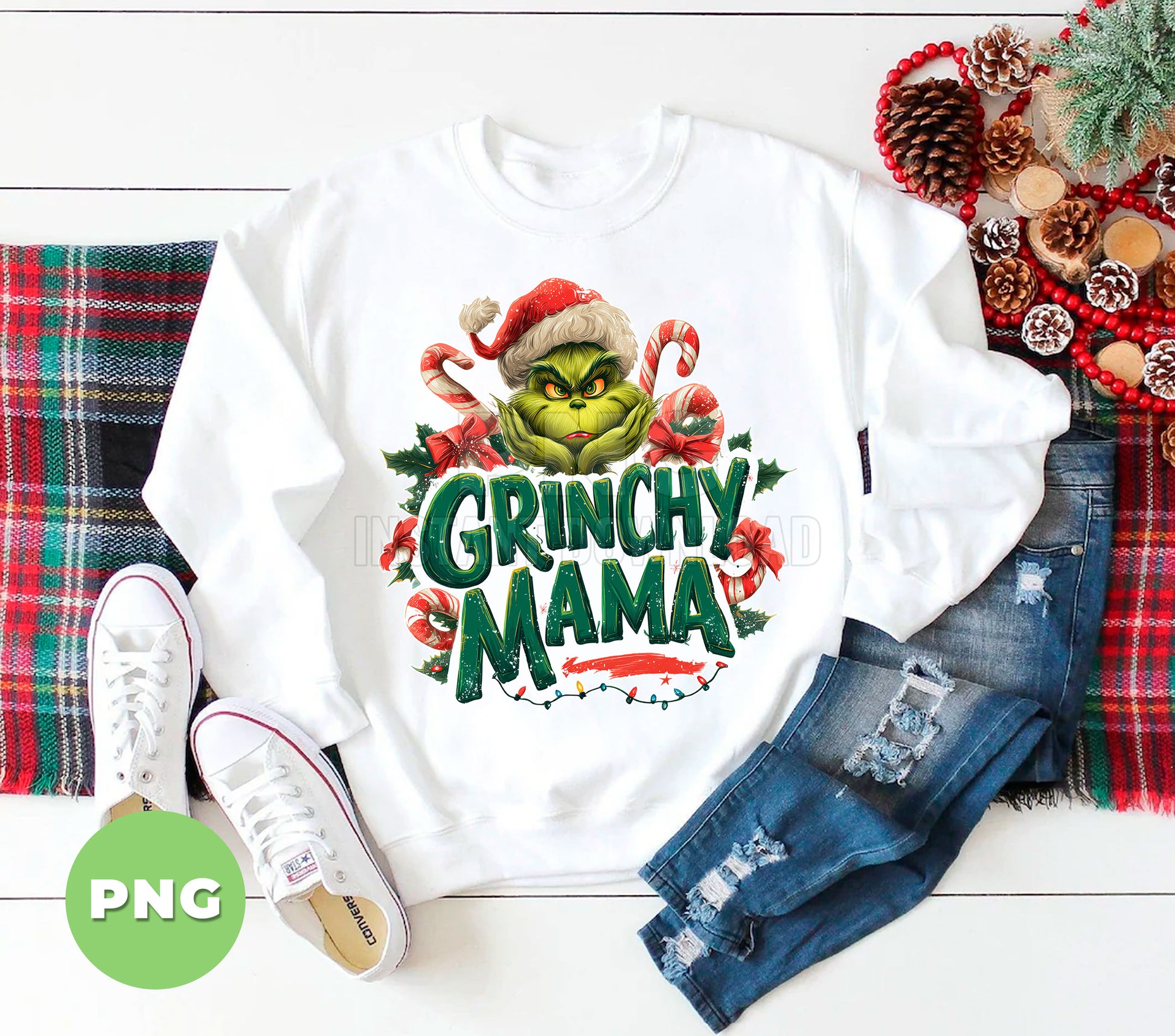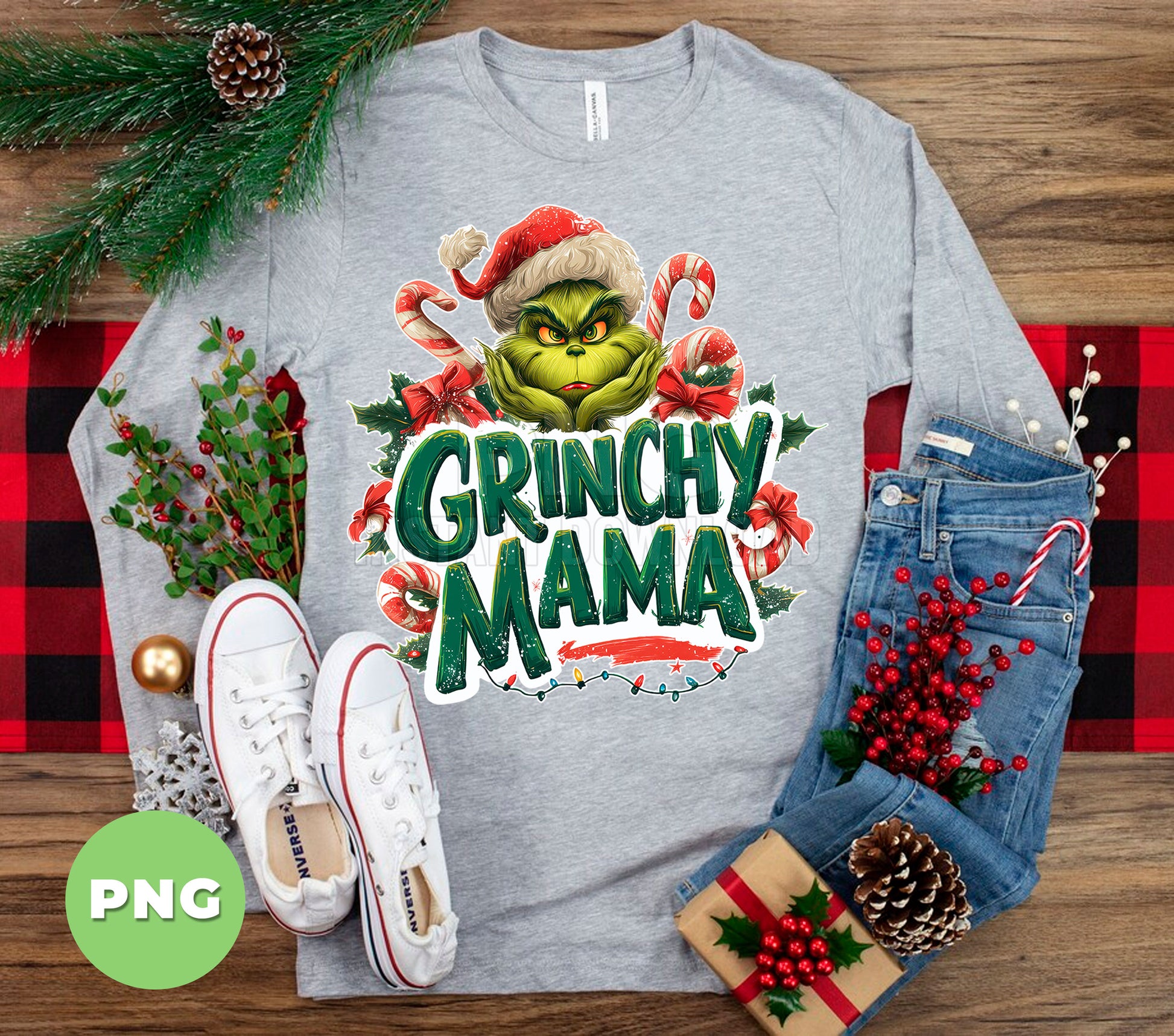 Bring holiday cheer with a playful twist using this Grinchy Mama PNG! Featuring a mischievous green Grinch face alongside festive candy cane lights, this sublimation design adds humor and fun to any Christmas project. Perfect for moms who love to celebrate the season with a little attitude, this digital download is ideal for creating custom apparel, decorations, and more.