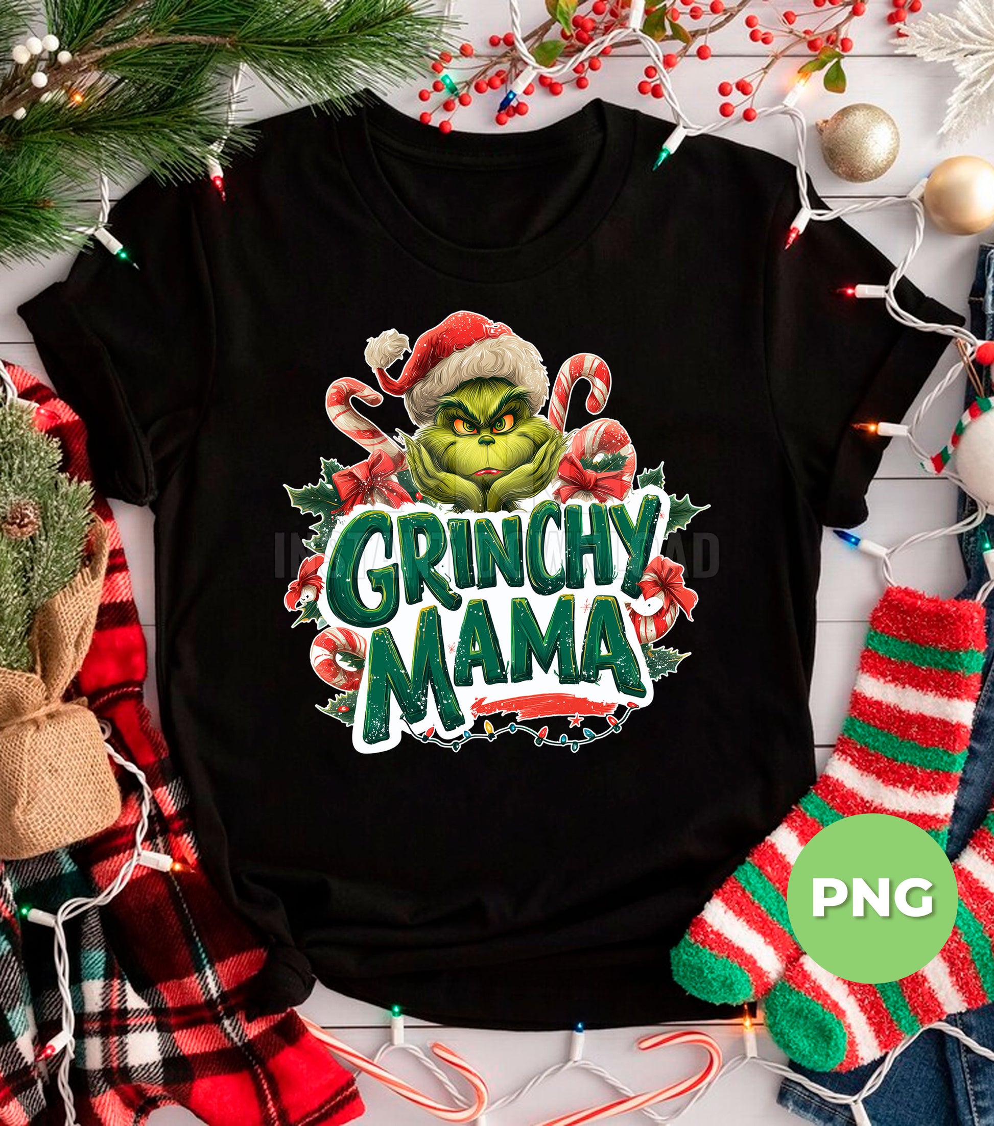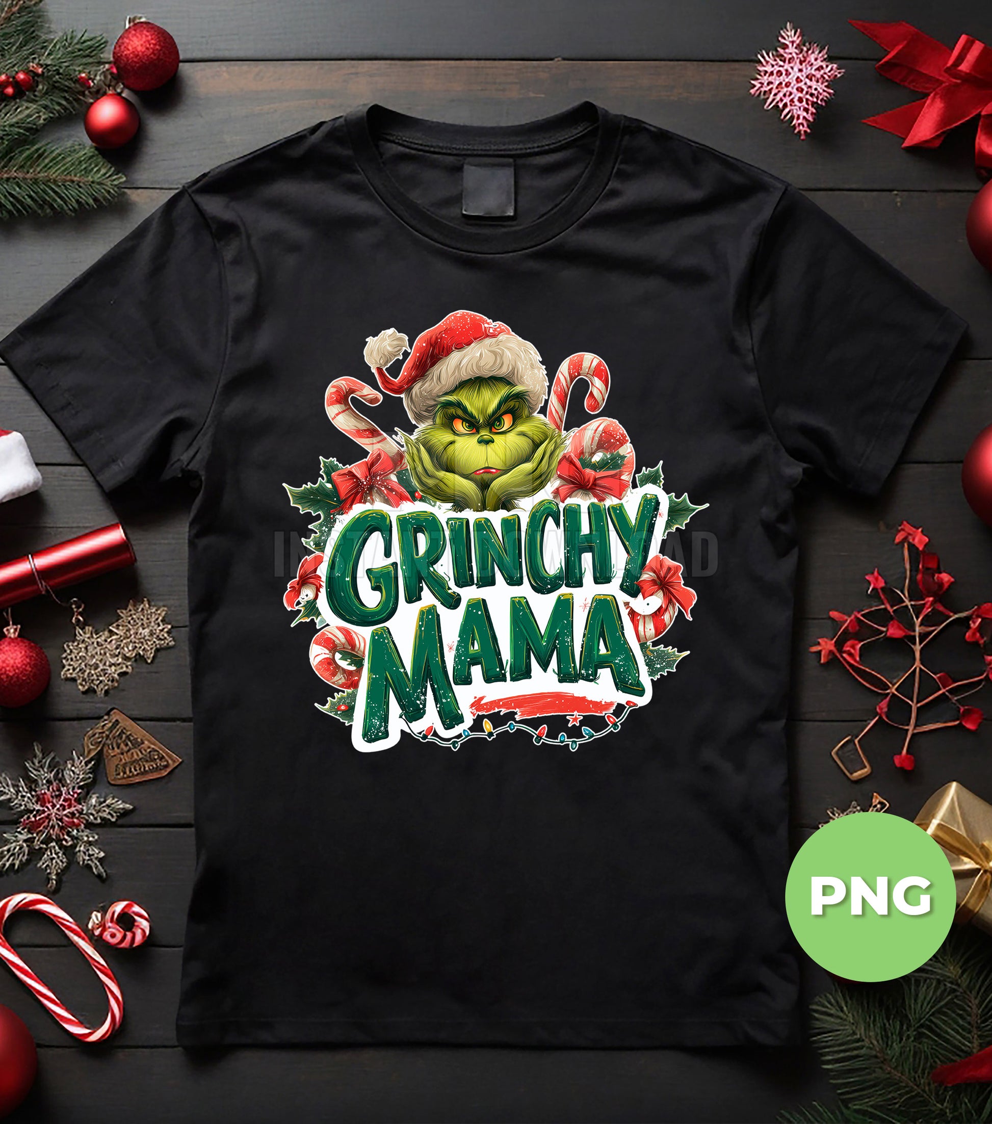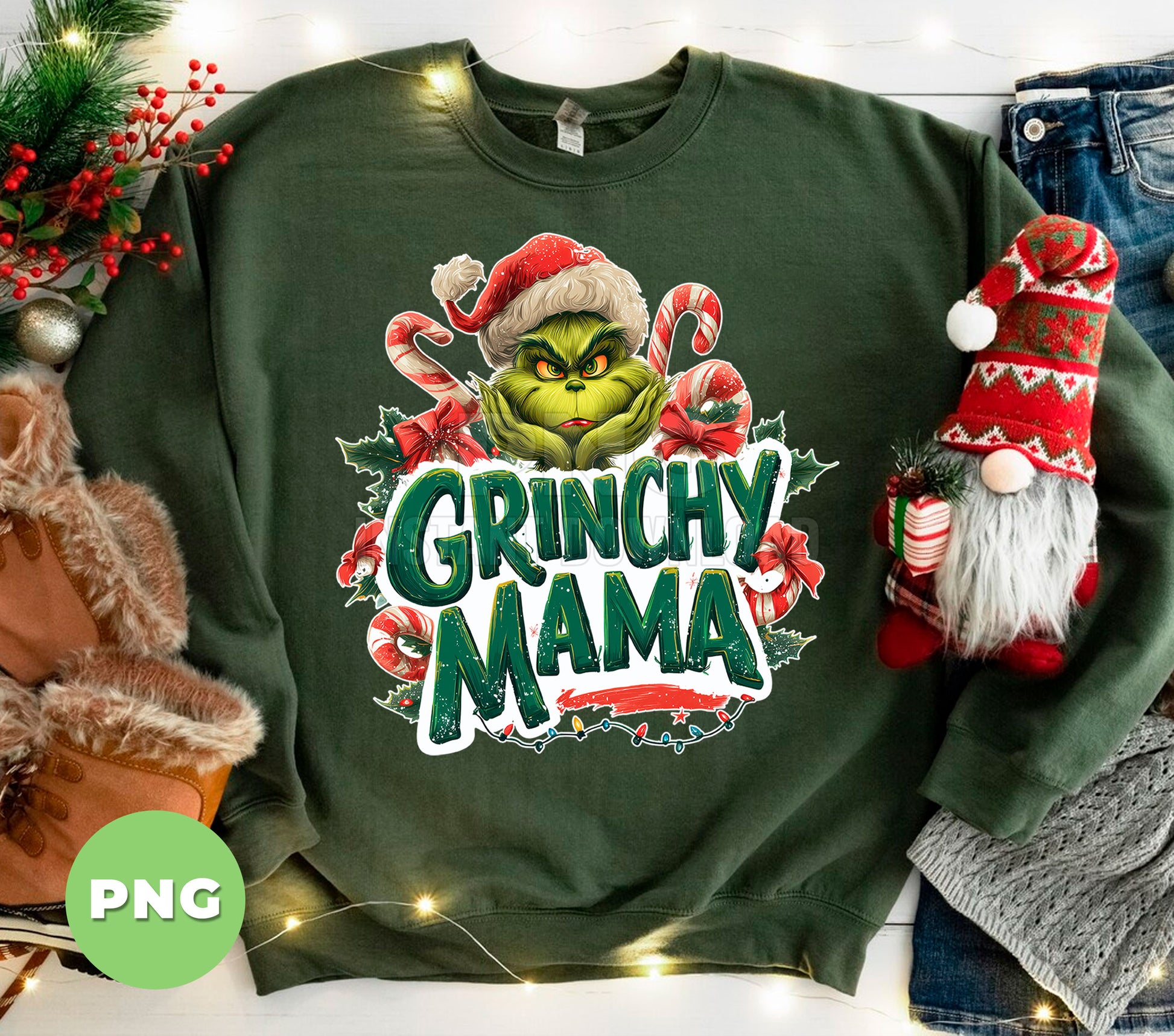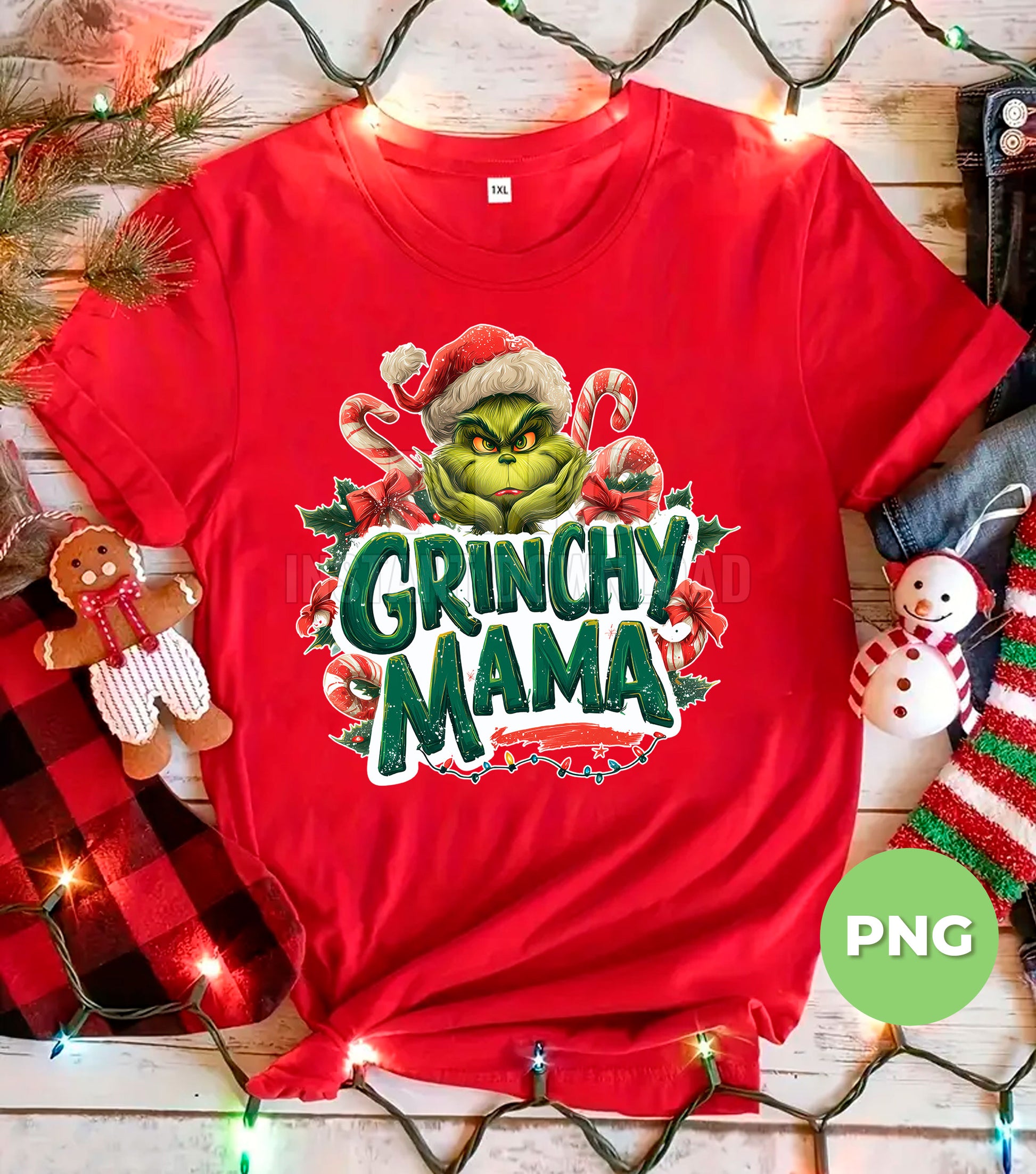 Bring holiday cheer with a playful twist using this Grinchy Mama PNG! Featuring a mischievous green Grinch face alongside festive candy cane lights, this sublimation design adds humor and fun to any Christmas project. Perfect for moms who love to celebrate the season with a little attitude, this digital download is ideal for creating custom apparel, decorations, and more.