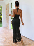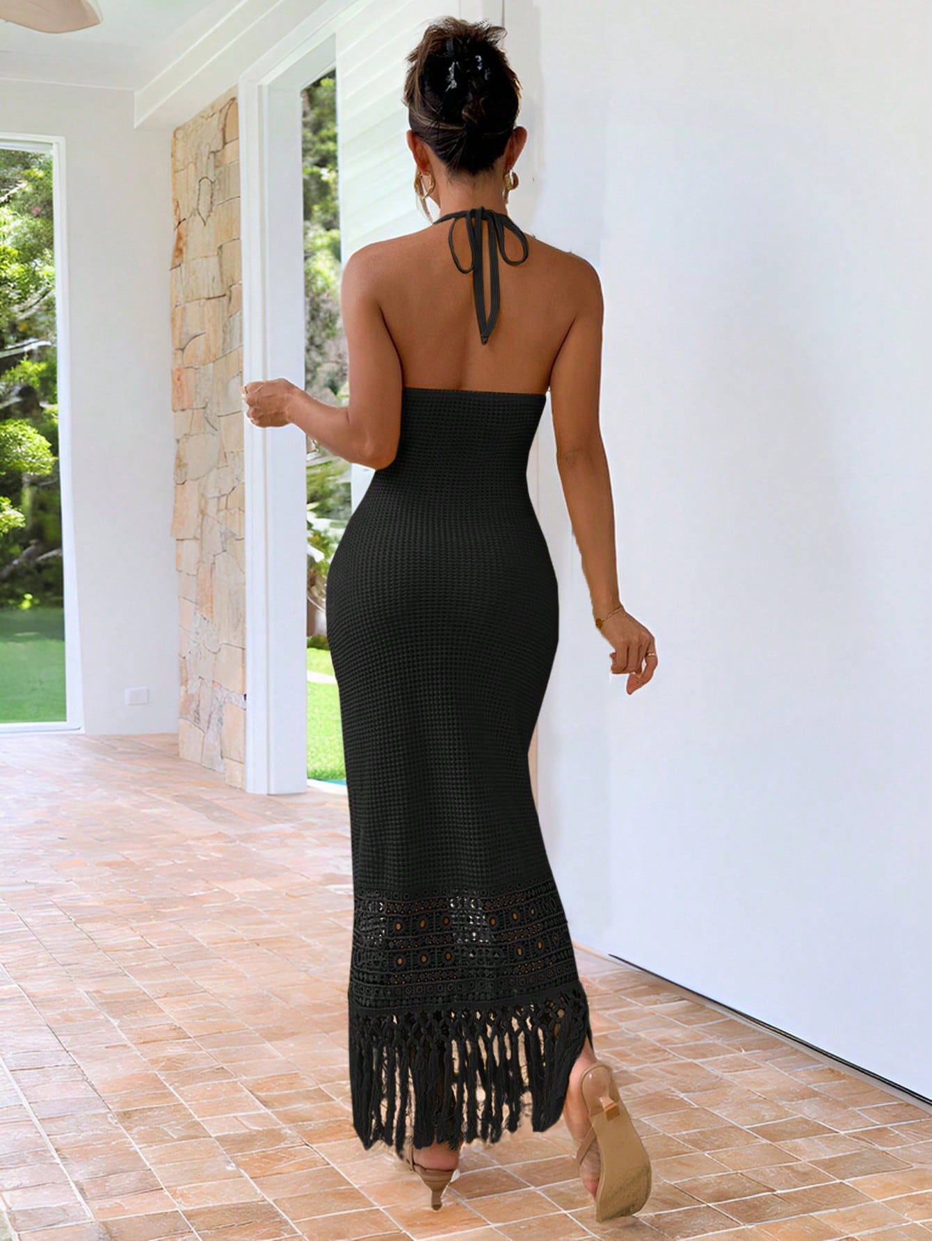 Halter Neck Elegance: Sleeveless Women's Casual Dress with Fringed Hem