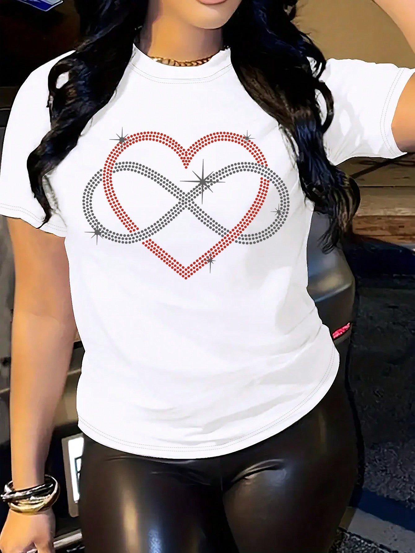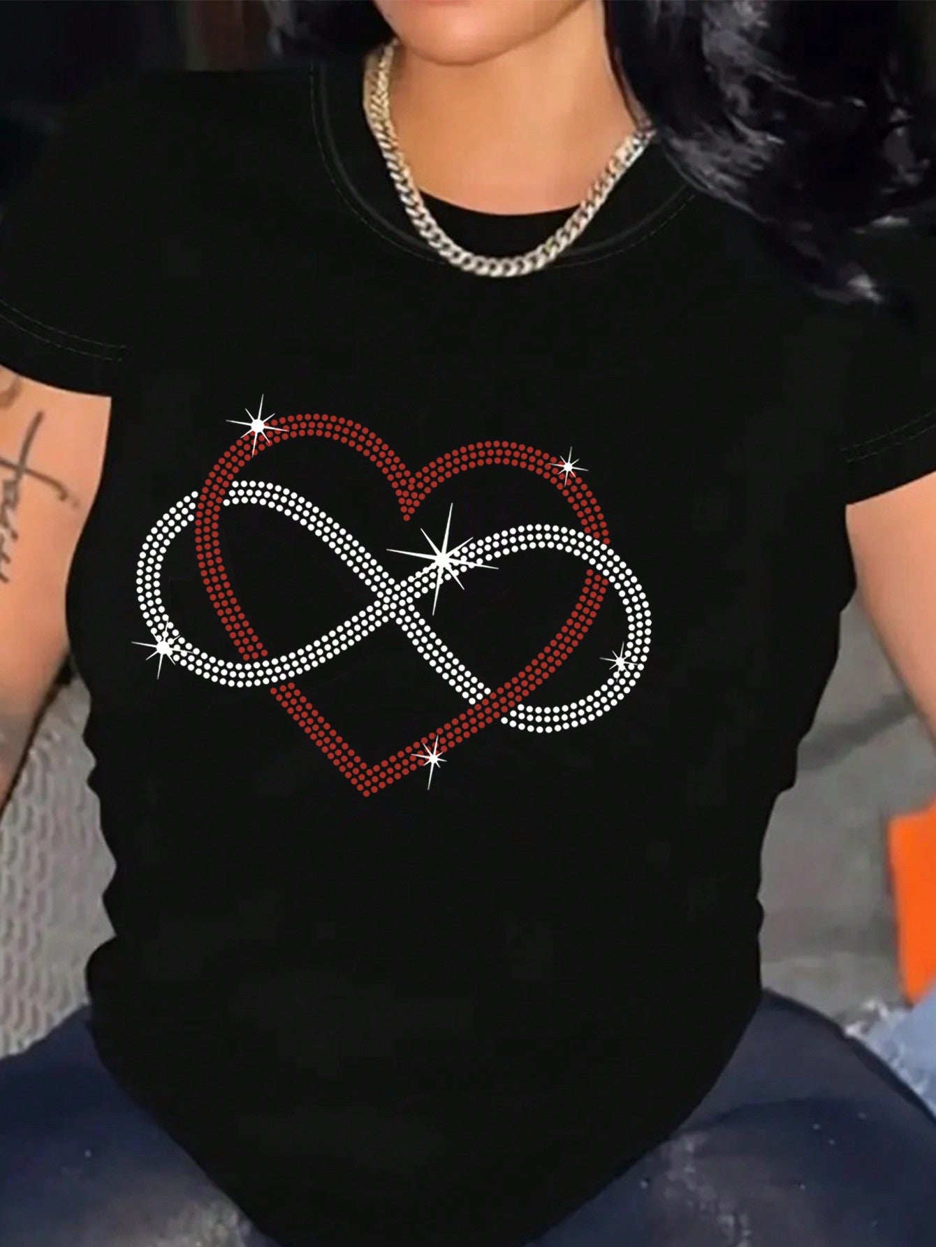 Elevate your style with the Heartfelt Glamour T-Shirt. Adorned with rhinestone-embellished heart patterns, this tee adds a touch of glamour to any outfit. Crafted for women who want to make a statement, it's the perfect combination of comfort and sophistication. Stand out with the Heartfelt Glamour T-Shirt.