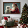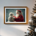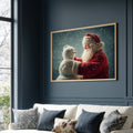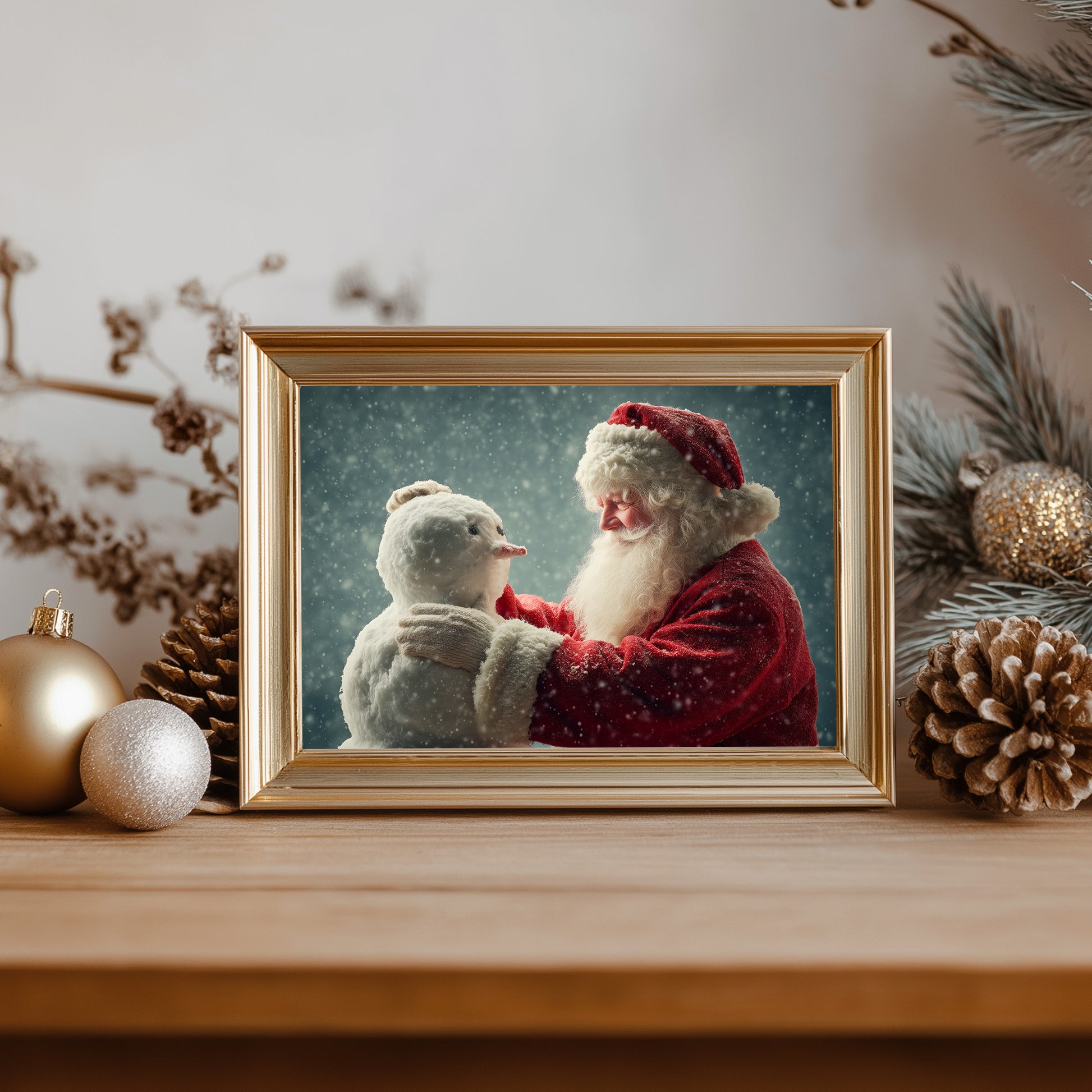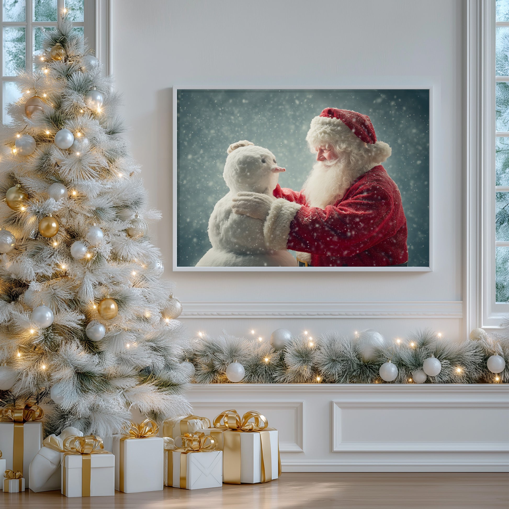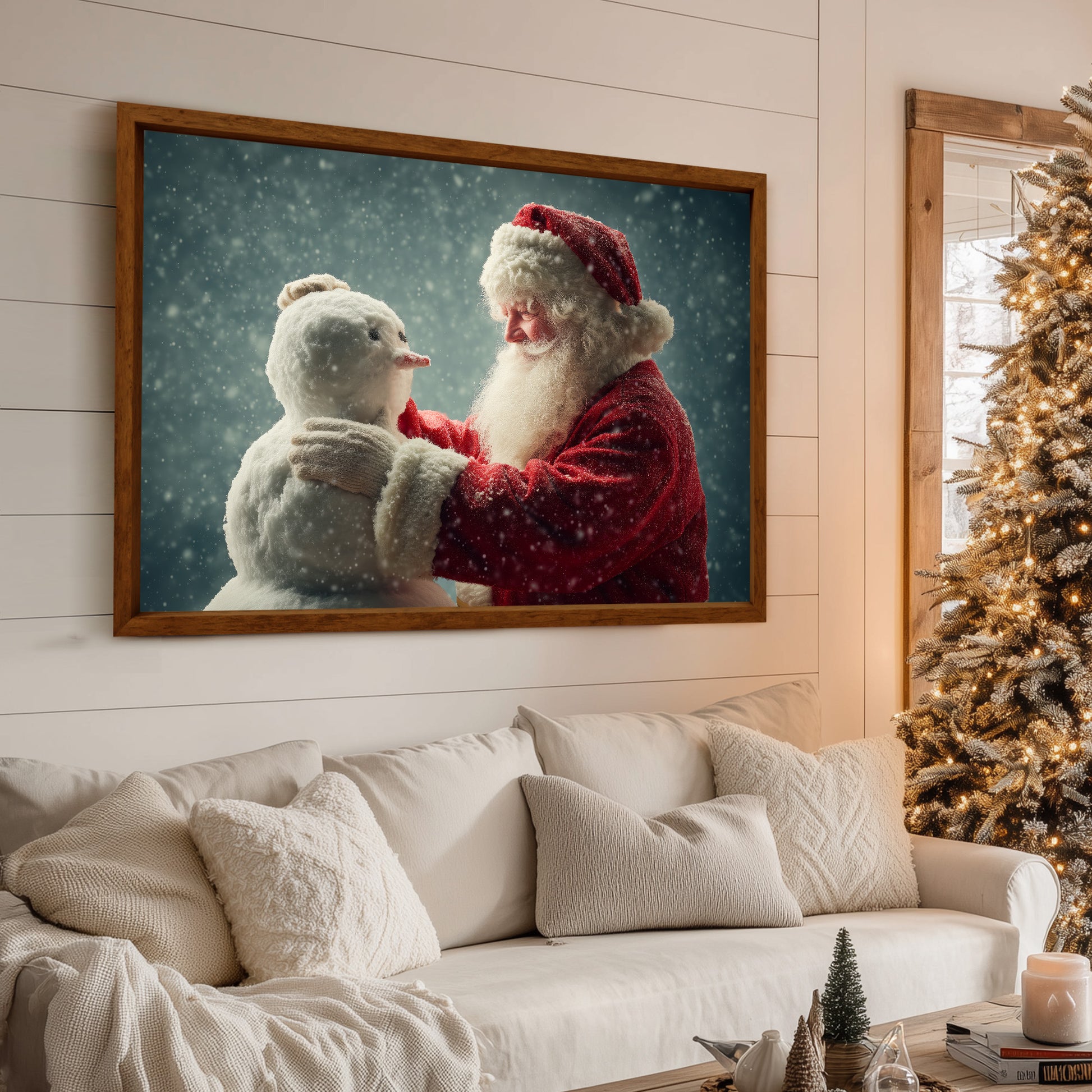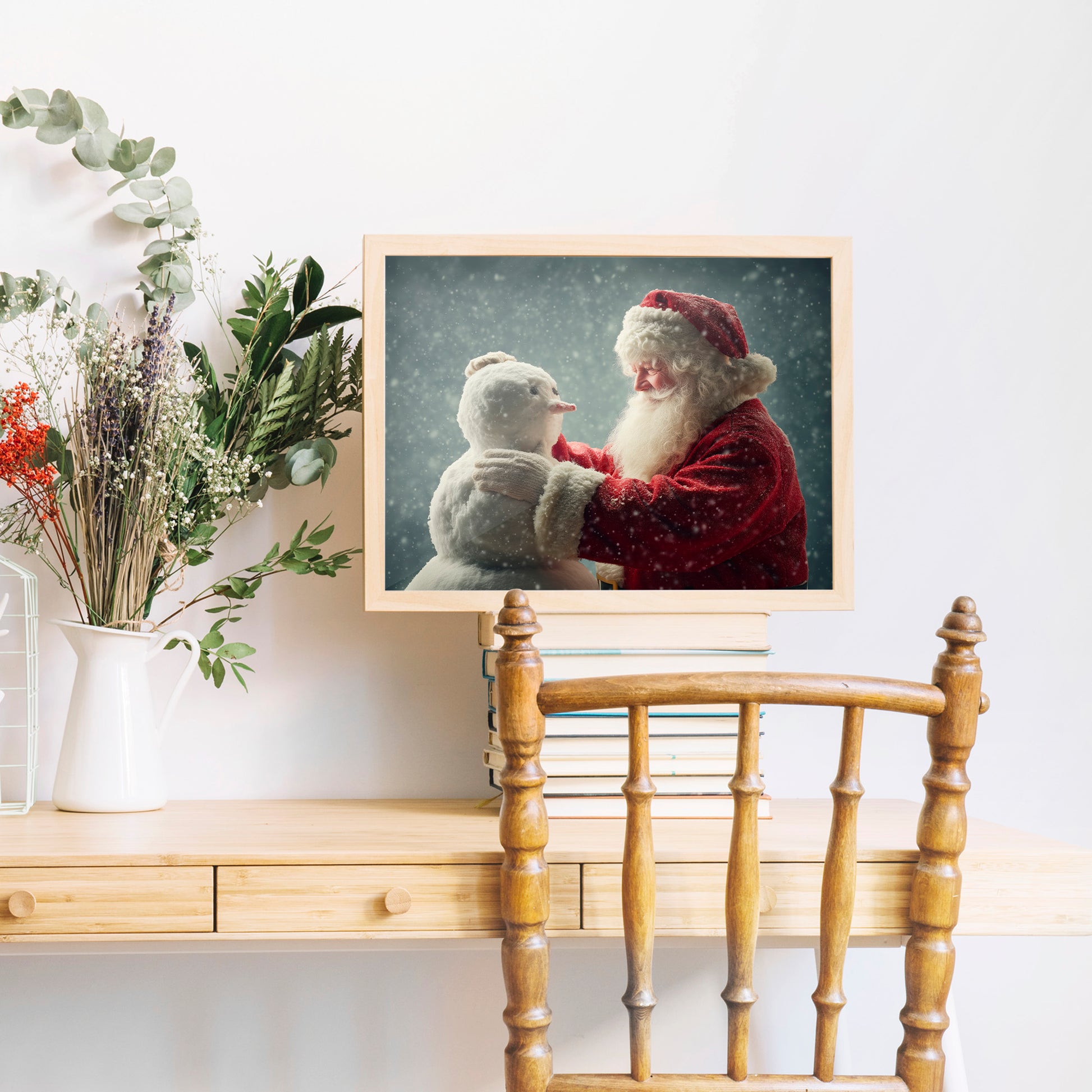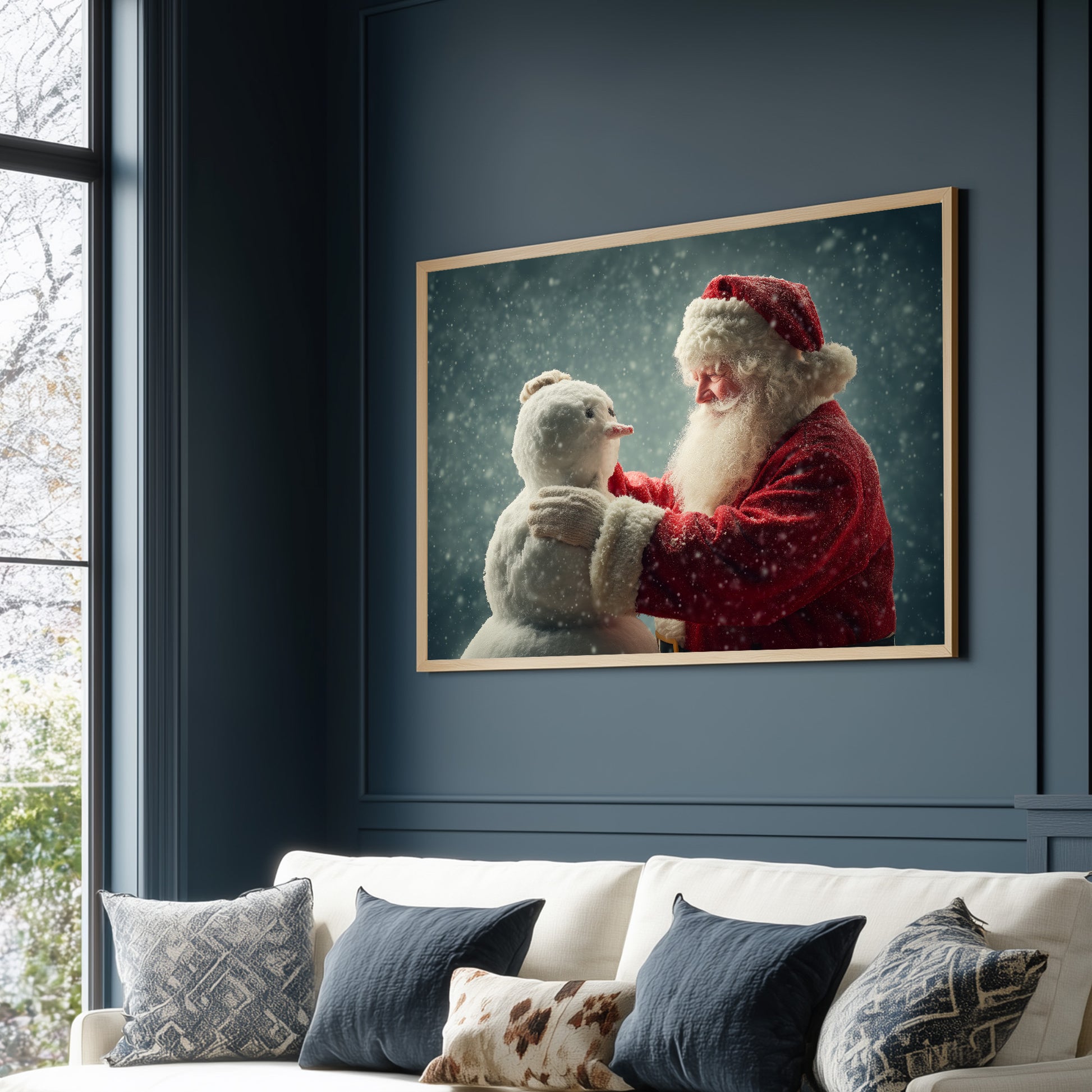 This charming artwork captures a tender winter moment as Santa lovingly shapes a snowman beneath a gentle snowfall. The soft lighting, warm textures, and classic red suit create a nostalgic Christmas atmosphere filled with peace and joy. Perfect for adding festive warmth to living rooms, nurseries, entryways, and holiday displays. Ideal as a seasonal gift, Christmas print, winter wall decor, or cozy home decoration for anyone who loves magical holiday scenes.