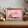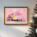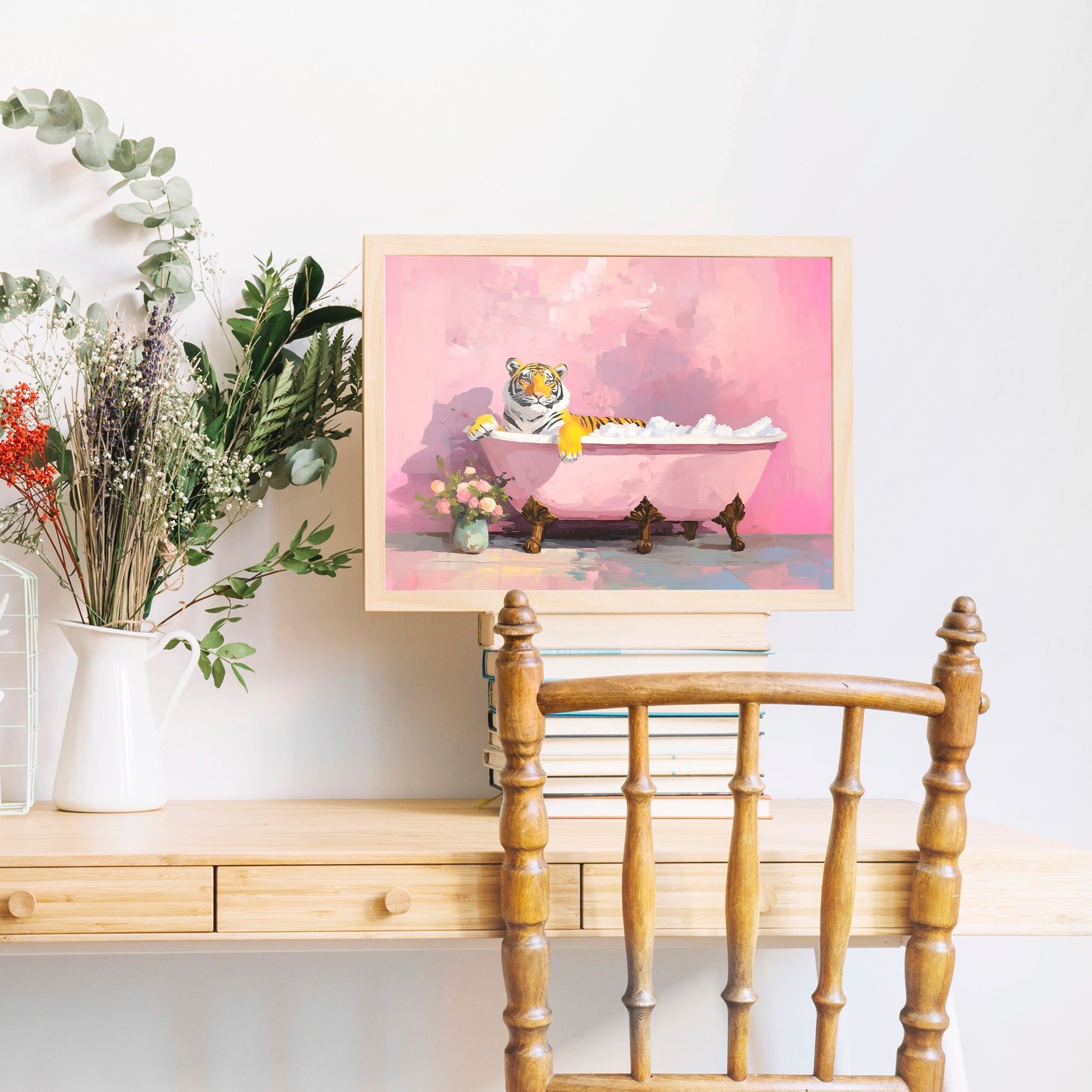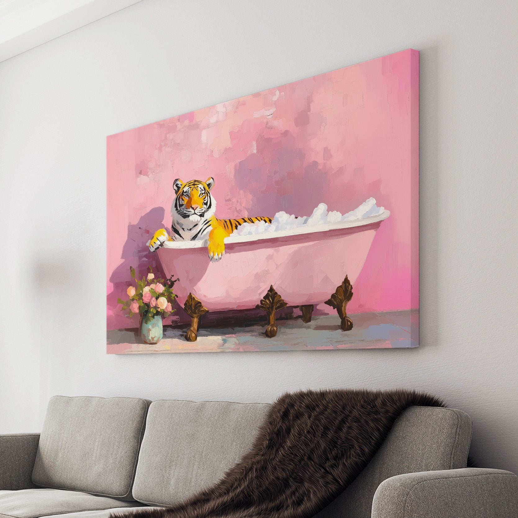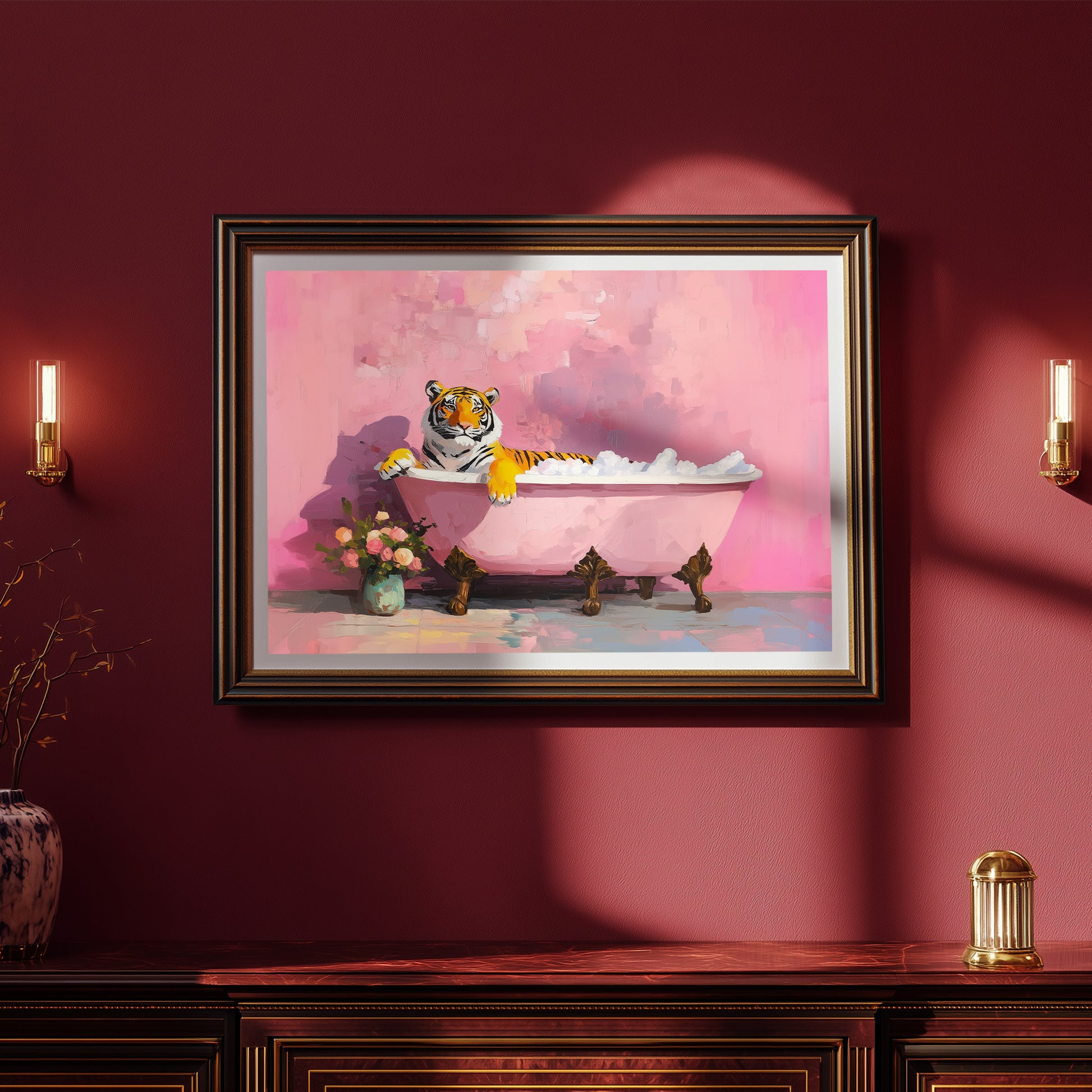 Humorous And Chic Pop Art Painting Of A Majestic Tiger Relaxing In A Bubble Bath In A Vintage Pink Clawfoot Tub