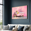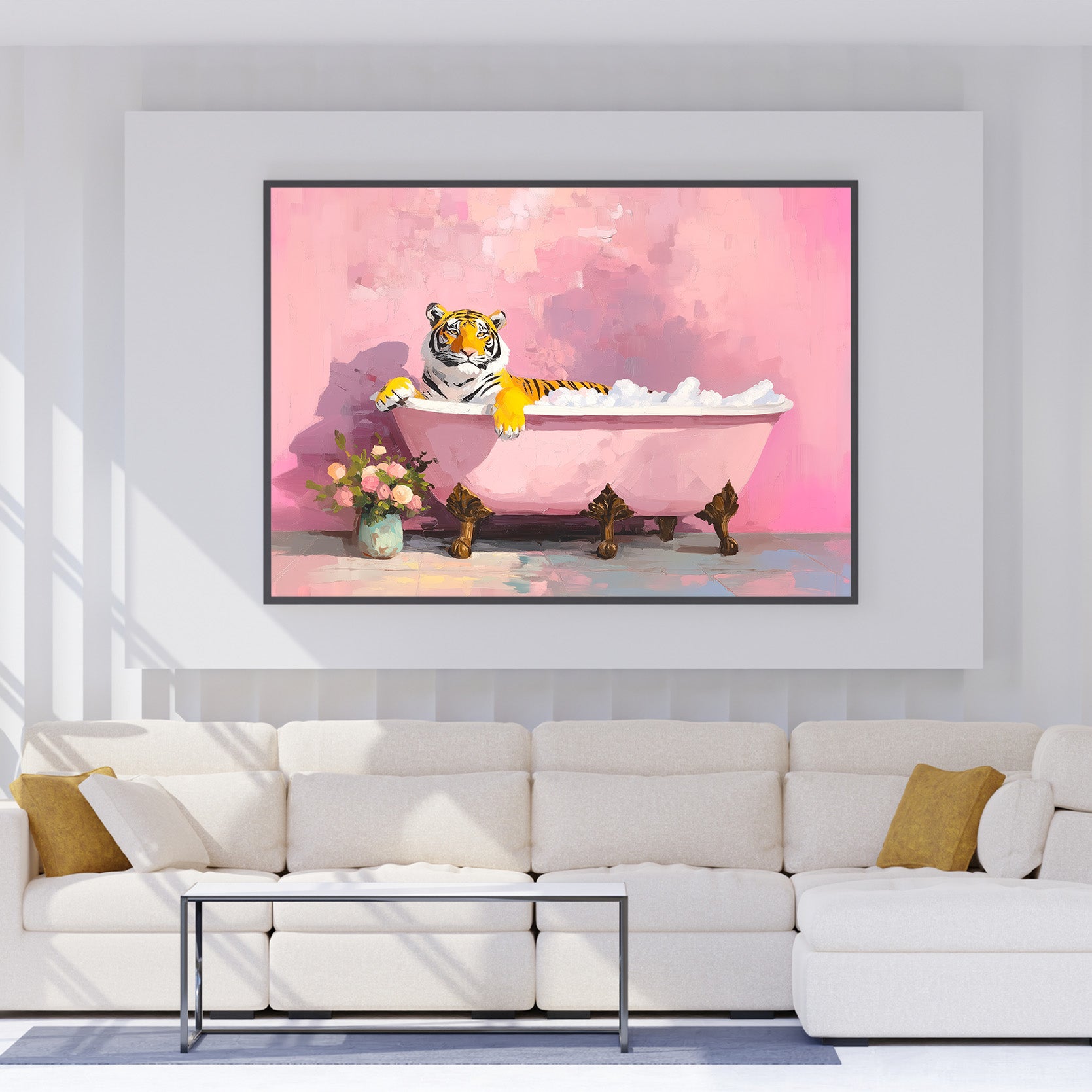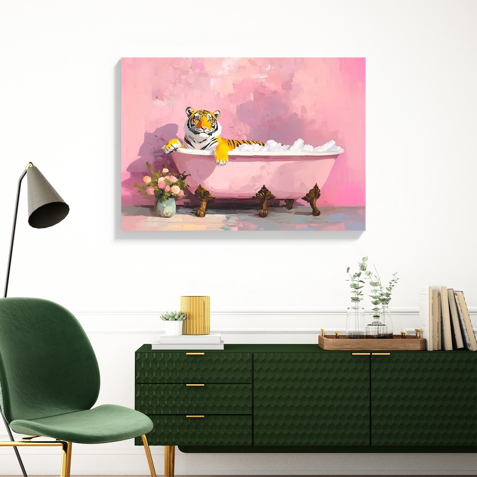 A witty and stylish painting that combines wildlife grandeur with domestic whimsy. A majestic orange and black striped tiger is shown lounging comfortably in a pastel pink clawfoot bathtub, submerged in luxurious white bubbles. The background is a soft, painted pink cloudscape, enhancing the playful and dreamlike quality of the scene. A small vase of soft pink flowers sits on the side, adding an element of chic femininity. The artwork features bold, visible brushstrokes and a Pop Art sensibility, making it an excellent statement piece for modern, humorous, or eclectic decor.