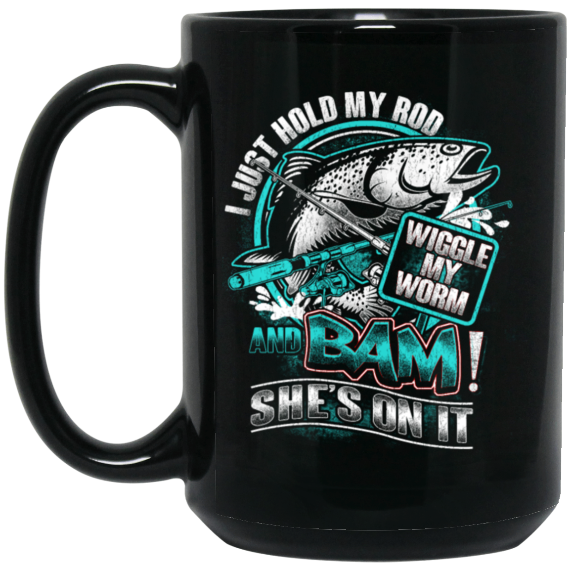 I Just Hold My Rod, And Bam! She's On It, Wiggle My Worm, Love Fishing Black Mug