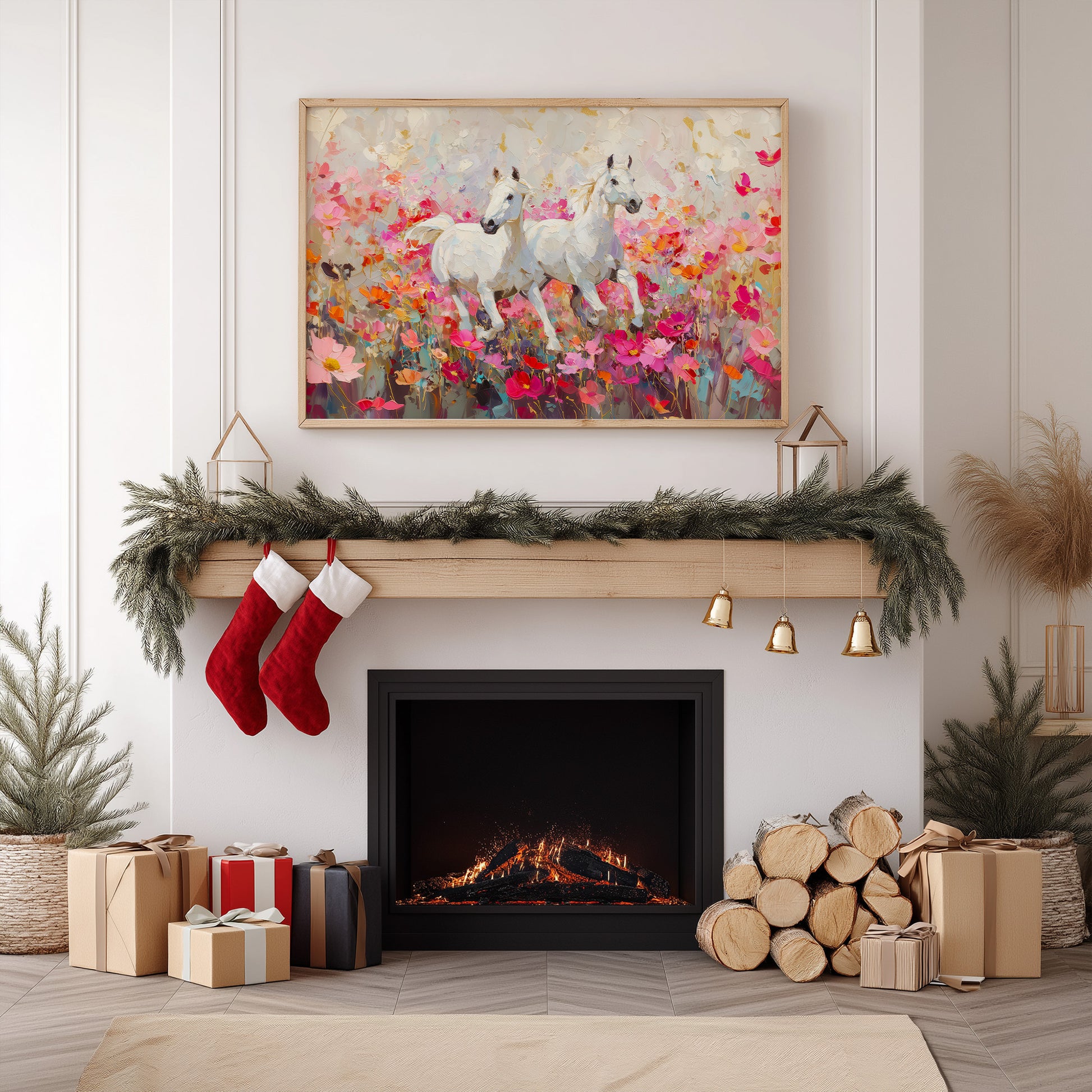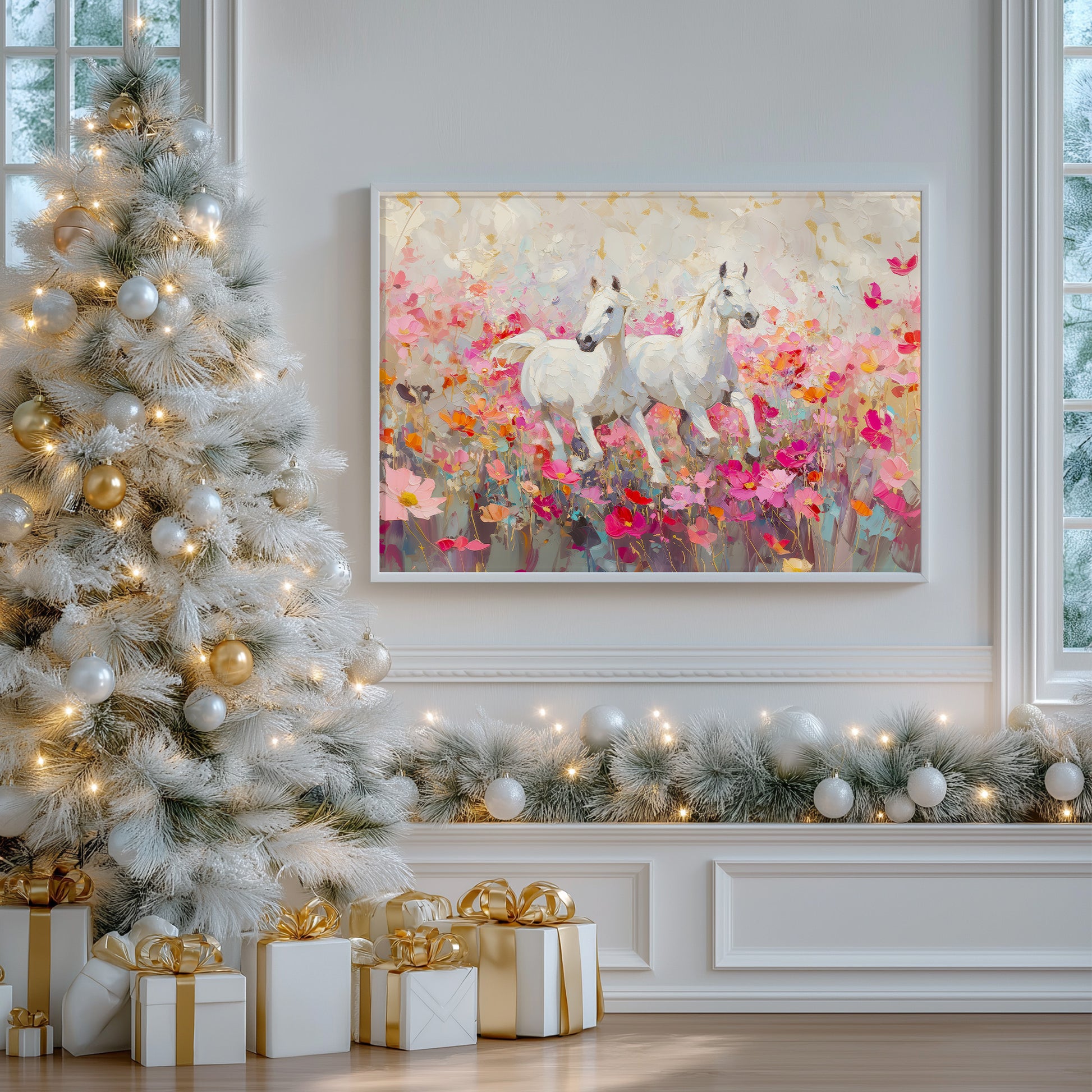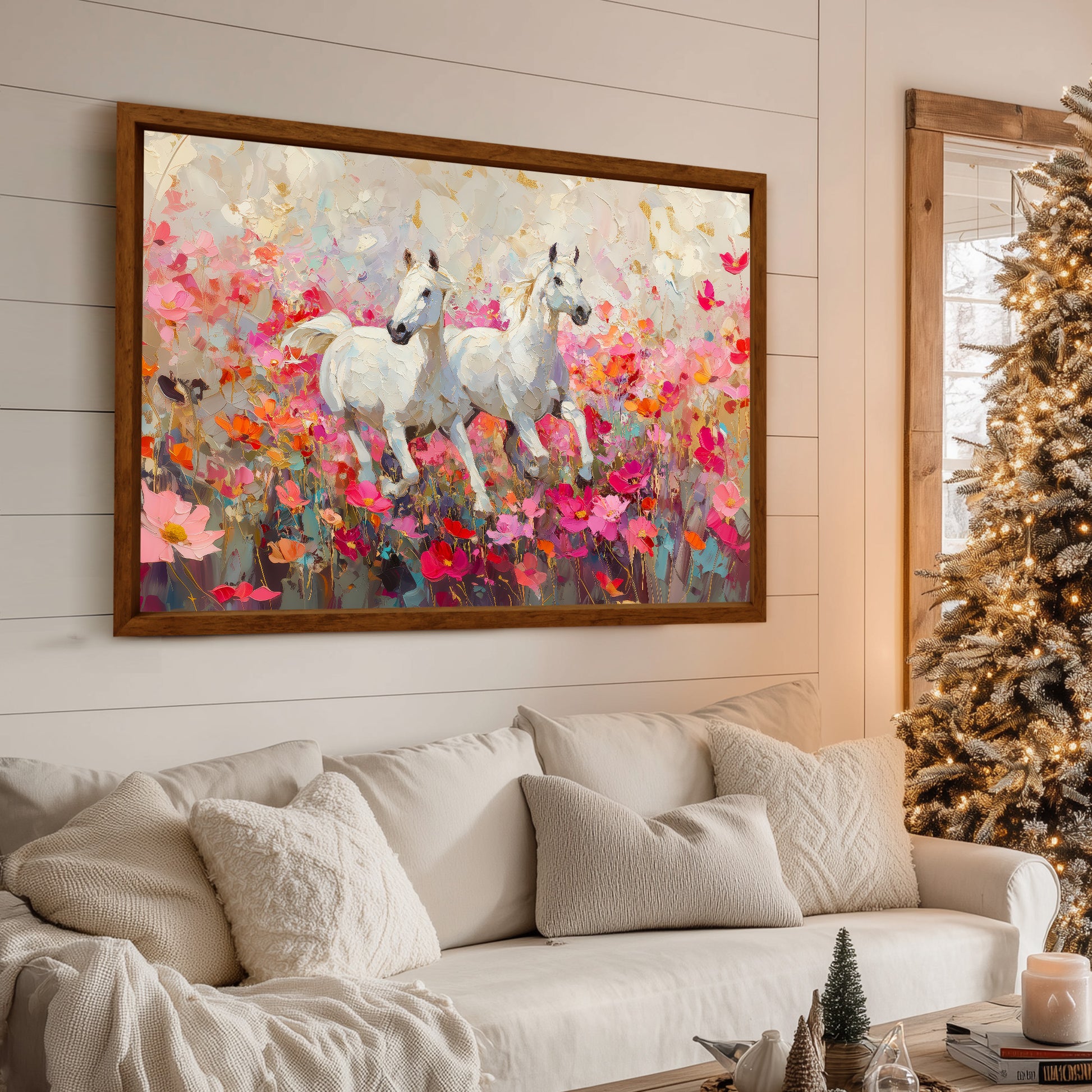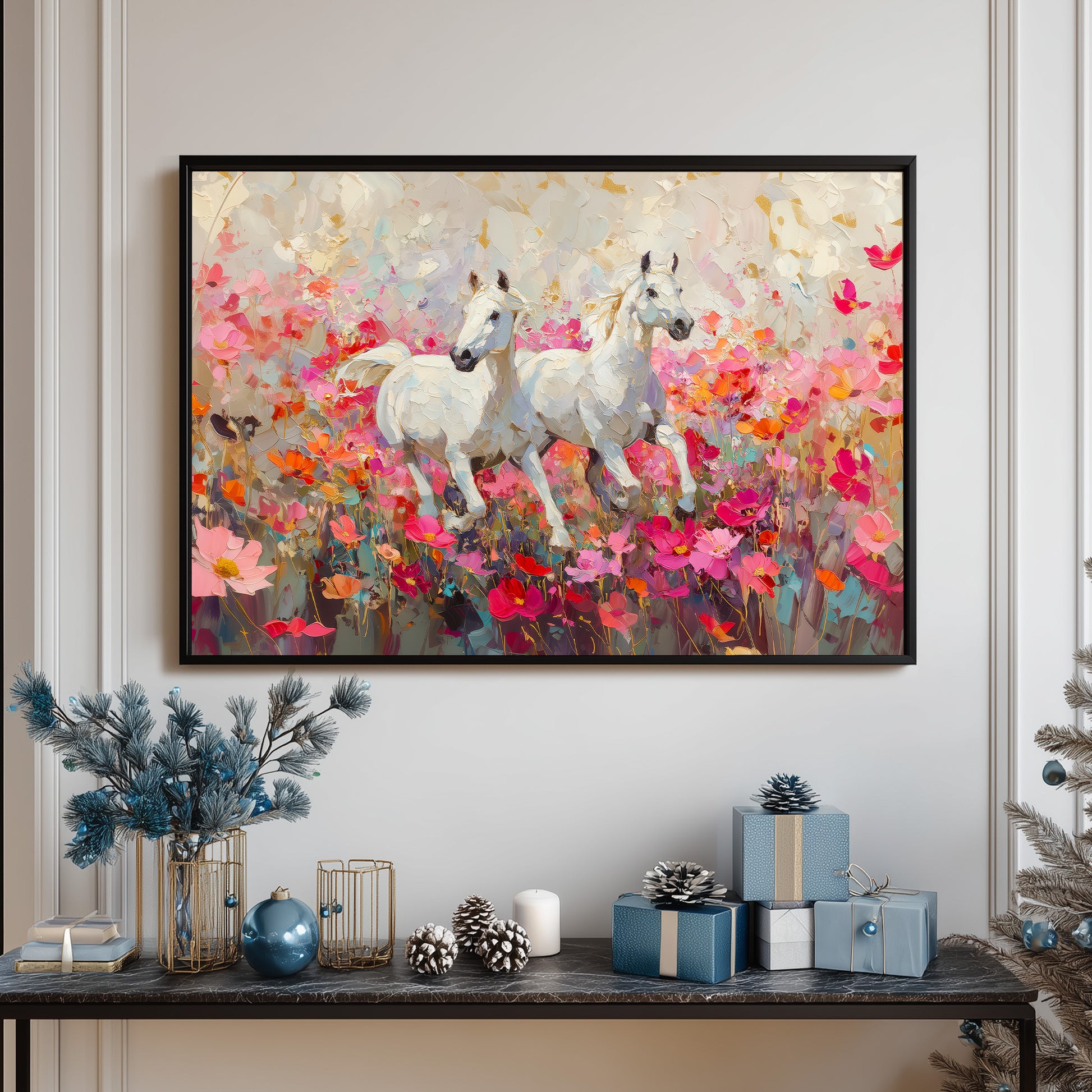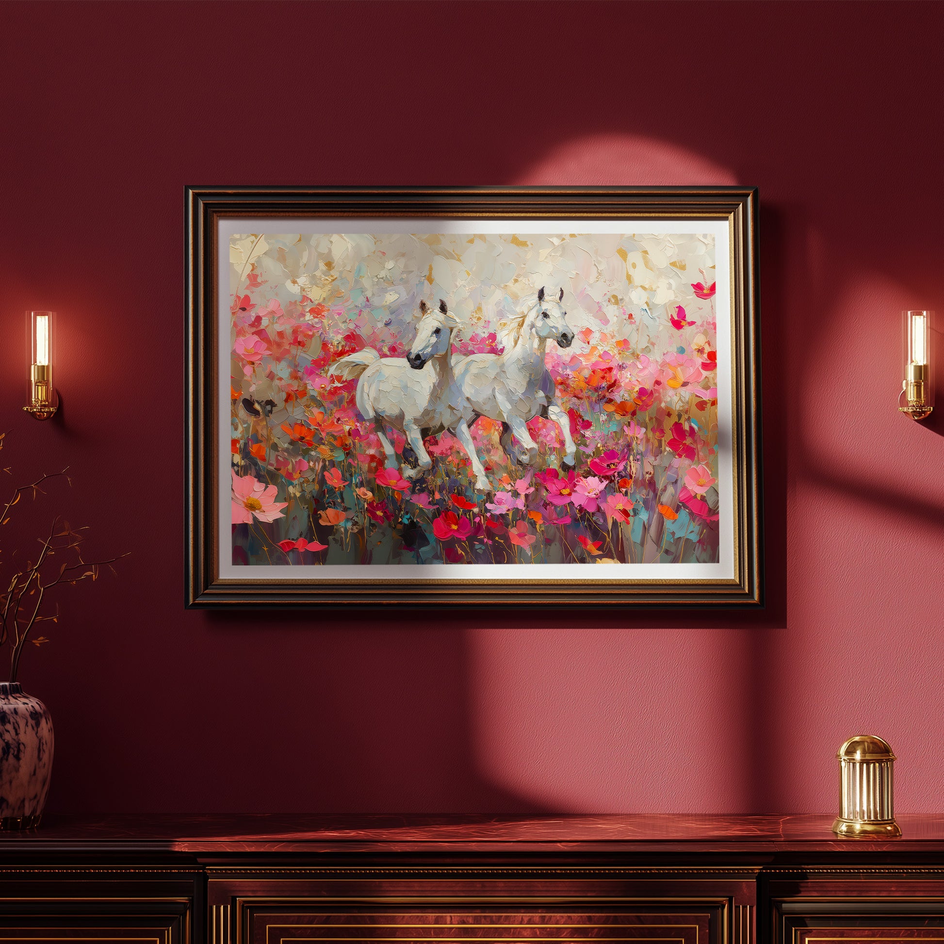 A stunning and energetic impasto oil painting depicting two majestic white horses galloping through a lush field of pink, red, and orange wildflowers. The artwork features bold, textured brushstrokes and a rich palette of warm colors that create a sense of movement and freedom. The soft, neutral background enhances the vibrant floral foreground and the powerful silhouettes of the horses. This inspiring piece of equestrian art is perfect for adding a touch of natural beauty and dynamic energy to a living room, bedroom, or hallway, symbolizing strength, grace, and the spirit of the wild.