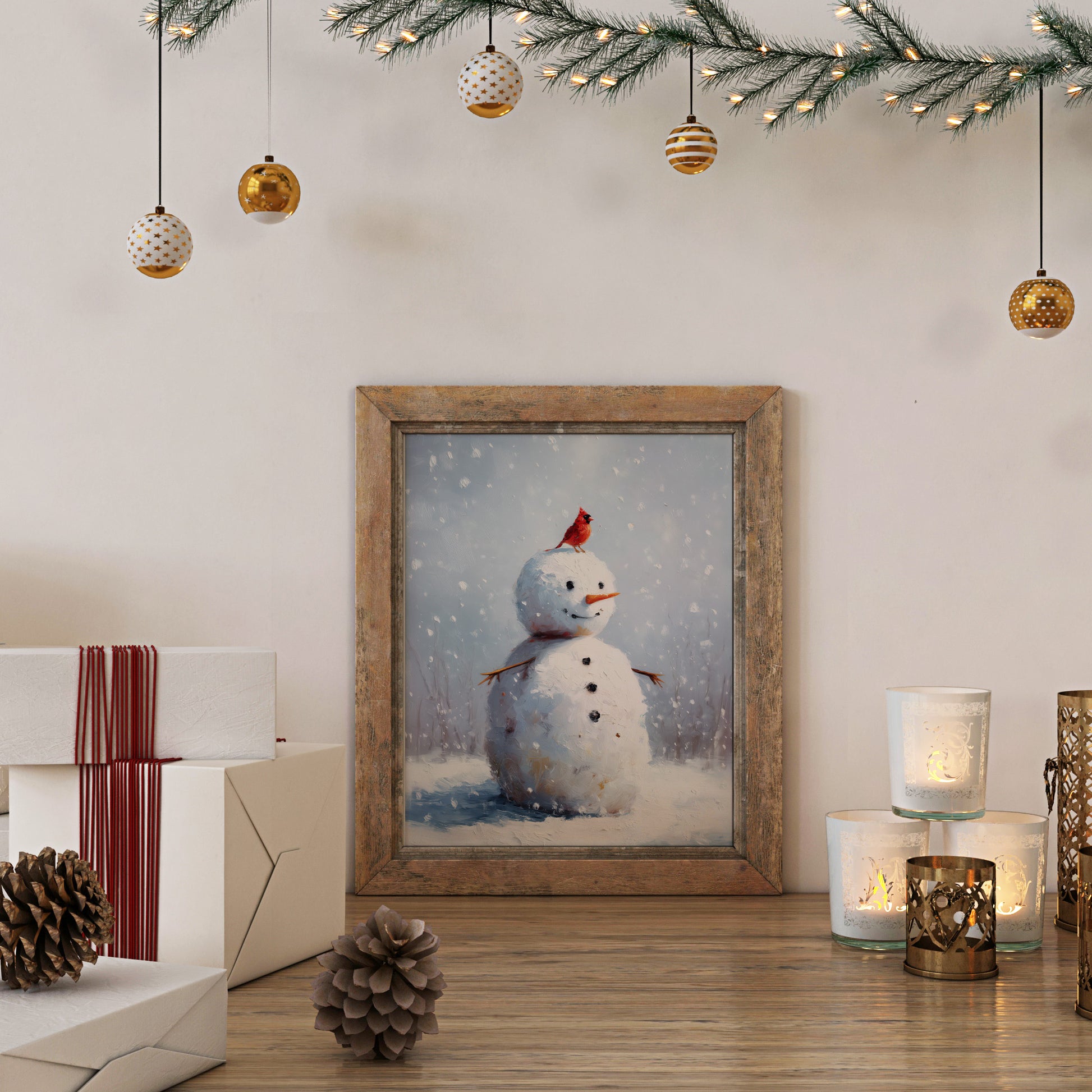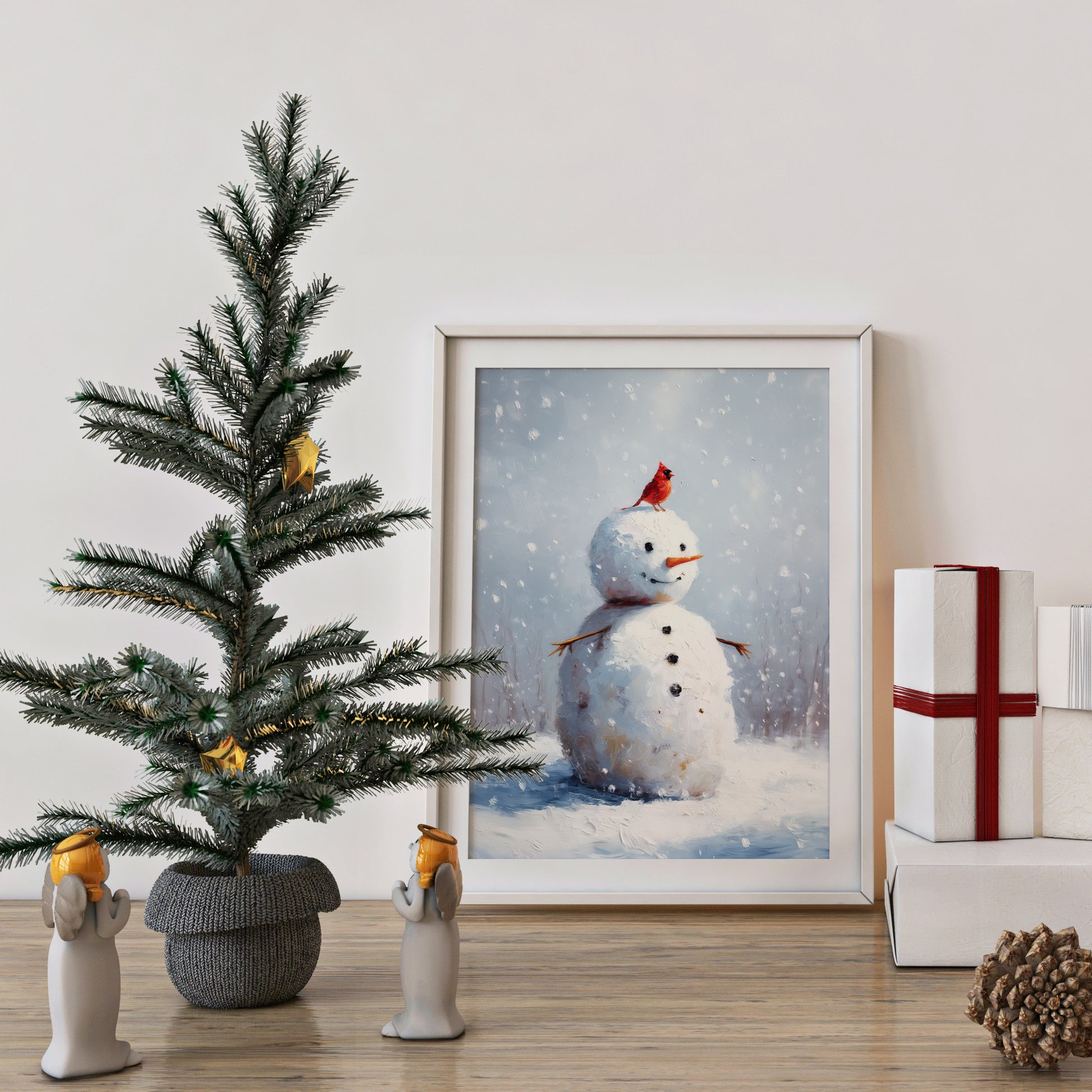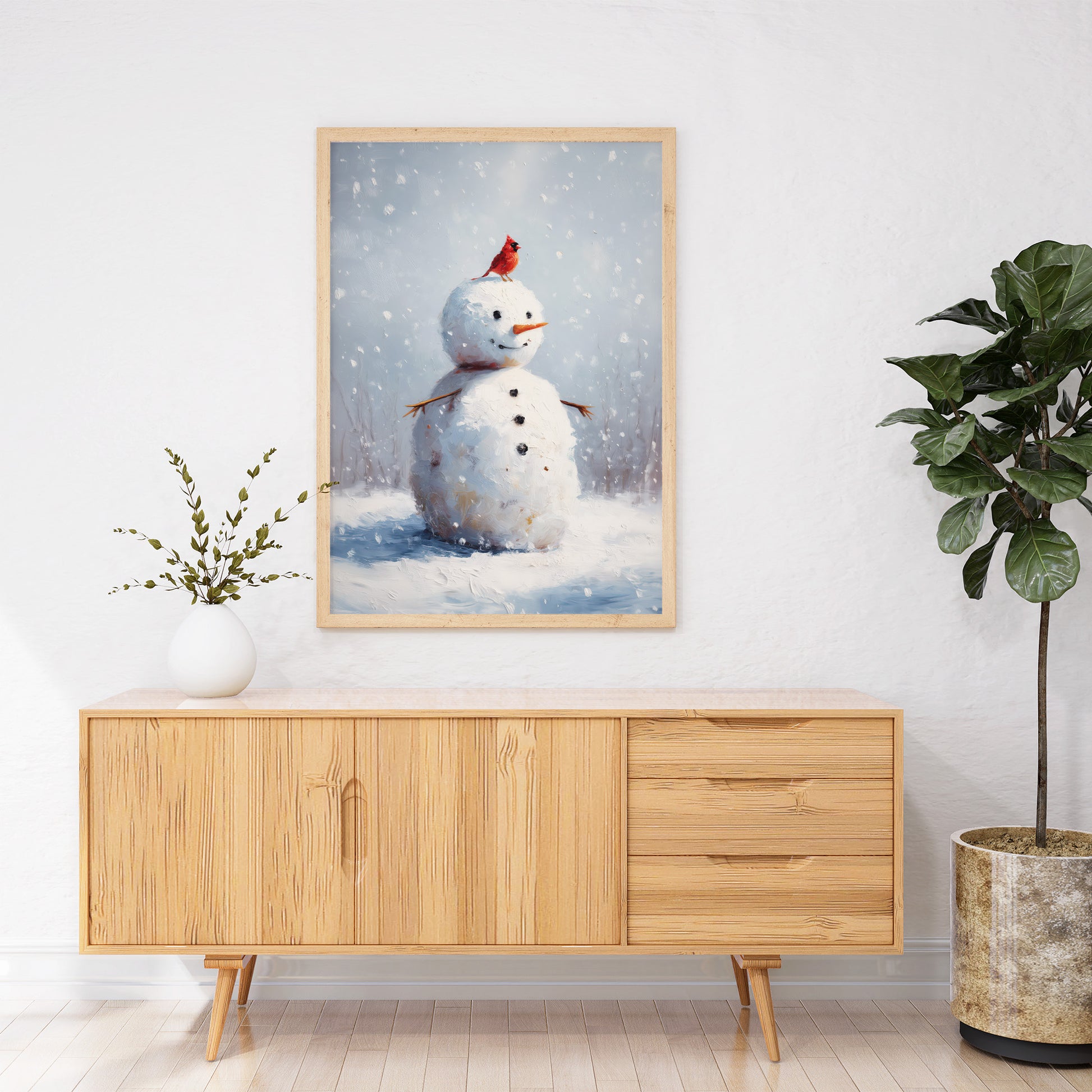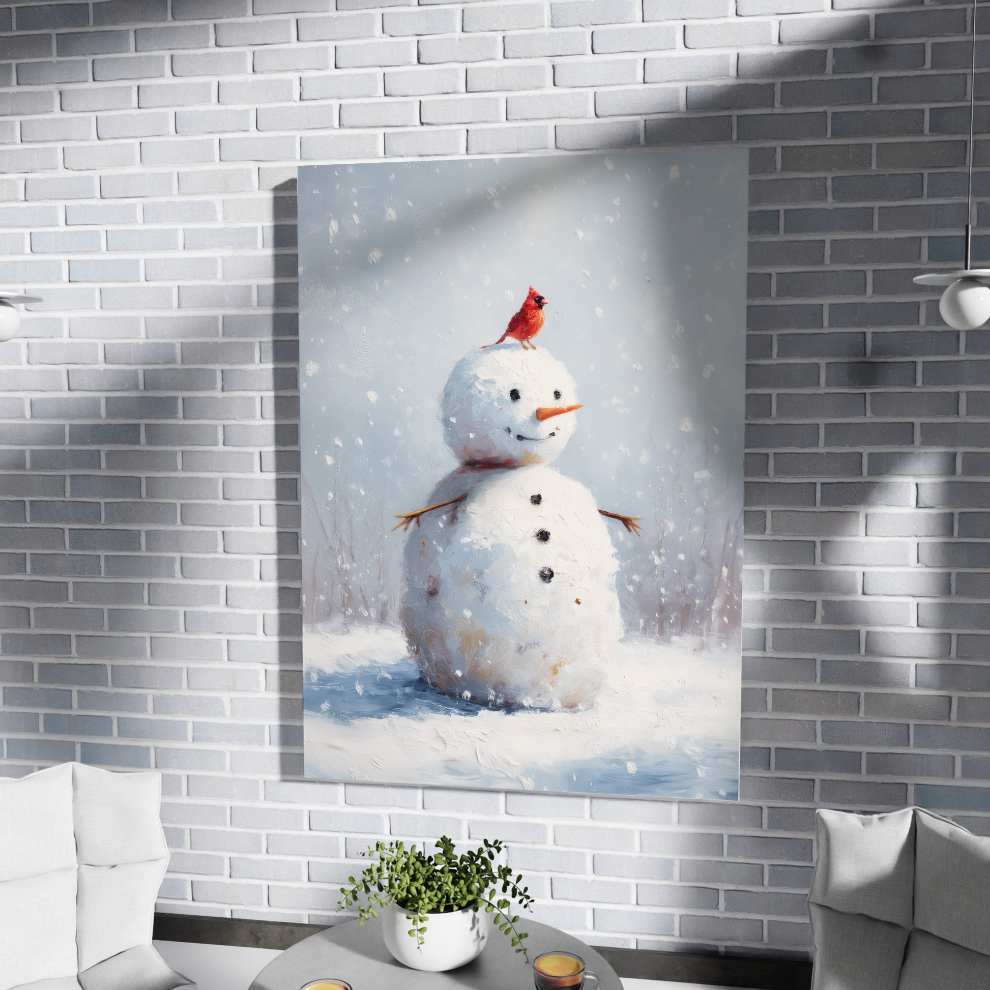 An enchanting and cheerful impressionist style painting of a classic two-ball snowman. The artwork is characterized by visible, textured brushstrokes, giving the snow a soft, heavy, and artistic quality. The snowman has traditional coal eyes, a carrot nose, and stick arms. Perched prominently on the snowman's head is a vibrant, bright red Cardinal bird, offering a stunning color contrast to the predominantly white and pale blue winter scene. The background is a soft, blurry forest with falling snow, emphasizing a cozy, magical, and festive winter atmosphere. This piece is perfect for holiday decor, winter themes, or art lovers who appreciate textured painting techniques.