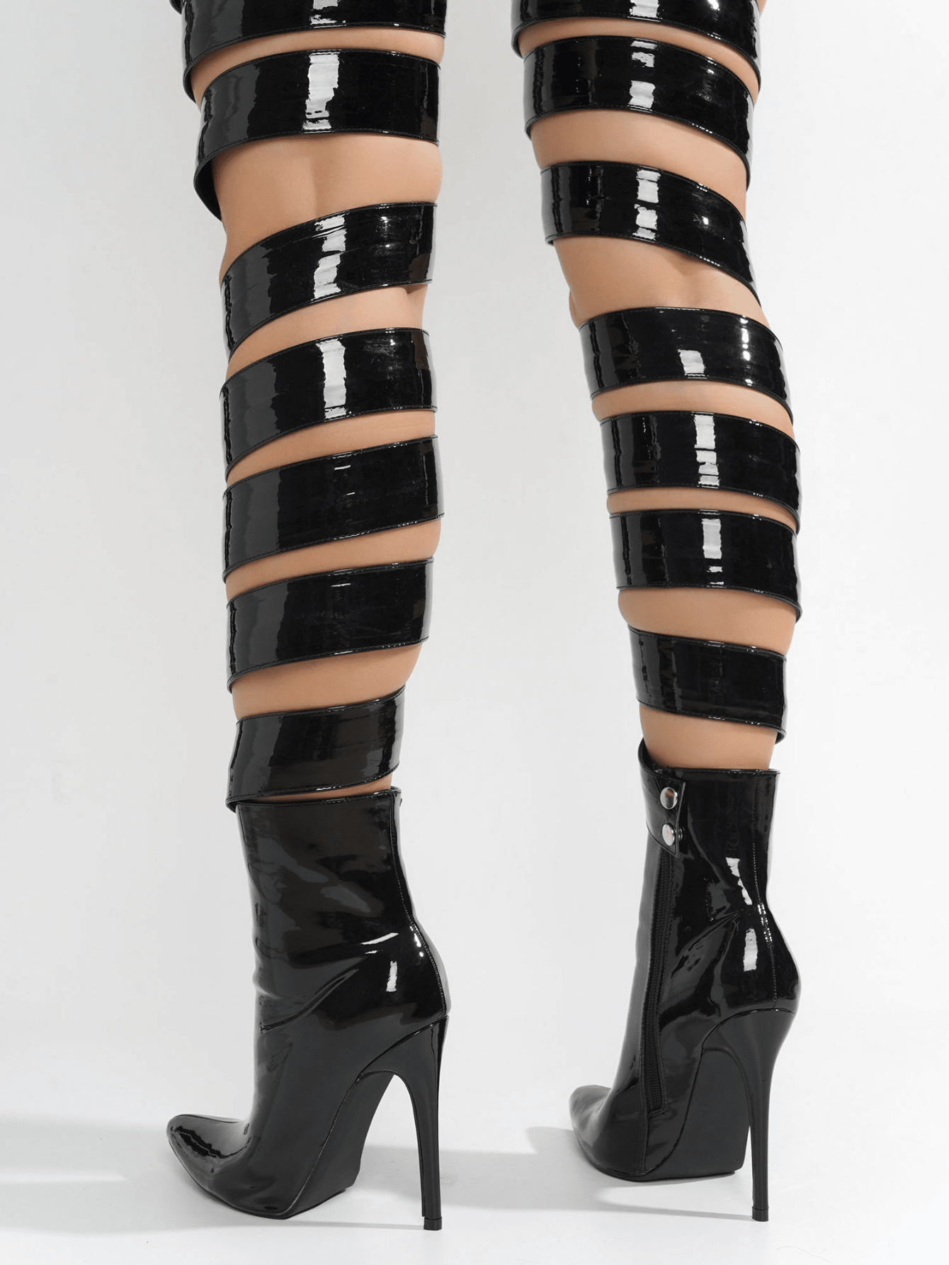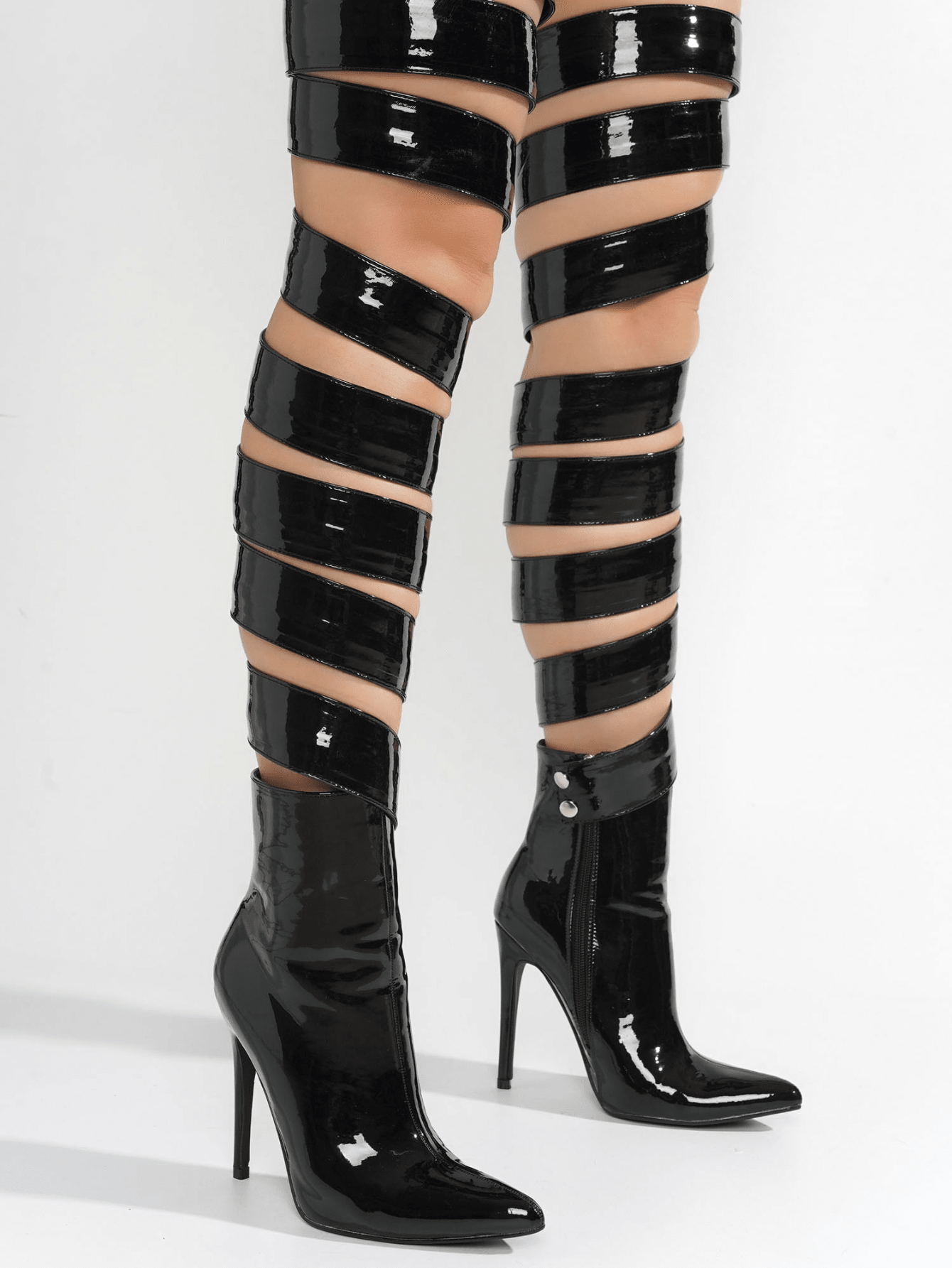 Elevate your style with our Lapel Thigh-High Wrap-Around Stiletto Heels. Crafted with precision, these heels feature a wrap-around design that accentuates your legs and a stiletto heel that adds height. Perfect for any occasion, these heels provide both fashion and function.