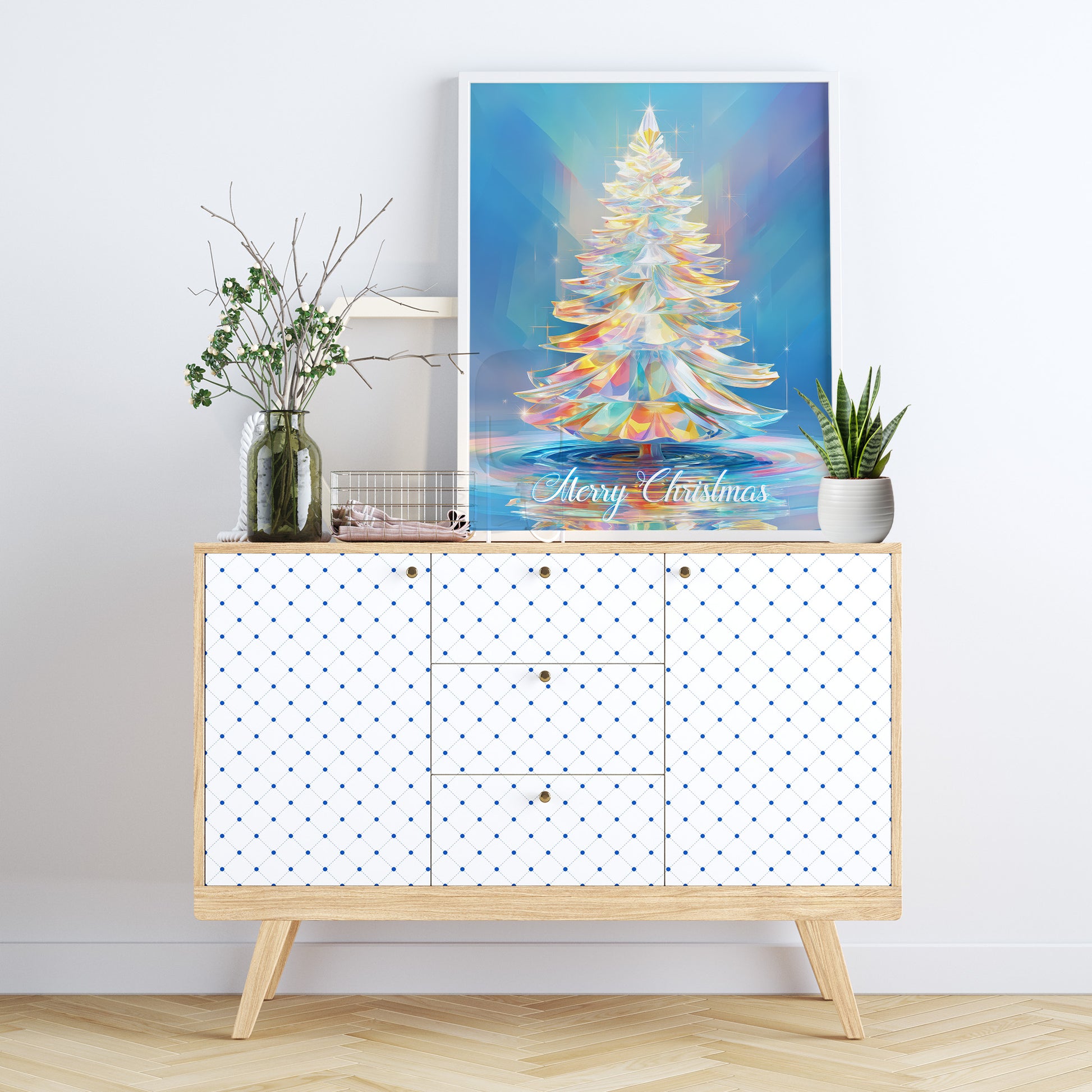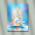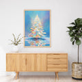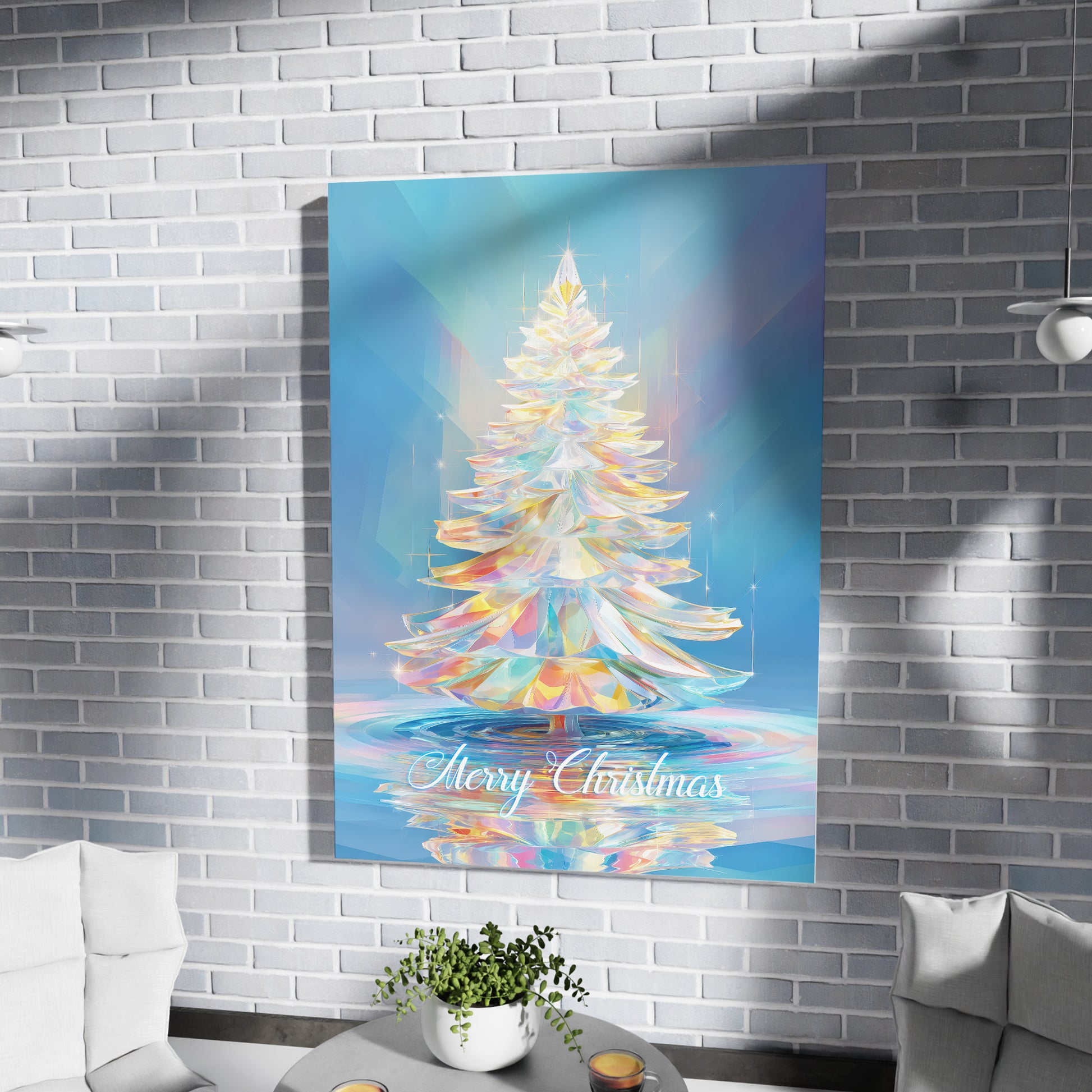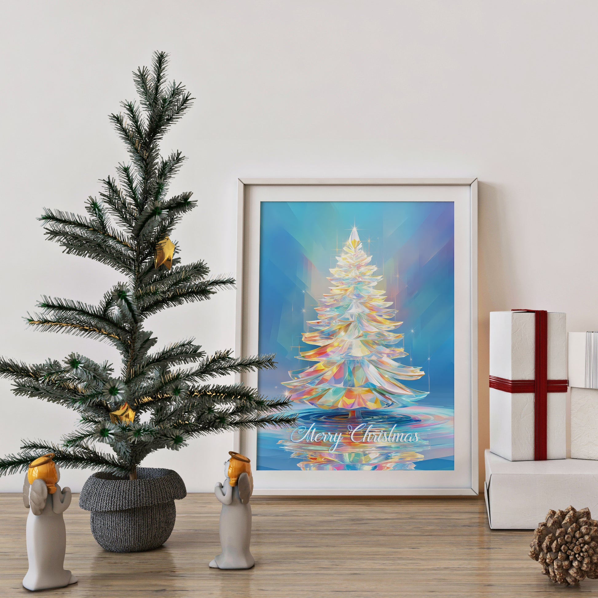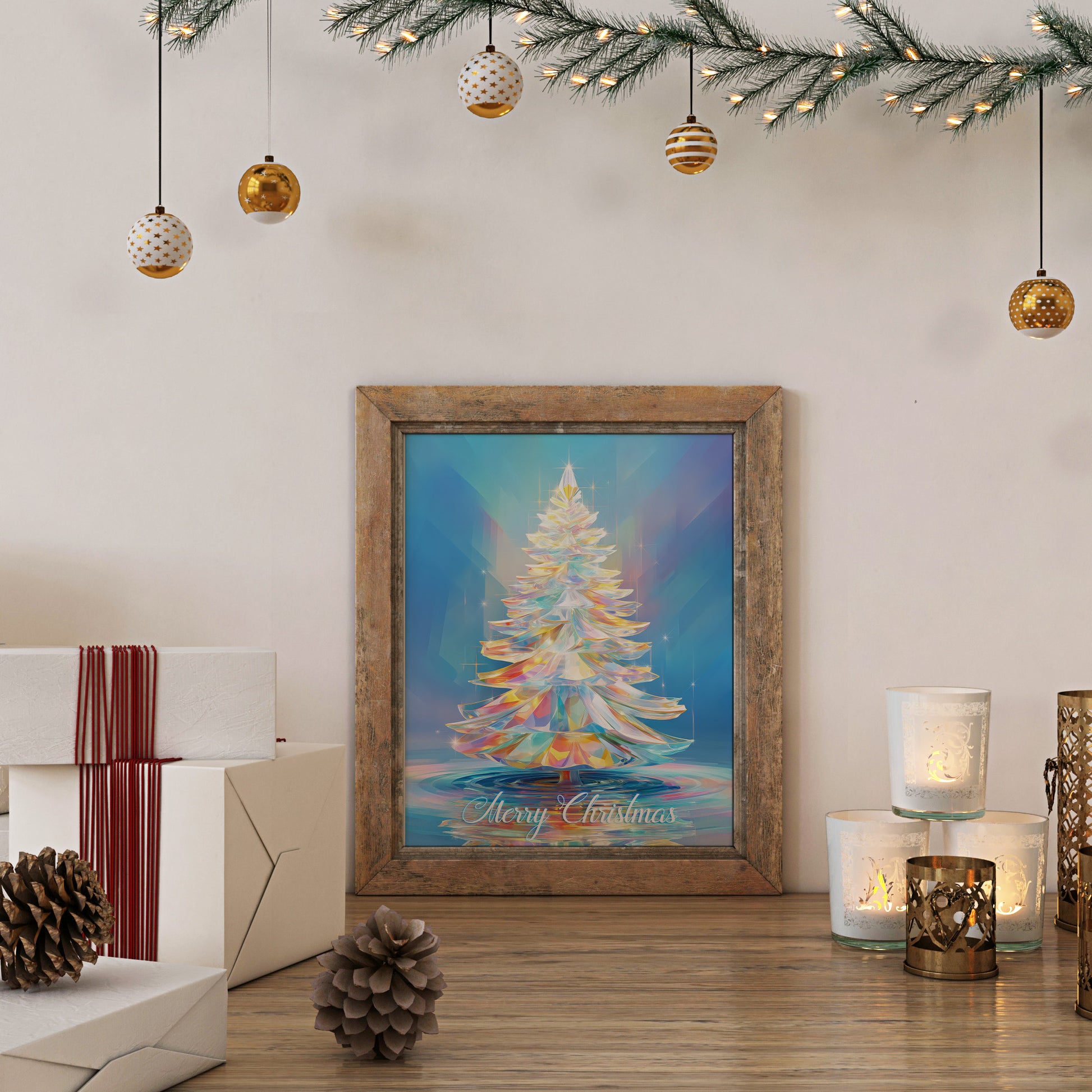 A stunning and highly imaginative abstract digital artwork featuring a Christmas tree conceptualized as a structure made of faceted crystal or glass. The crystal catches the light, reflecting a beautiful array of rainbow pastel colors (pink, yellow, aqua, white) across its layers. The tree stands in a small pool of shimmering water with concentric ripples. The background is a vibrant, radiating light blue/cyan, creating a dramatic, ethereal, and luxurious glow. The phrase "Merry Christmas" is gracefully scripted at the bottom. This piece is perfect for modern, unique holiday decor, luxury Christmas themes, or fantasy art collections.