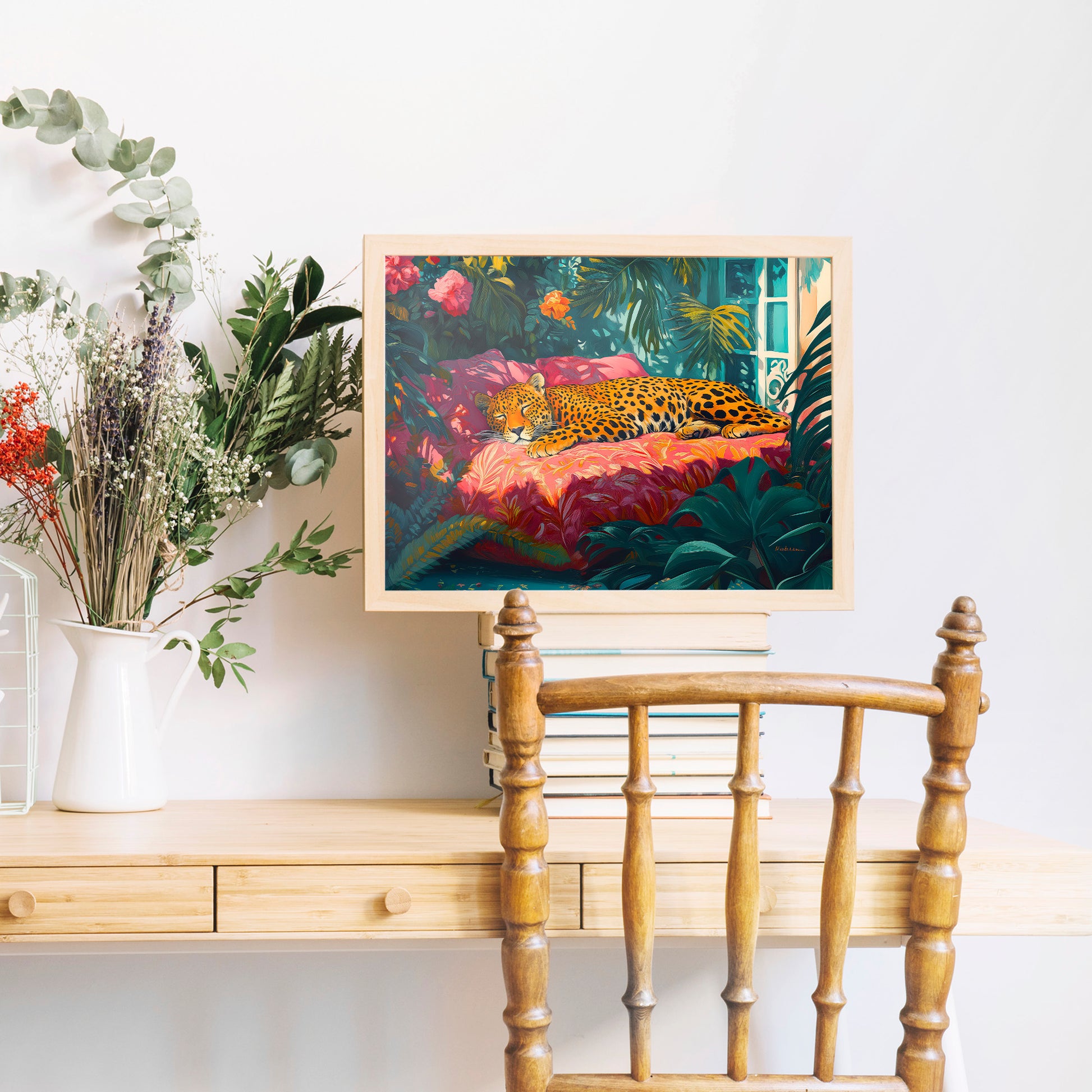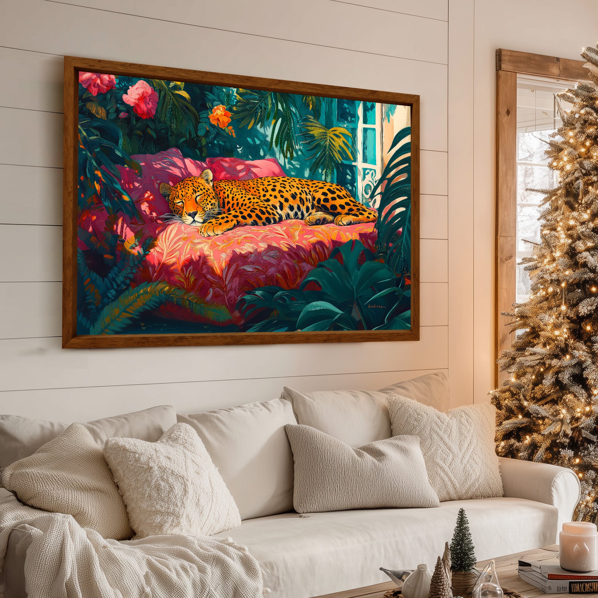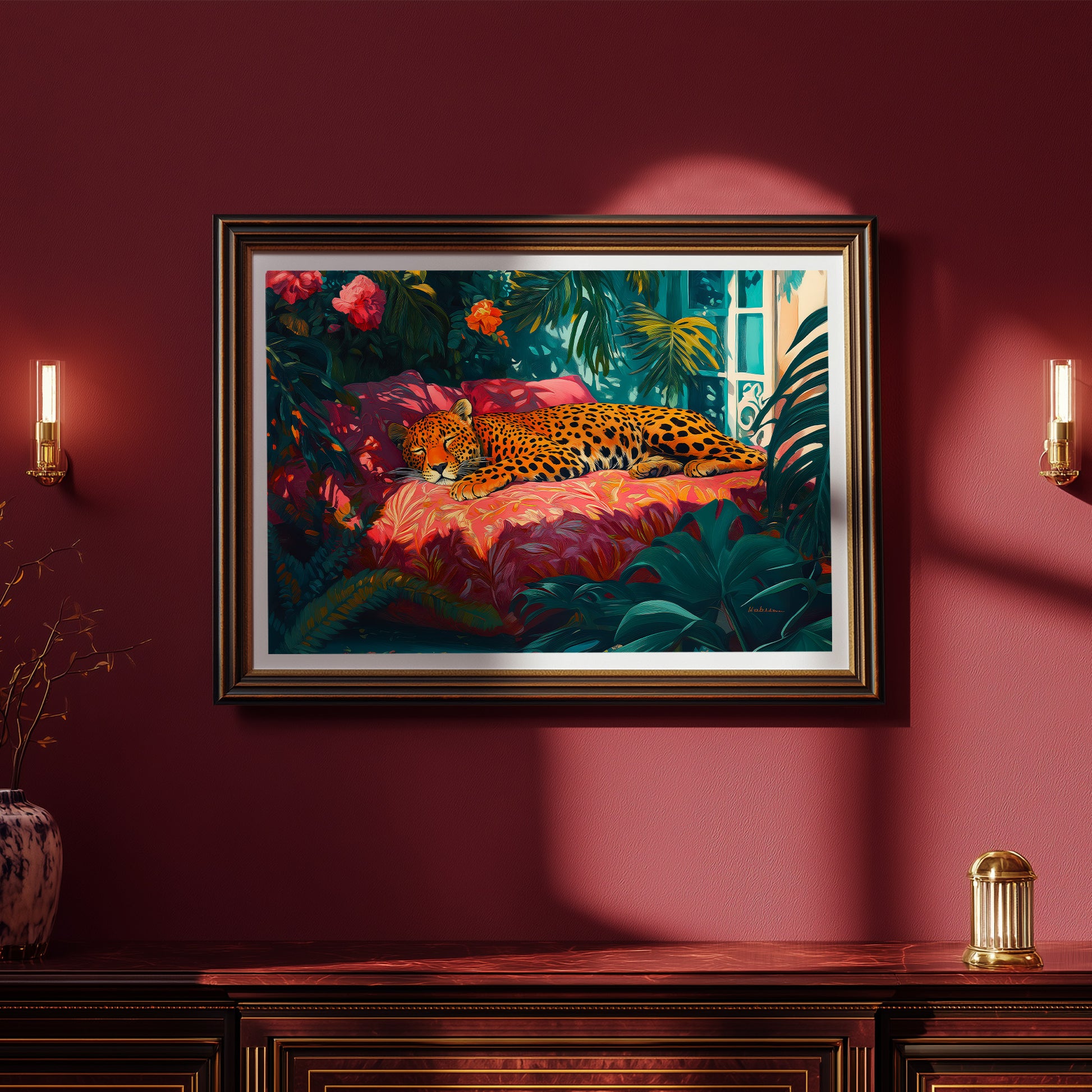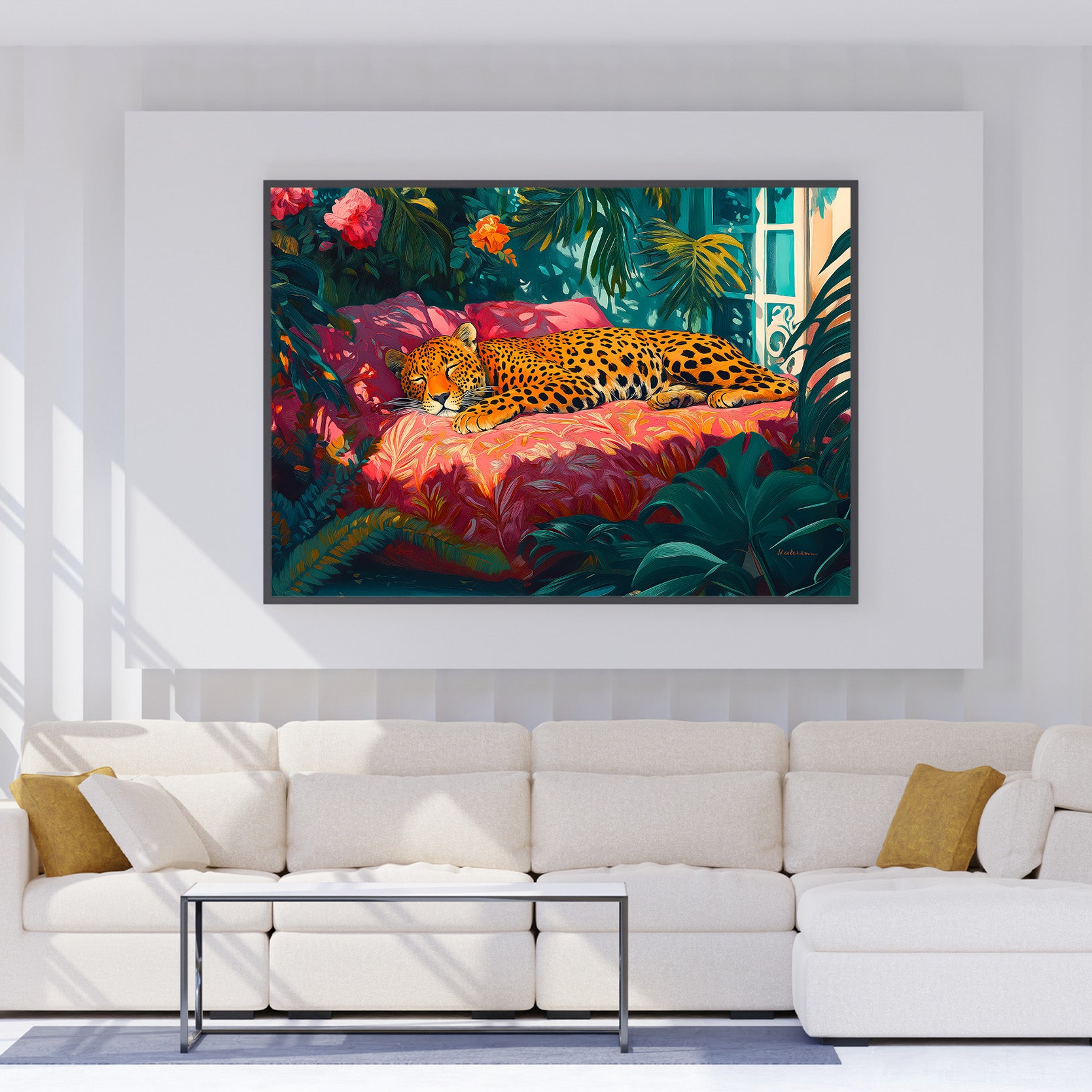 An enchanting and vibrant painting depicting a relaxed leopard (or jaguar) sleeping peacefully on a richly patterned pink daybed. The scene is set in a dense, lush tropical environment, characterized by large, glossy green leaves, vibrant pink and orange exotic flowers, and dappled sunlight. The background features a cool, shaded interior space seen through a window, providing depth and contrast. The artwork uses intense colors and high detail to convey a sense of exotic luxury, warmth, and tranquility, blending wildlife art with interior decor elements in a stunning, opulent composition.