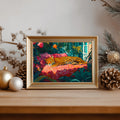 Lush Tropical Paradise Painting With Leopard Sleeping On A Pink Floral Daybed Surrounded By Exotic Foliage And Flowers