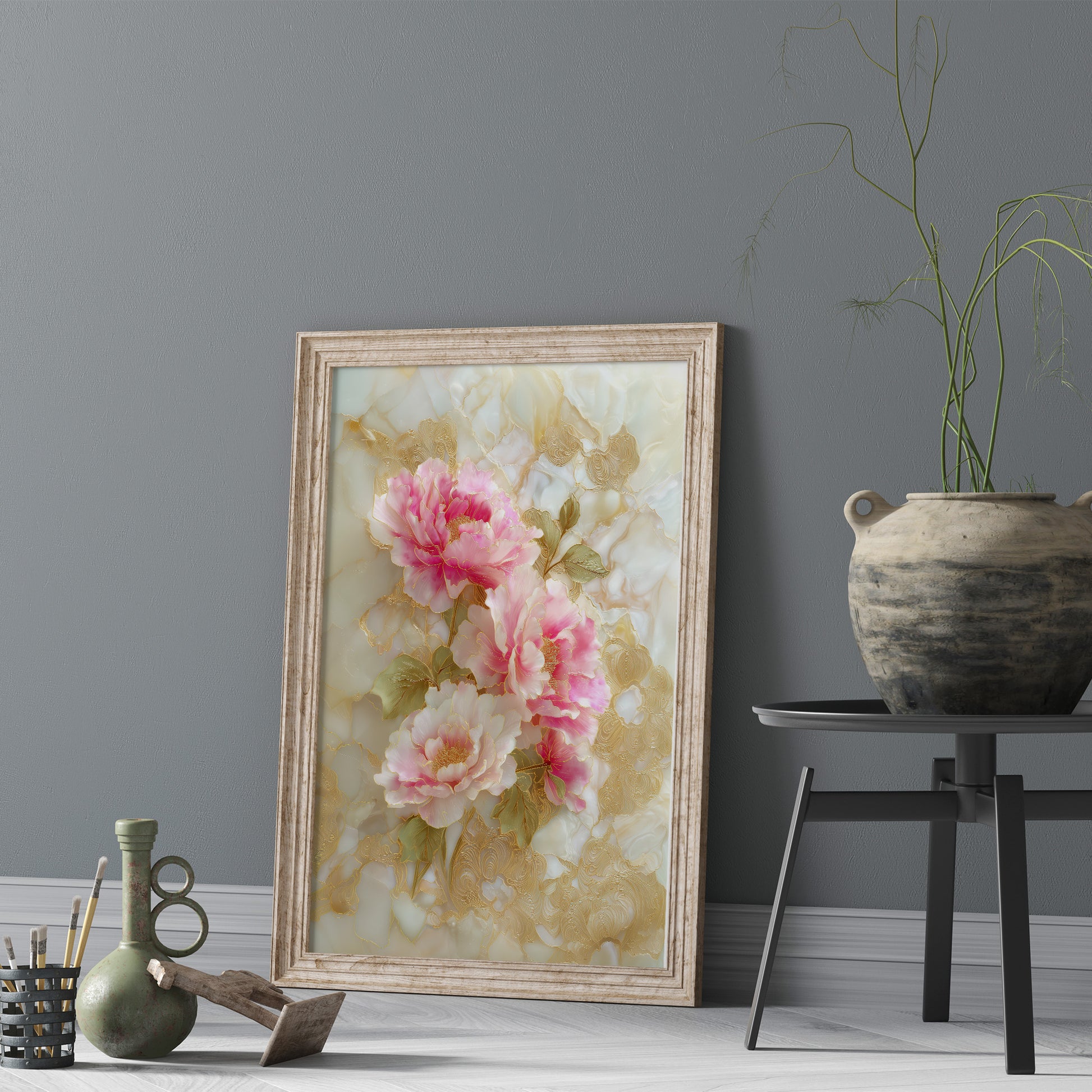 A breathtaking and sophisticated digital oil painting featuring lush pink and white peonies in full bloom. The flowers are delicately rendered with golden outlines, set against a luxurious beige marble background with swirling golden filigree patterns. This exquisite artwork combines classical floral elegance with a modern luxury aesthetic, making it an ideal focal point for a formal living room, a master bedroom, or a high-end spa. It exudes a sense of prosperity, grace, and timeless beauty that elevates any interior design.