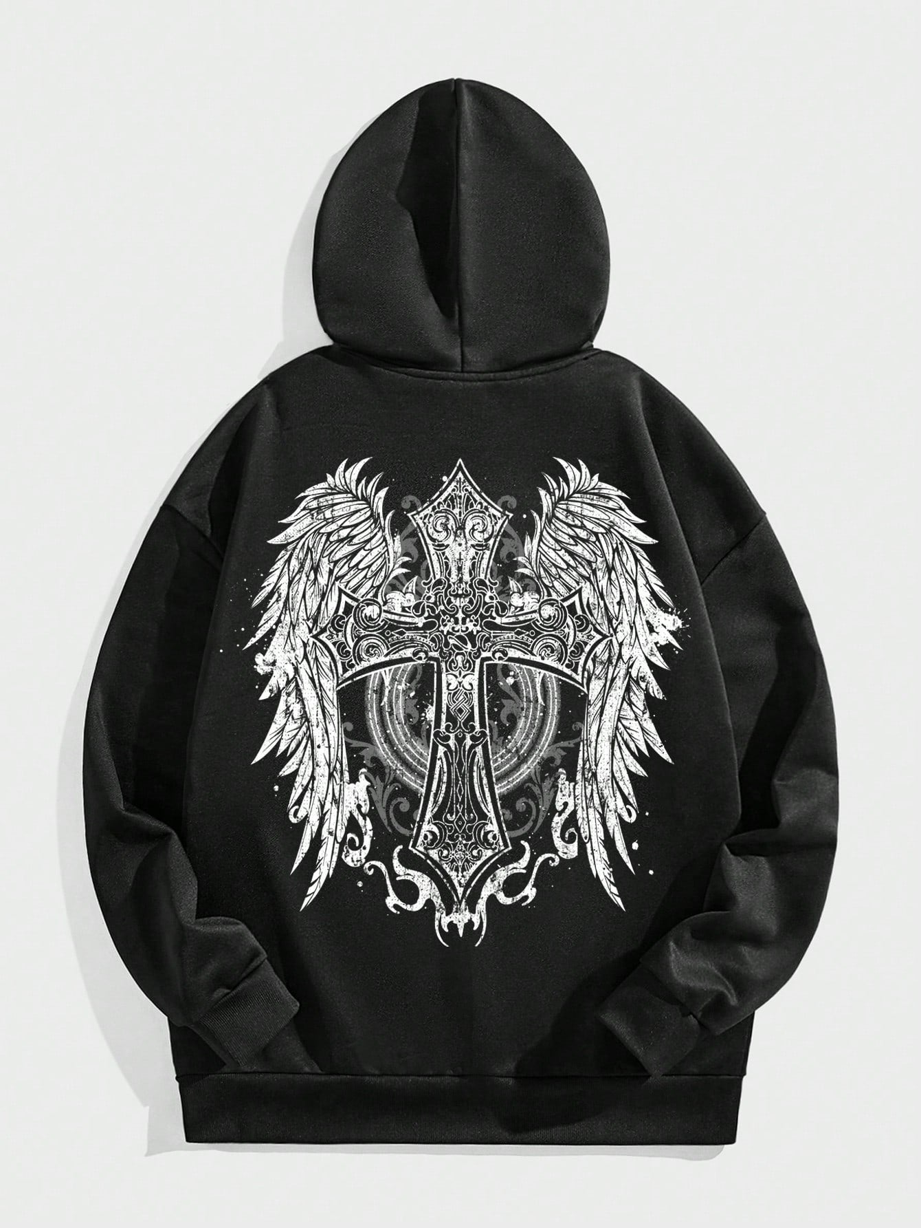 Introducing the ultimate street style hoodie for men. The black sweatshirt features a vintage gothic angel wings and cross design, perfect for adding a touch of edginess to your wardrobe. Made with quality materials, this hoodie provides both style and comfort.
