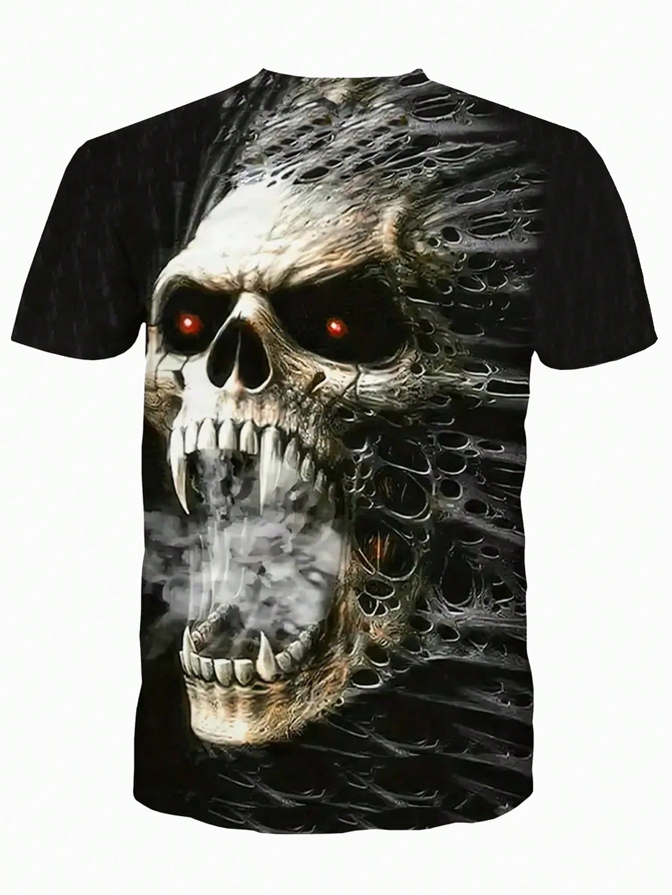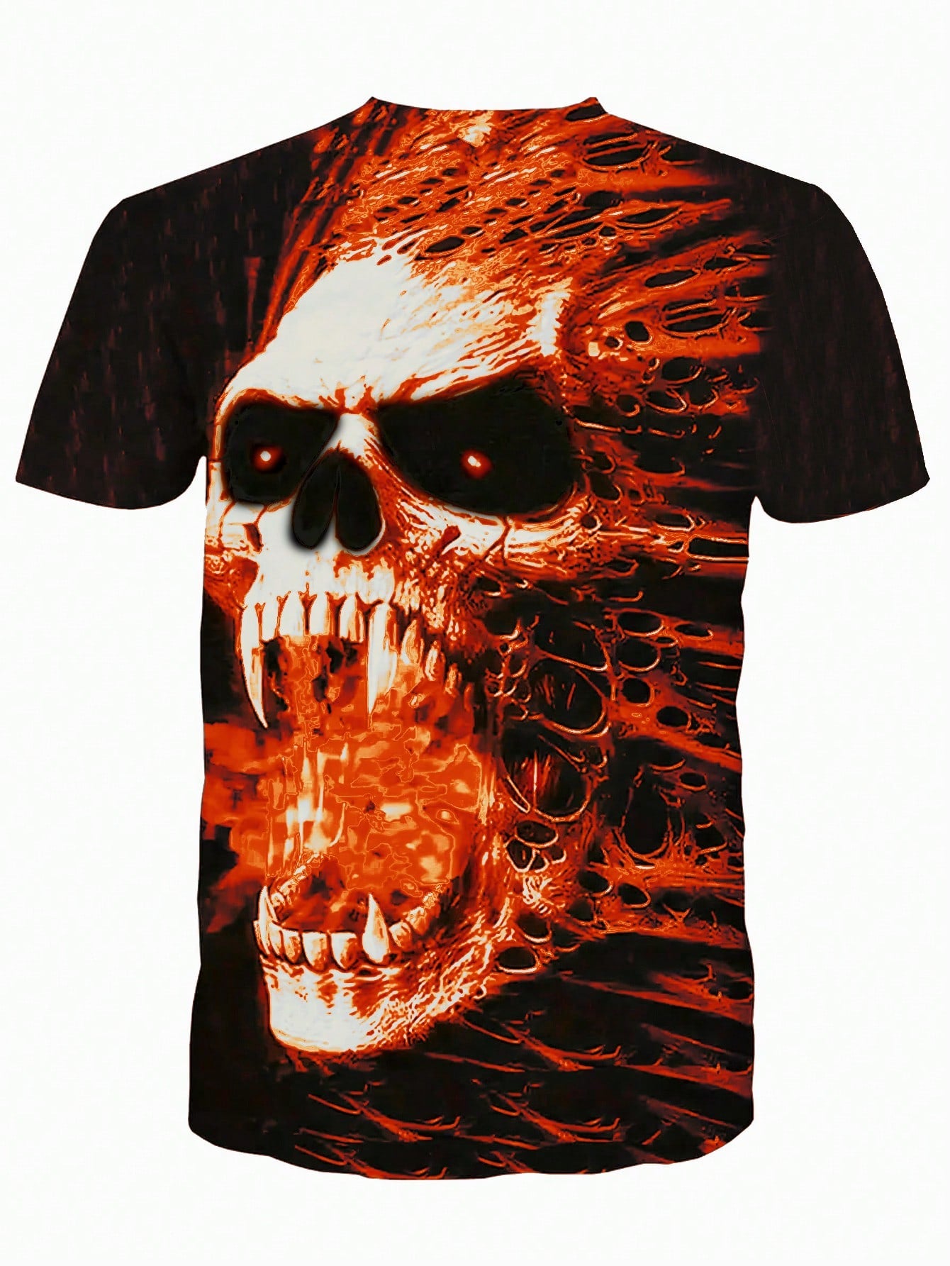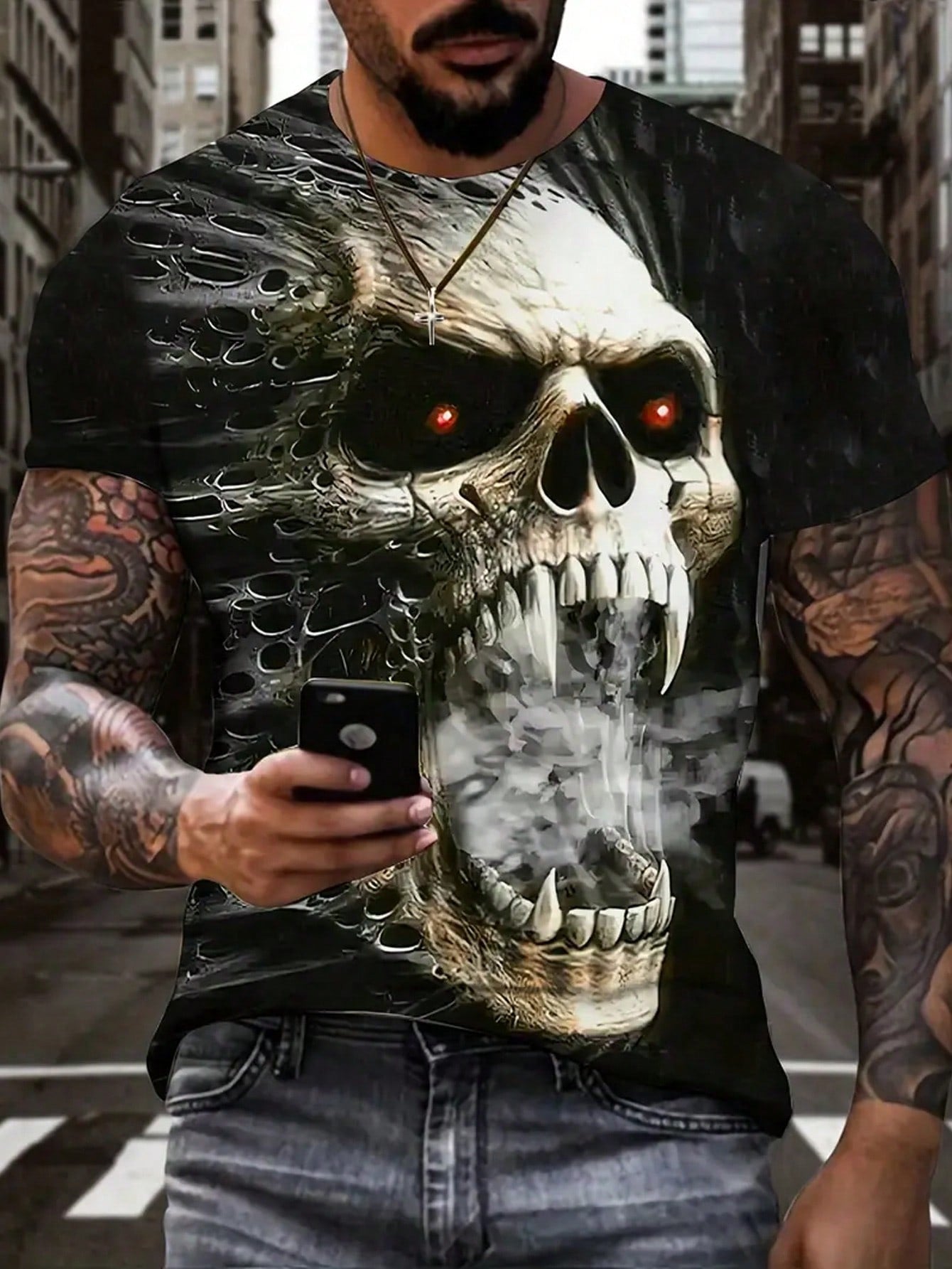 Introducing the Men's Bold Skull Head Print Summer Tshirt. With a striking skull head design, this tshirt is perfect for adding a bold and edgy touch to your summer wardrobe. Made with high-quality fabric, it's not only stylish but also comfortable to wear. Elevate your style game with this must-have tshirt.