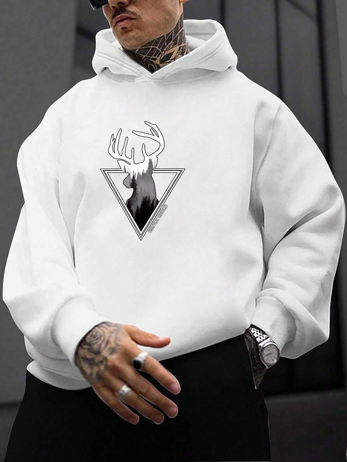 Men's Deer Graphis Print Thermal-Lined Drop Shoulder Hoodie