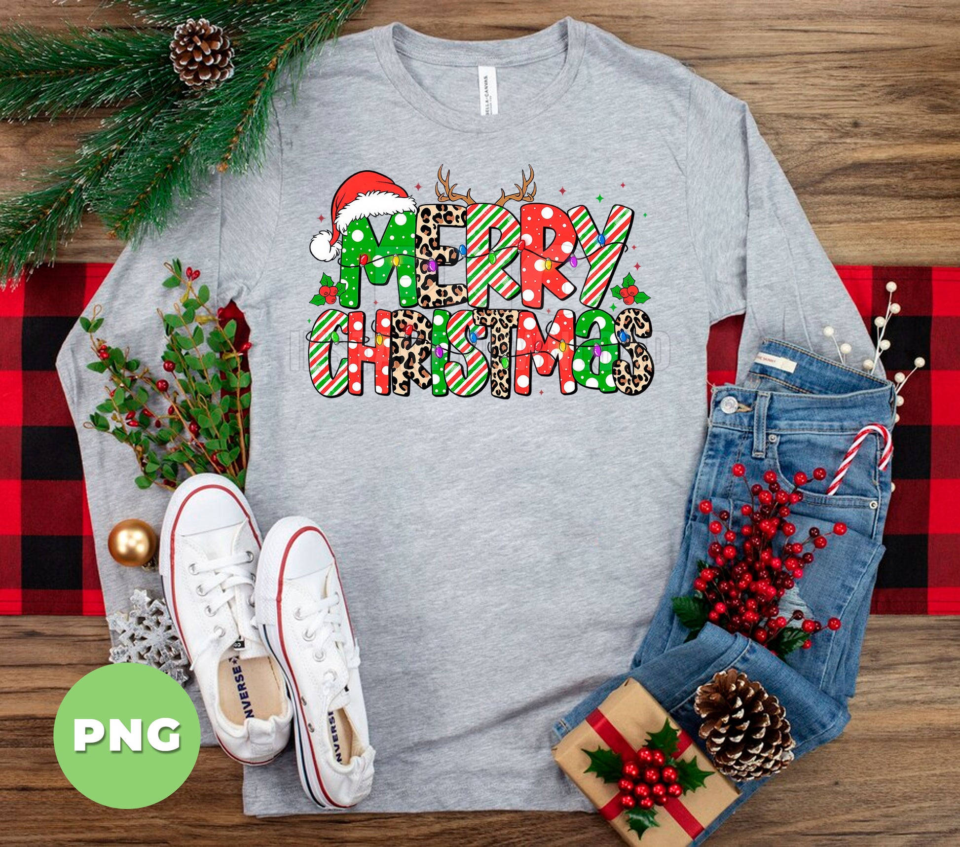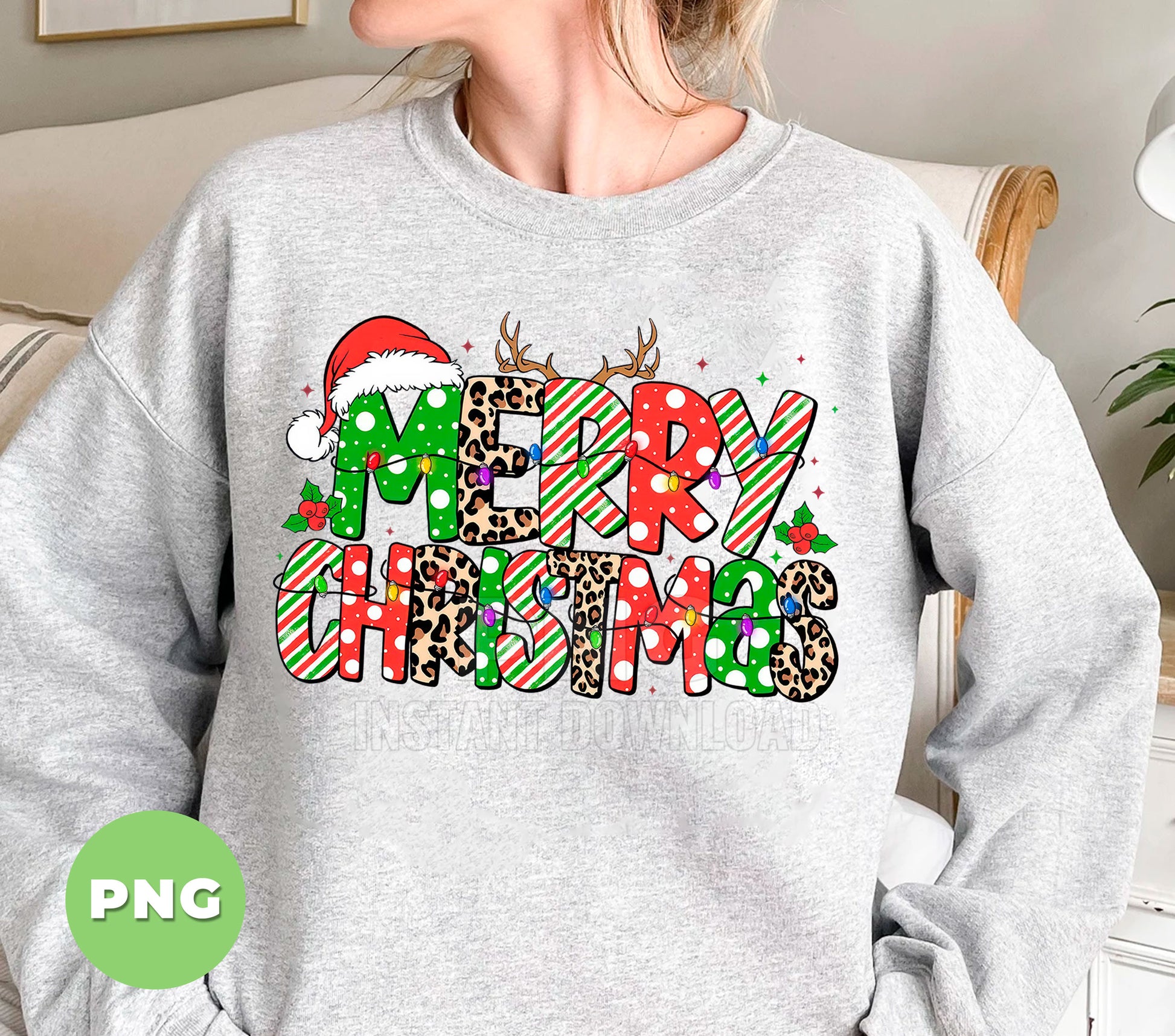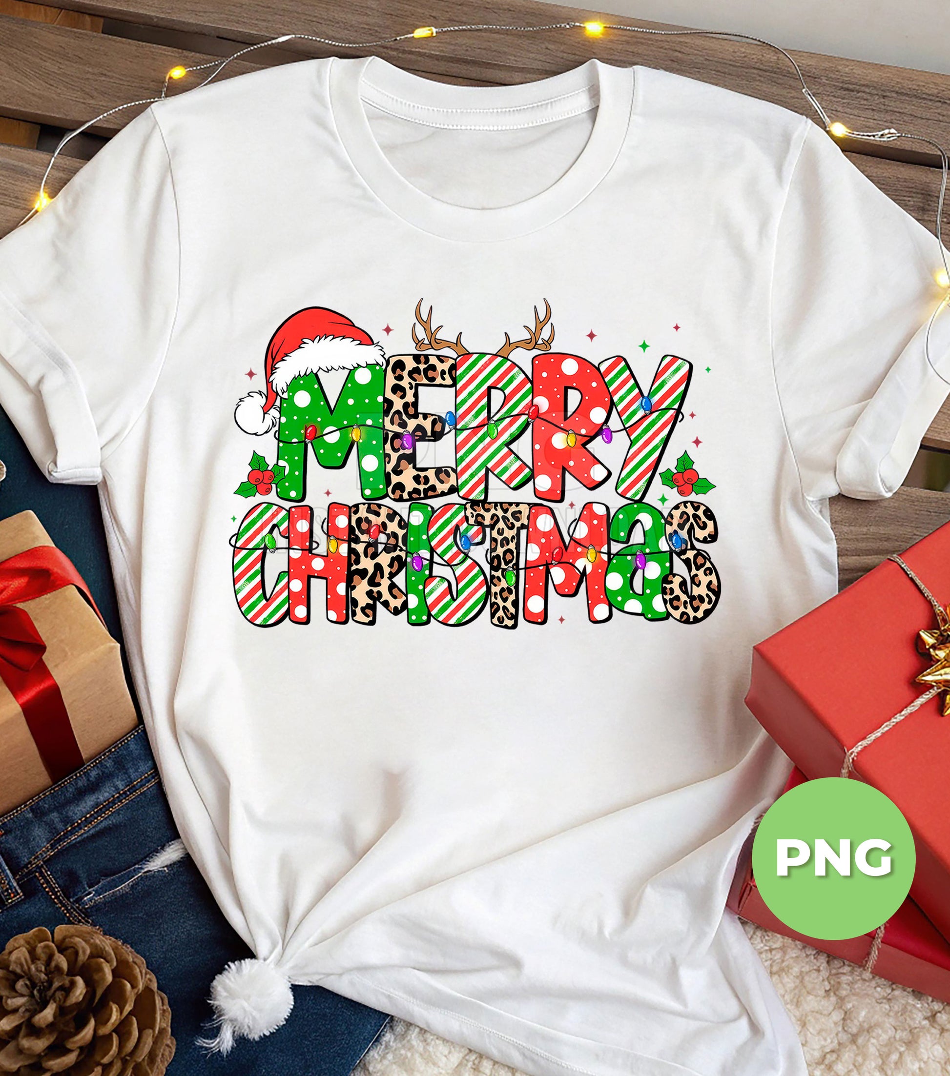 Merry Christmas, Leopard Print Christmas Lights Sublimation, Santa Hat Reindeer Holiday Clipart, Cute Xmas Digital Download, Festive Winter